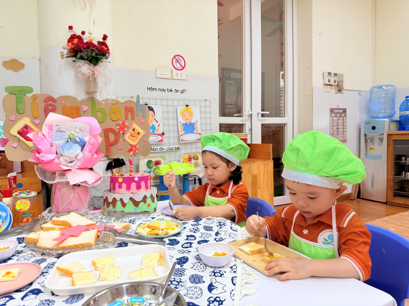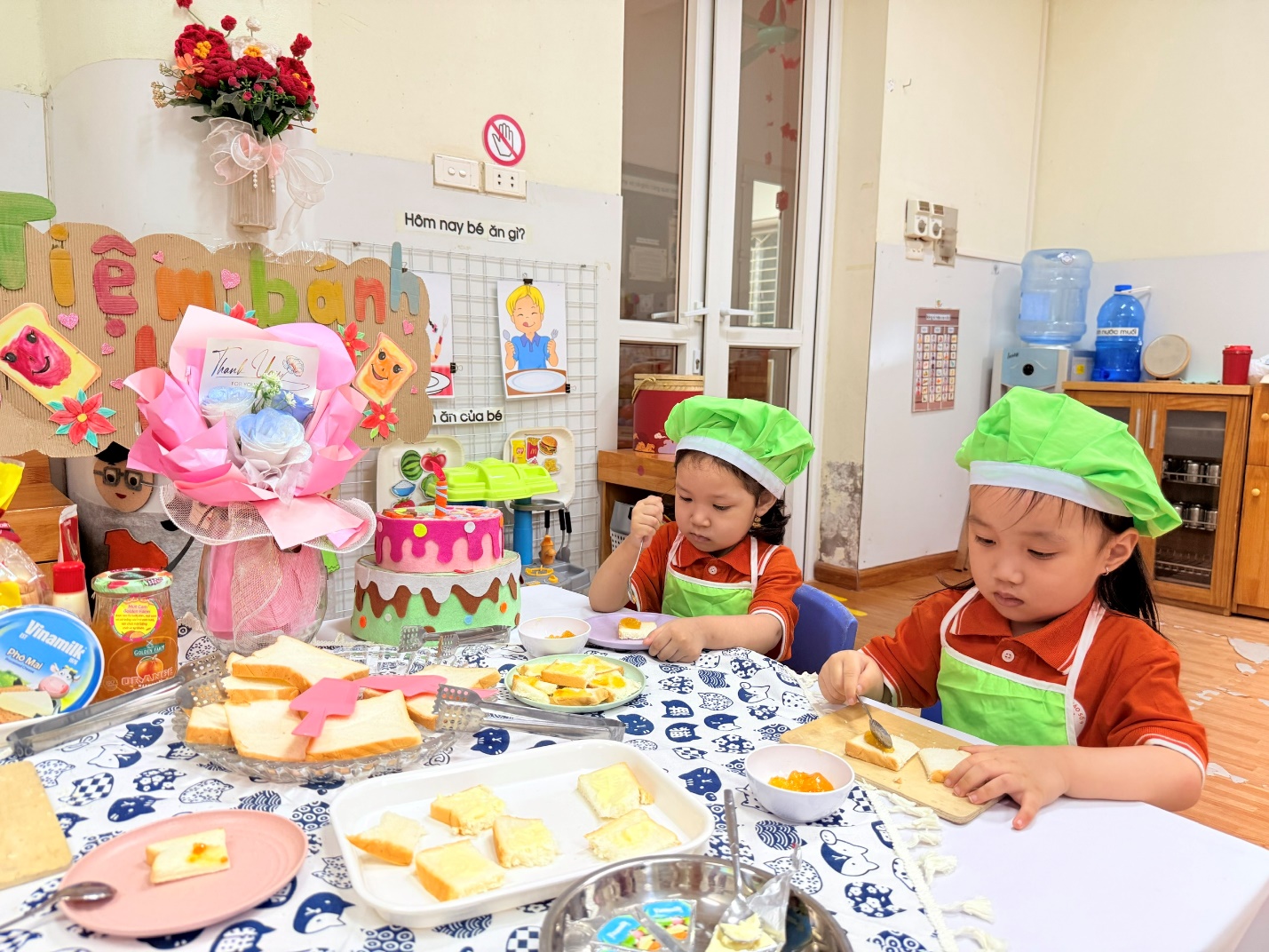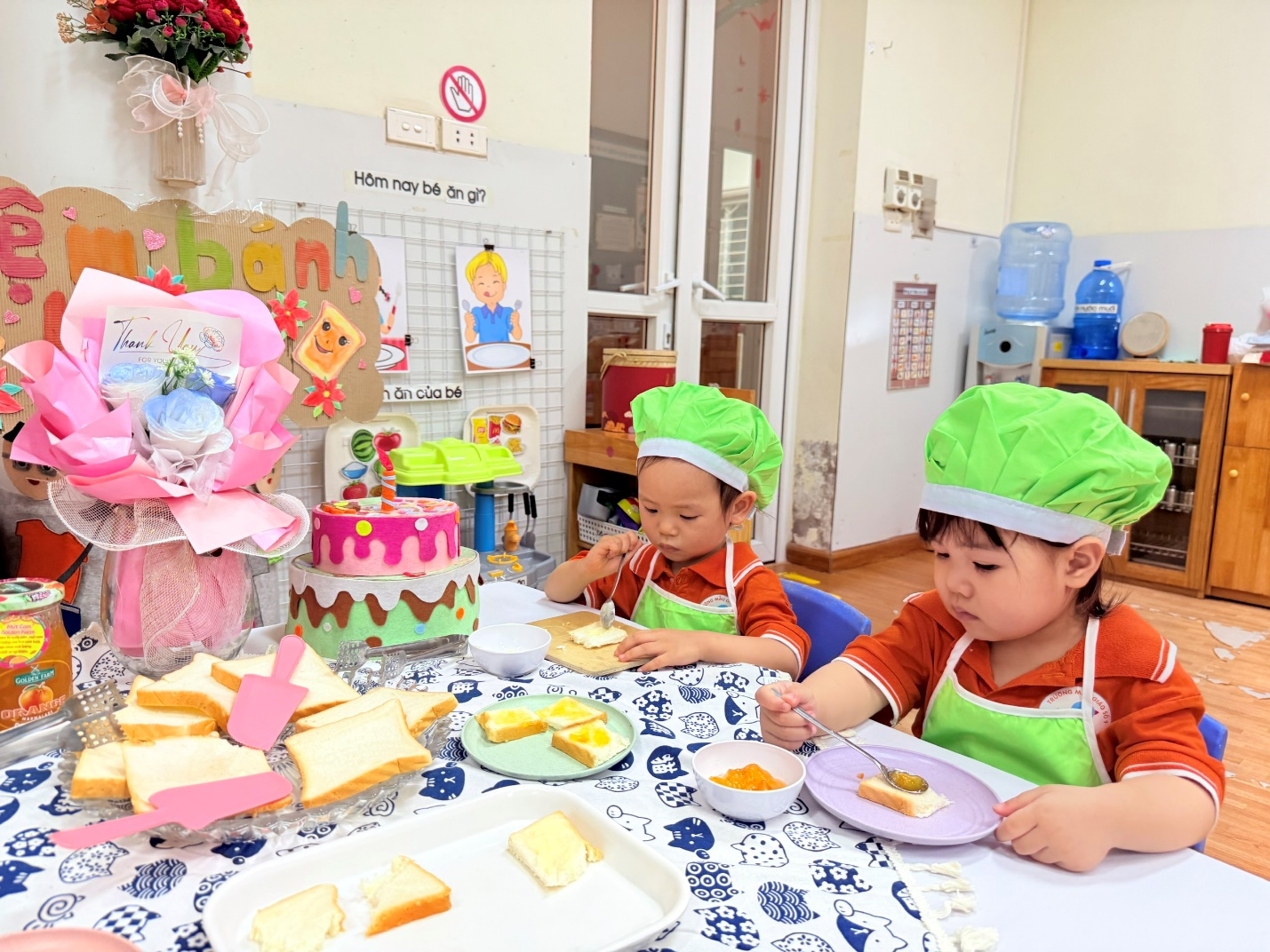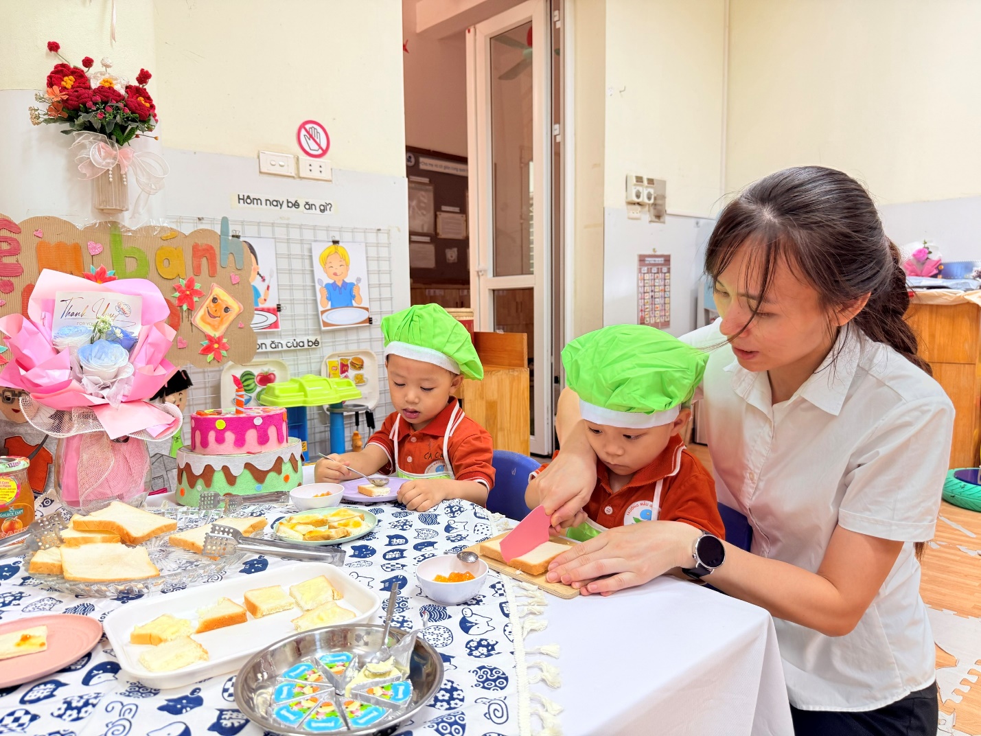 Không chỉ dừng lại ở việc các con được lựa chọn nguyên liệu chất lượng , qua hoạt động các con còn được : Thao tác cầm dao nhựa cắt bánh, dùng thìa phết bơ, mứt cam…giúp đôi tay thêm khéo léo.