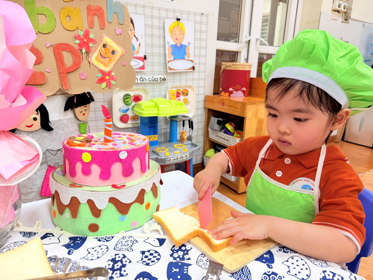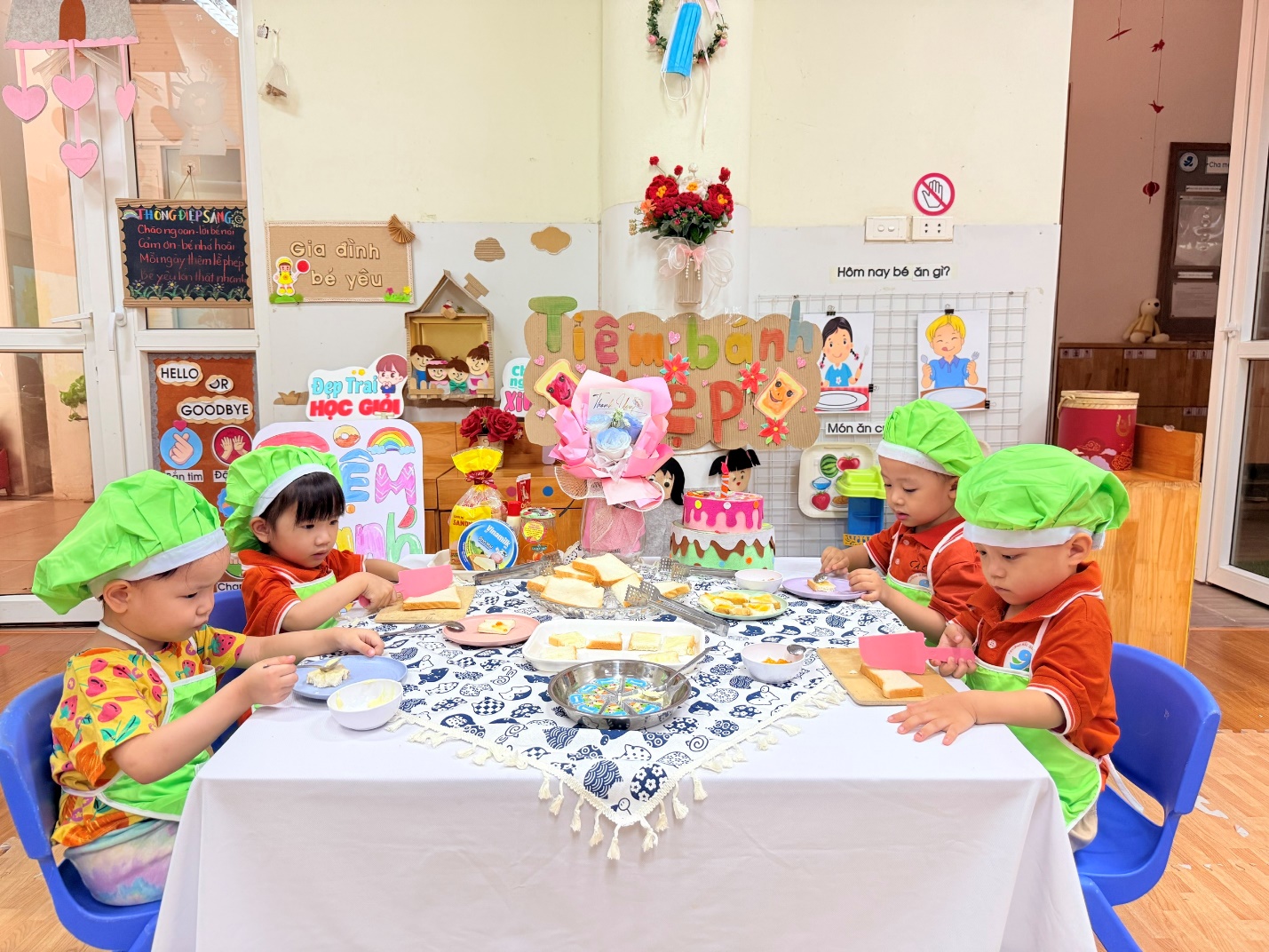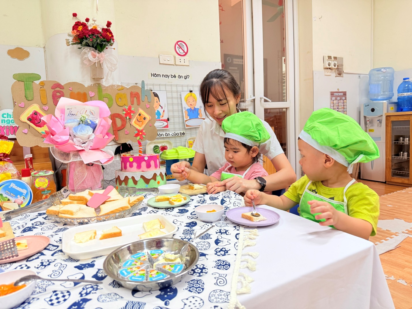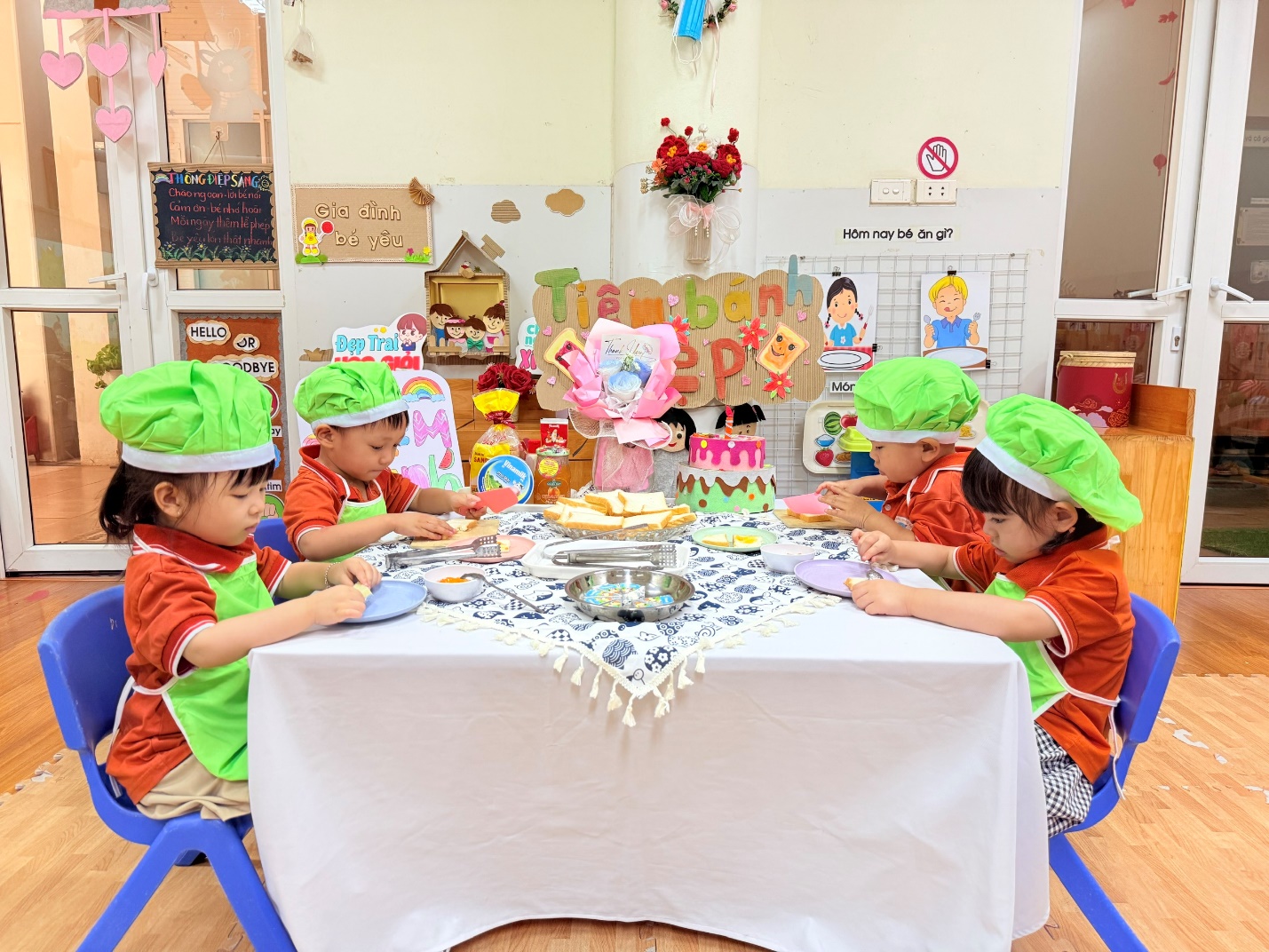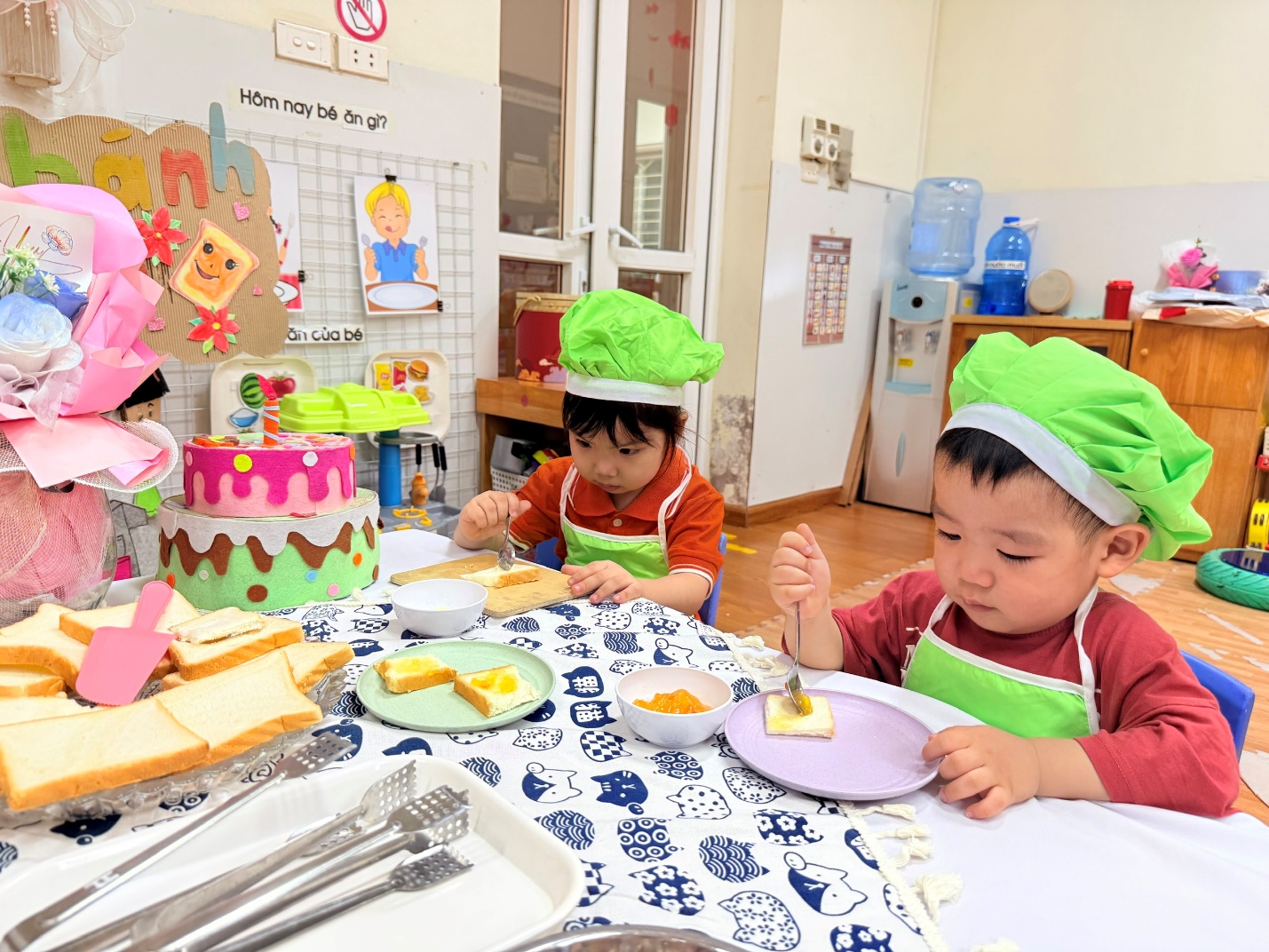 Không chỉ dừng lại ở việc các con được lựa chọn nguyên liệu chất lượng , qua hoạt động các con còn được : Thao tác cầm dao nhựa cắt bánh, dùng thìa phết bơ, mứt cam…giúp đôi tay thêm khéo léo.