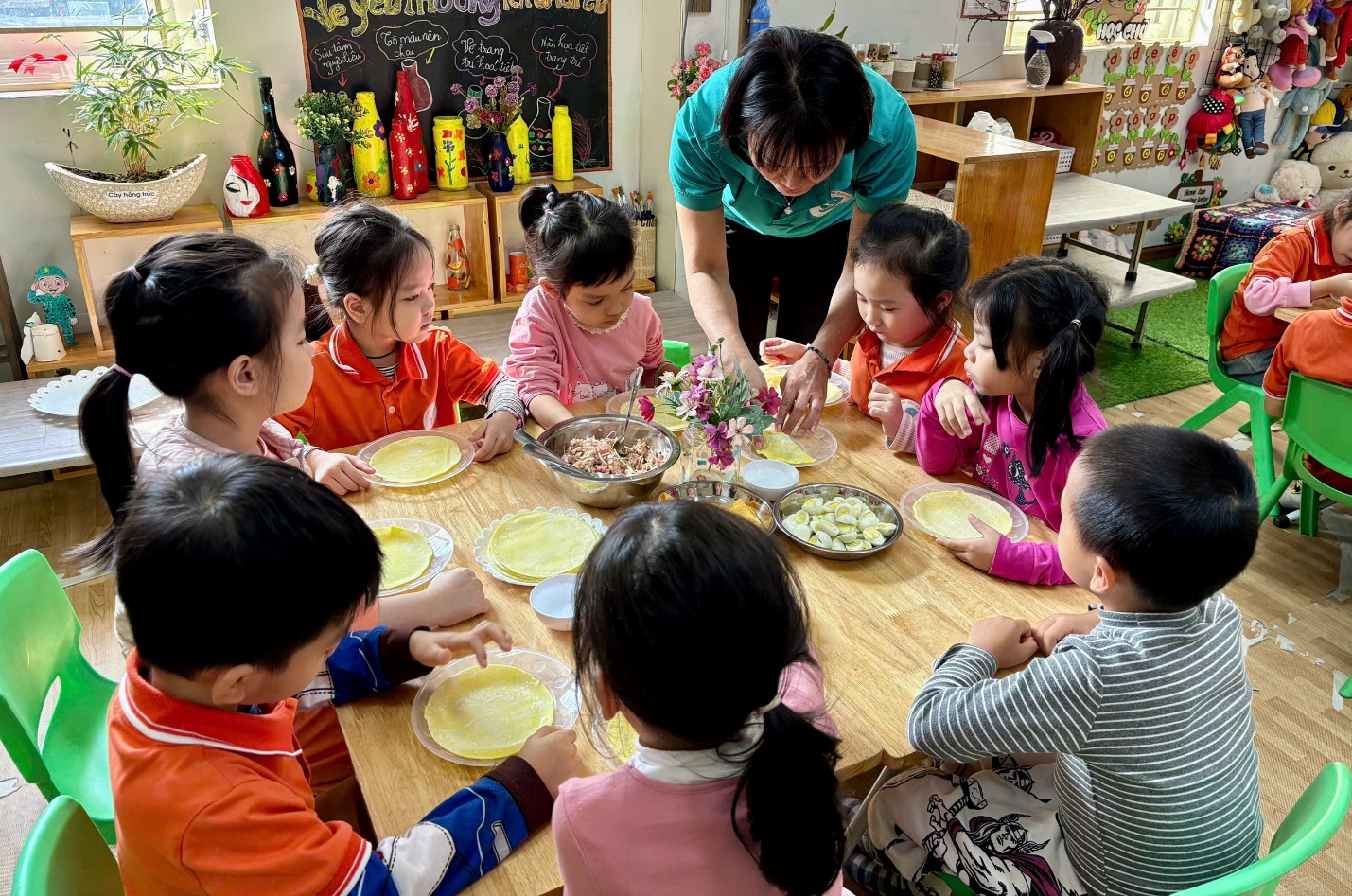 Hoạt động làm bánh gối không chỉ giúp các bé rèn kỹ năng vận động tinh, tăng khả năng phối hợp tay – mắt, mà còn khơi gợi tình yêu với những món ăn truyền thống của quê hương. Đồng thời, đây còn là dịp để trẻ mạnh dạn thể hiện bản thân, hợp tác nhóm và thực hành các kỹ năng sống đơn giản nhưng thiết thực.
