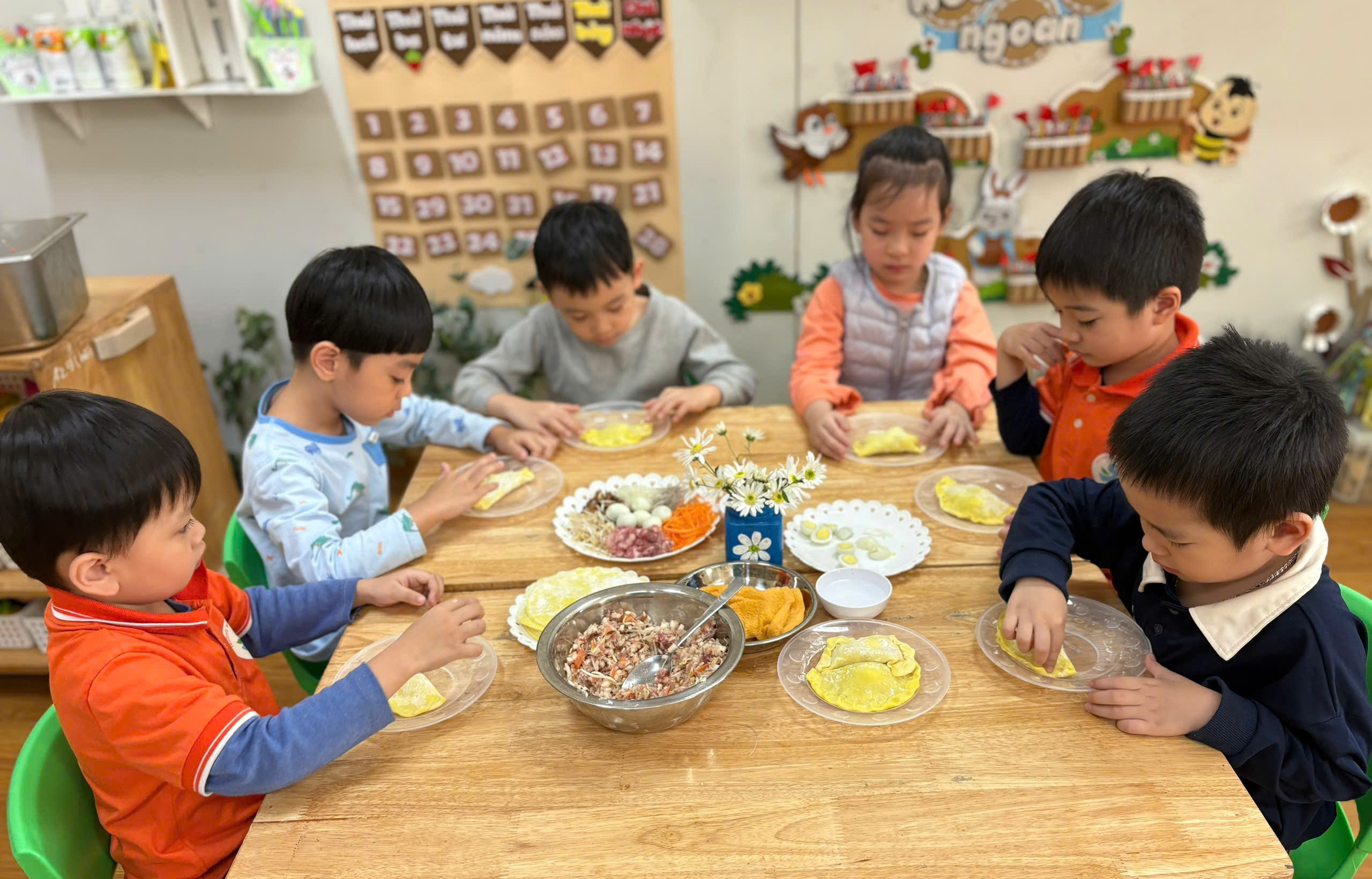Dưới sự hướng dẫn của cô giáo, các bé lần lượt trải miếng vỏ bánh, xúc nhân, gấp mép và tạo hình. Dù đôi bàn tay nhỏ bé còn hơi vụng về nhưng chiếc bánh nào cũng đầy ắp sự cố gắng và tỉ mỉ