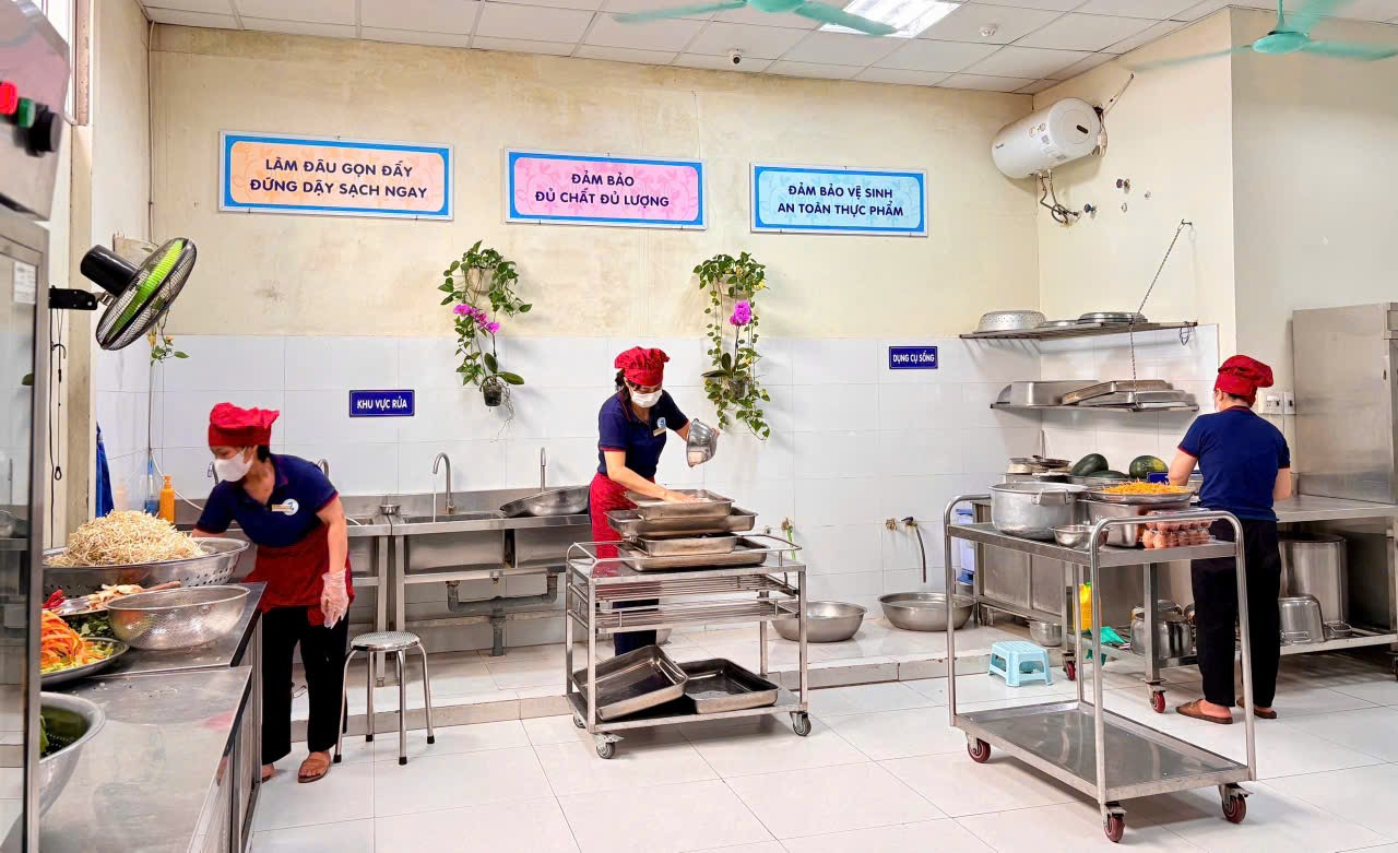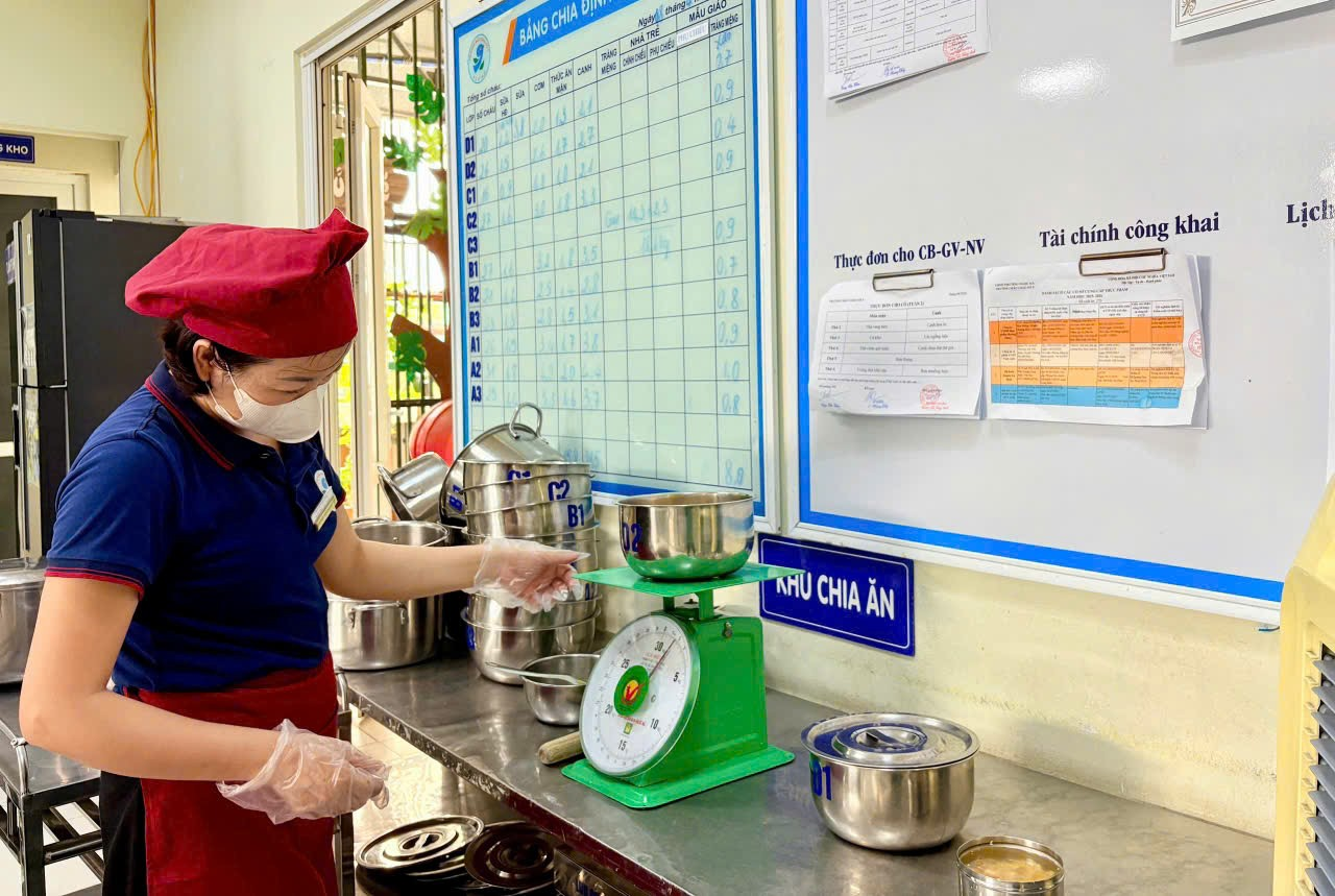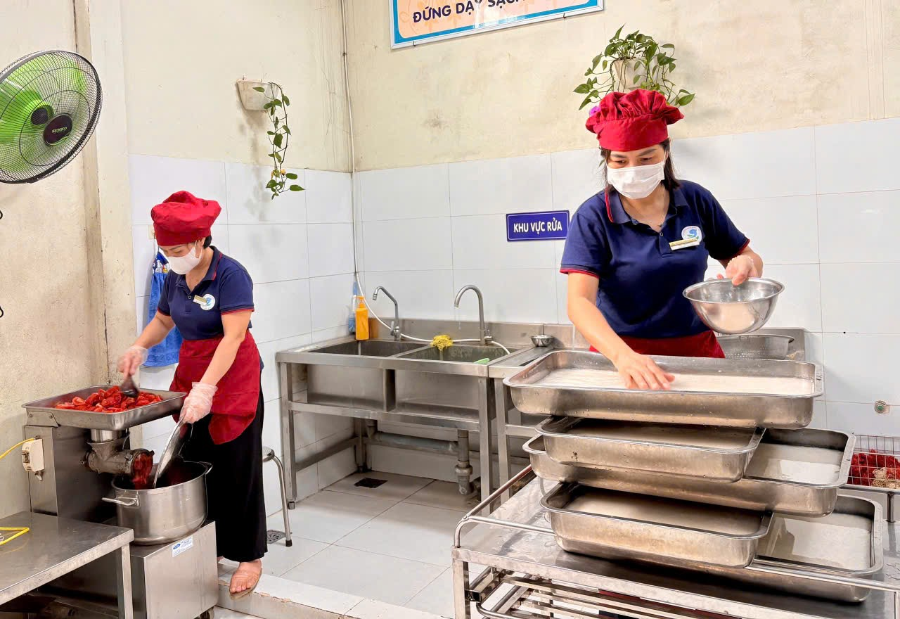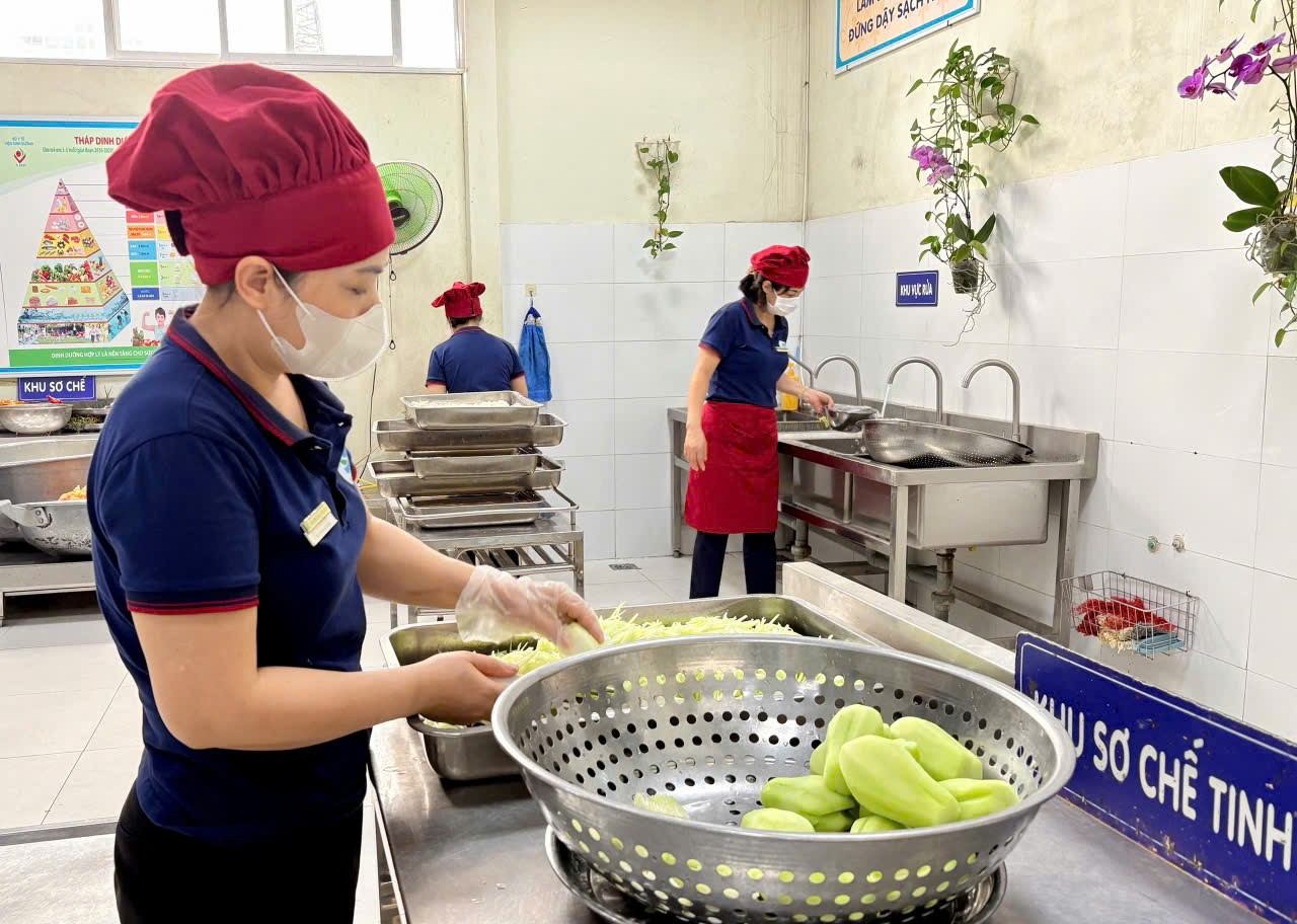 Toàn bộ quá trình từ tiếp nhận, sơ chế đến chế biến đều được thực hiện theo quy trình một chiều, đảm bảo vệ sinh an toàn thực phẩm. Đội ngũ nhân viên nuôi dưỡng luôn tuân thủ nghiêm các quy định về vệ sinh cá nhân, trang phục và quy trình chế biến, góp phần mang đến những bữa ăn an toàn, chất lượng cho trẻ.
