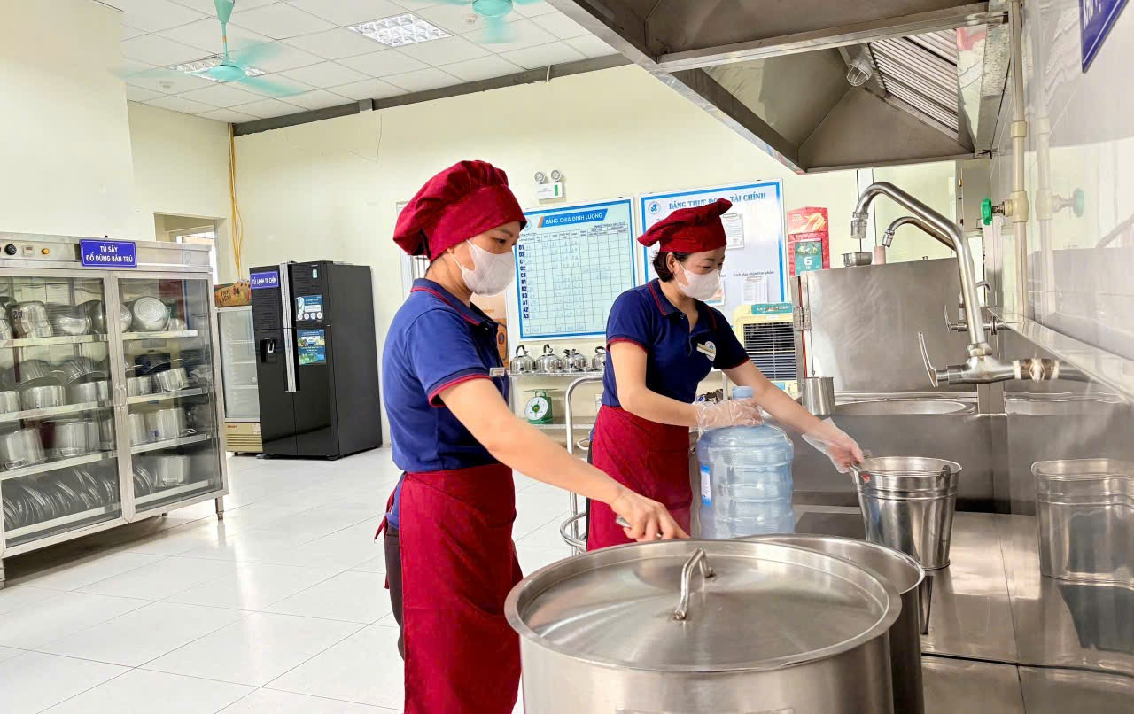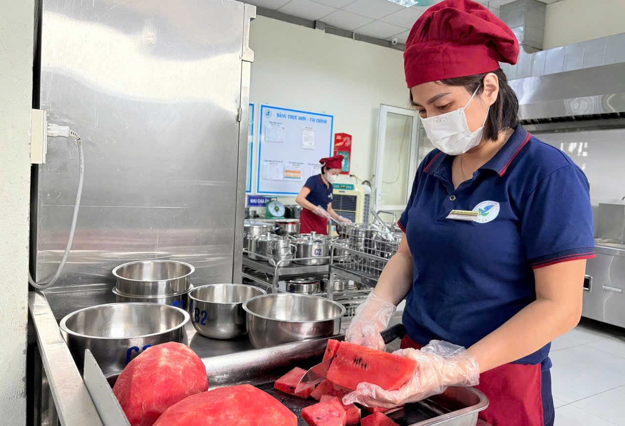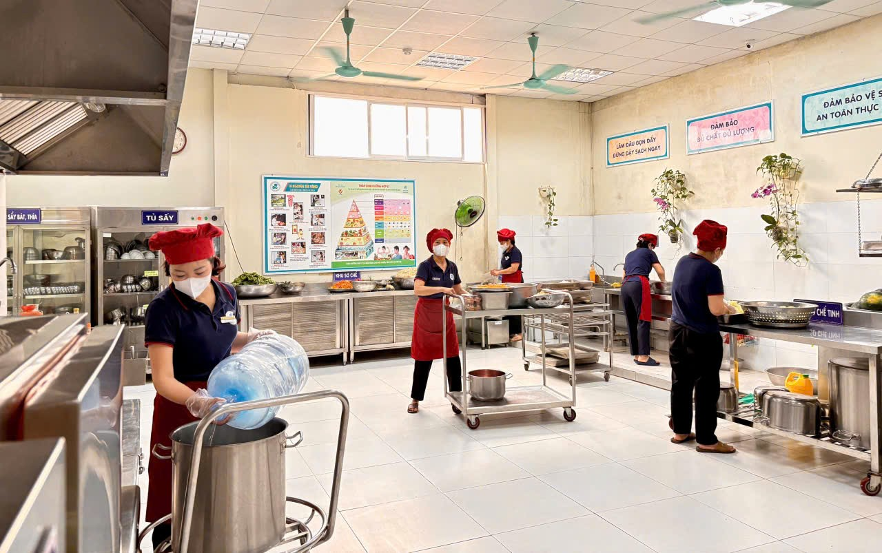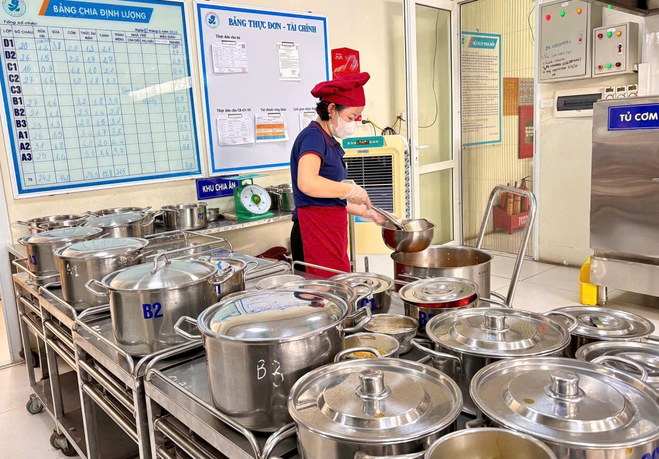Toàn bộ quá trình từ tiếp nhận, sơ chế đến chế biến đều được thực hiện theo quy trình một chiều, đảm bảo vệ sinh an toàn thực phẩm. Đội ngũ nhân viên nuôi dưỡng luôn tuân thủ nghiêm các quy định về vệ sinh cá nhân, trang phục và quy trình chế biến, góp phần mang đến những bữa ăn an toàn, chất lượng cho trẻ.