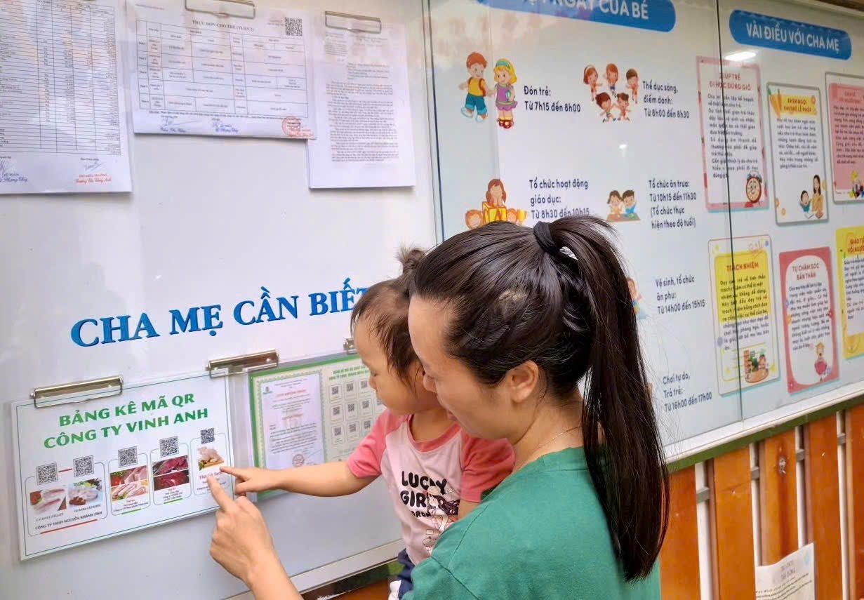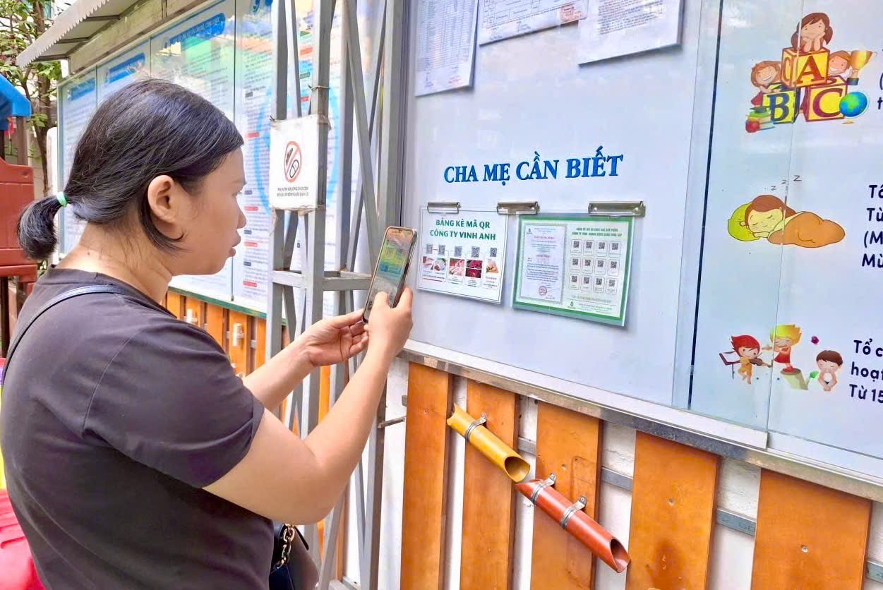 Hằng ngày, quy trình giao nhận thực phẩm được thực hiện nghiêm túc với sự tham gia giám sát của giáo viên và phụ huynh. Thực phẩm khi nhập vào trường đều được kiểm tra kỹ lưỡng về chất lượng, số lượng và nguồn gốc. Đặc biệt, phụ huynh có thể trực tiếp quét mã QR trên bao bì của thực phẩm để kiểm tra thông tin xuất xứ, đơn vị cung cấp, giúp tăng cường tính công khai và minh bạch trong từng bữa ăn của trẻ.