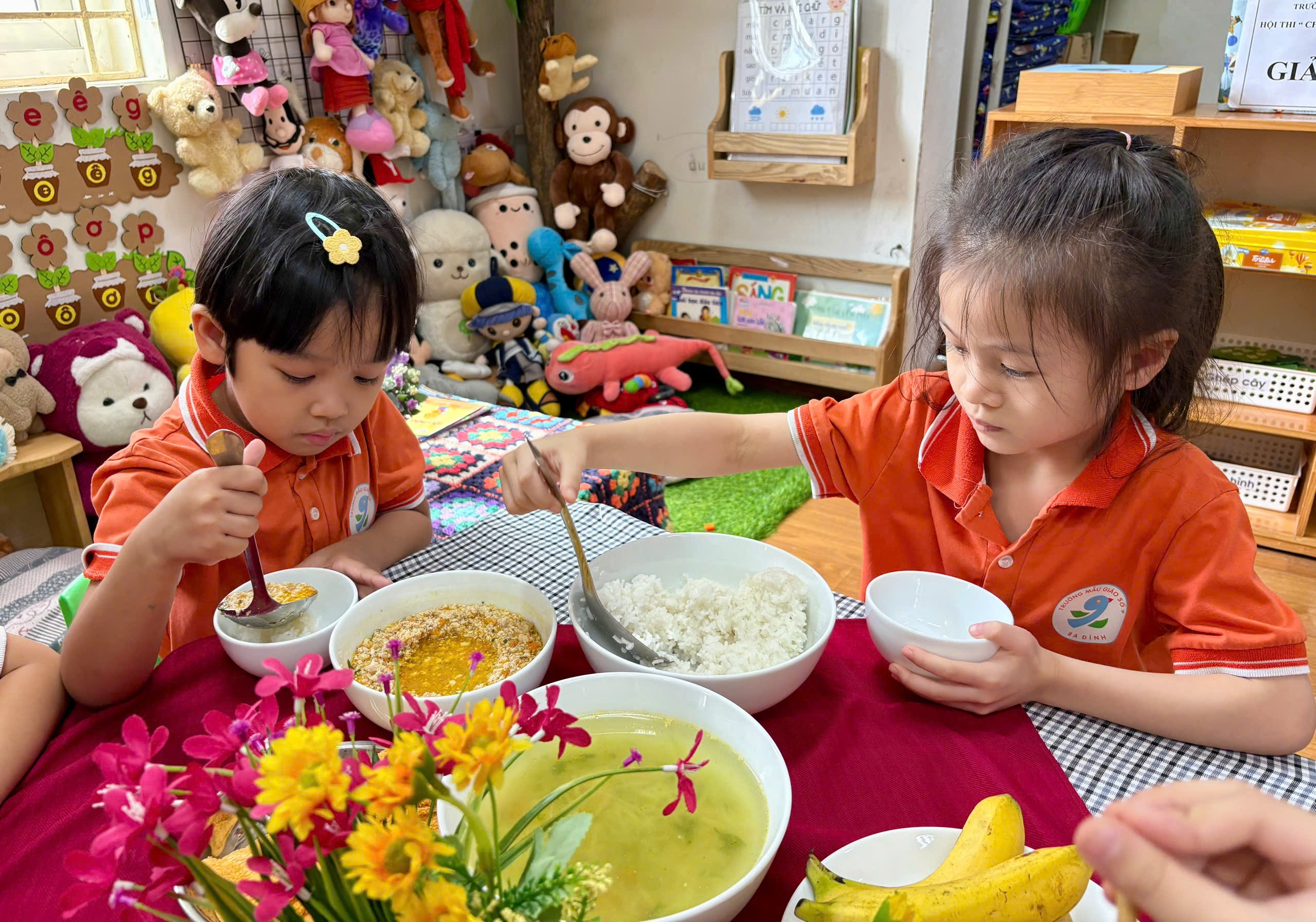 Thông qua bữa ăn gia đình, trẻ học được những kĩ năng sống cần thiết như sự chủ động trong việc chọn món ăn phù hợp với sở thích và sức khỏe của mình, nề nếp văn hóa của người Việt Nam trong bàn ăn qua cách sử dụng thành thạo các dụng cụ ăn uống hay tính tự lập qua việc tự phục vụ bản thân. Biết được các hành vi văn minh trong ăn uống như: Không giành ăn với bạn, không gắp, múc đồ ăn sang bát bạn, tự lấy cơm, lấy thức ăn, ăn hết suất, khi hắt hơi phải lấy tay che miệng hay quay ra ngoài... tạo cho trẻ thói quen, giáo dục cho trẻ biết tự phục vụ, chăm sóc sức khỏe, vệ sinh cá nhân, thể hiện qua những hành động cụ thể như: Biết sắp xếp bàn ăn, rửa tay trước khi ăn, chuẩn bị khăn ăn, dọn cất bát, thìa sau khi ăn...và trên hết là rèn được kỹ năng sửa dụng đũa cho các các con. Căn cứ vào điều kiện thực tế của nhà trường, nhằm tạo cho trẻ có cơ hội trải nghiệm và phát triển kỹ năng, ngay từ đầu năm học 2025- 2026 trường Mẫu giáo Số 9 lên kế hoạch tổ chức bữa ăn gia đình cho trẻ mẫu giáo tại các lớp mẫu giáo lớn. Hoạt động này của các lớp đã nhận được sự ủng hộ nhiệt tình của phụ huynh.