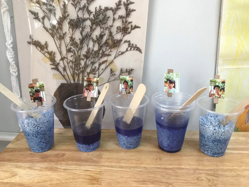 Để làm hạt gạo nếp đổi màu, các bạn lớp MGL A1 đã thiết kế cách làm hạt gạo nếp từ màu trắng, chuyển sang màu sắc khác nhau từ các loại nước ép rau, củ, quả.