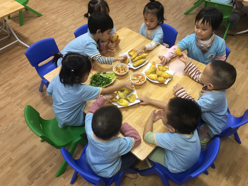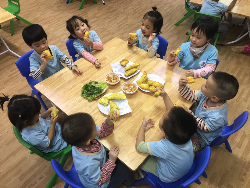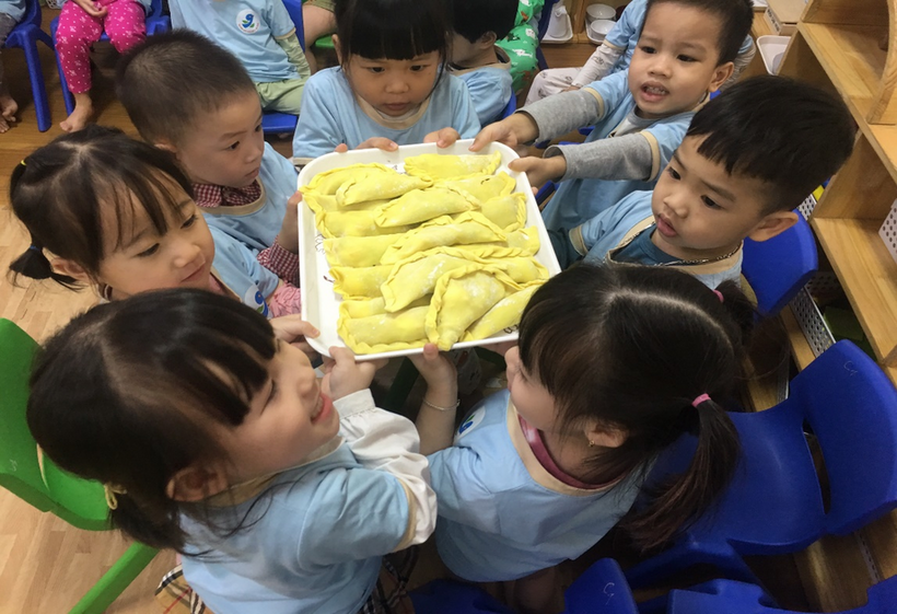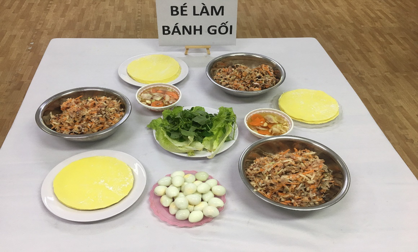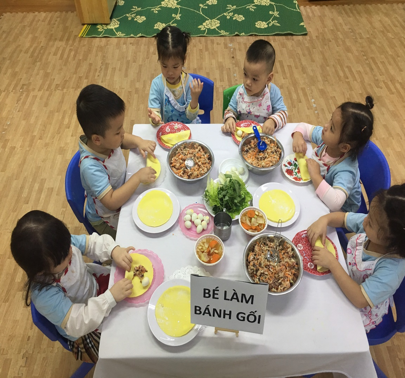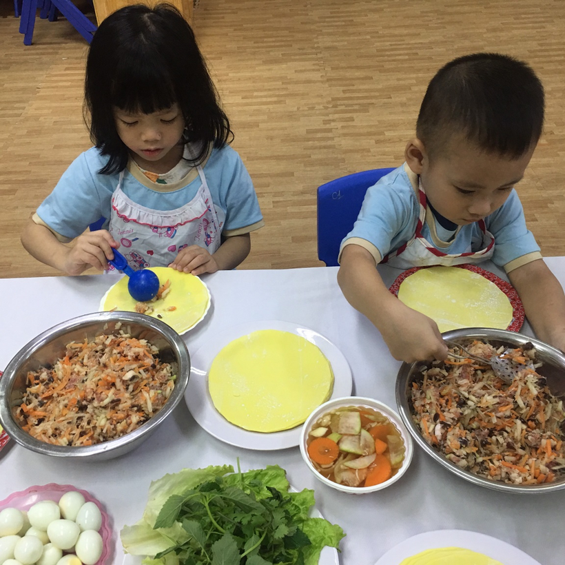 Các bé vô cùng thích thú chuẩn bị các nguyên liệu cùng với cô giáo của mình như: trứng, thịt, miến, rau, cà rốt, su hào, củ đậu… Ở buổi thực hành, các bé được các cô giới thiệu về các nguyên liệu cần có, cách sơ chế các nguyên liệu, trộn các nguyên liệu cùng các loại gia vị sao cho vừa và ngon, đặc biệt là cách cuộn bánh thật khéo léo, cách trải vỏ bánh ra, xúc nhân nhân vào giữa, cho thêm 1 quả trứng cút vào, gấp mép và cuộn lại thì sẽ được một chiếc bánh gối thật đẹp. Với đôi bàn tay nhỏ bé khéo léo, cùng với sự hướng dẫn tỉ mỉ của các cô giáo, các con đã mạnh dạn, tự tin gói được những chiếc bánh thật đẹp rồi. Sau đó các cô rán những chiếc bánh mà các bé vừa gói để các bé được thưởng thức sản phẩm do chính tay mình làm ra.