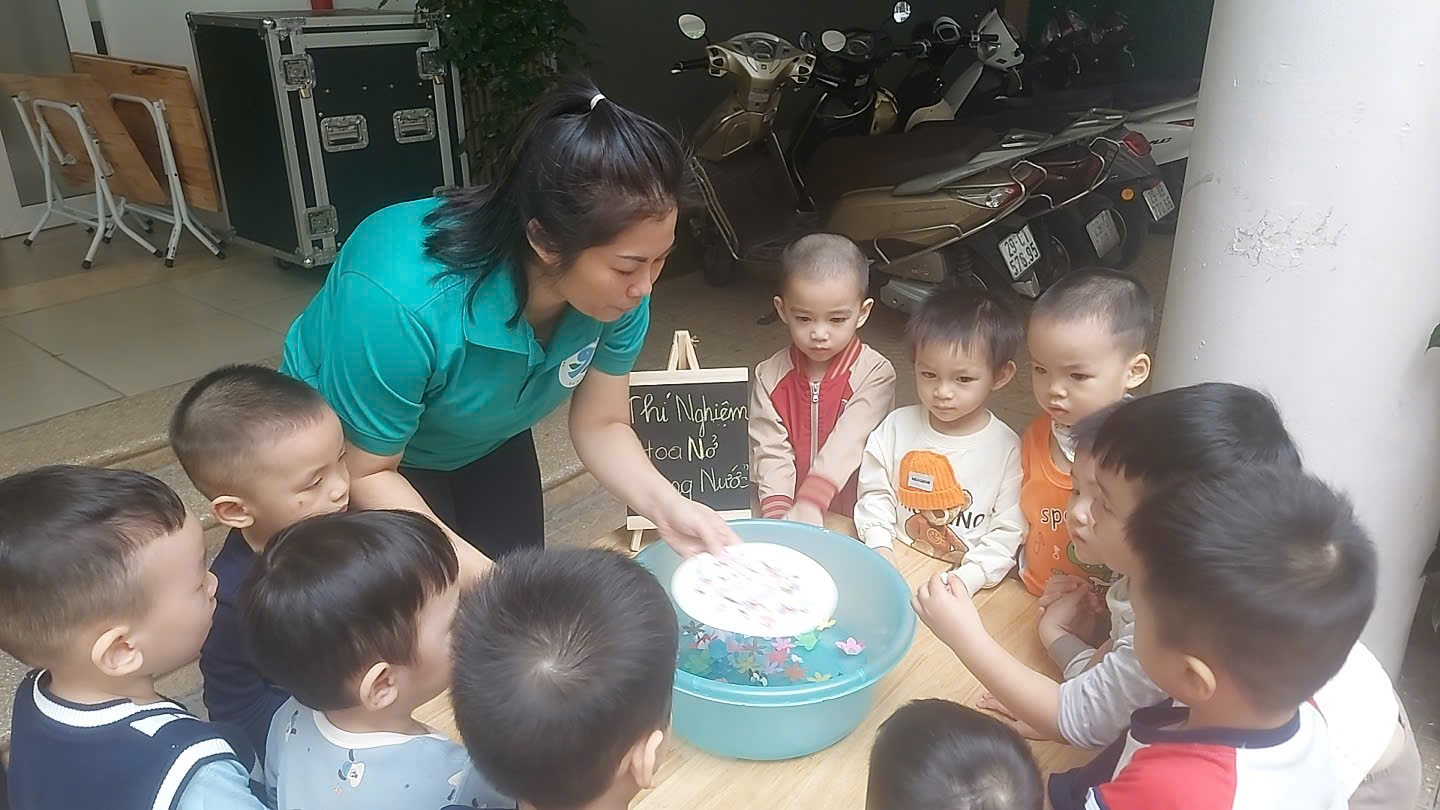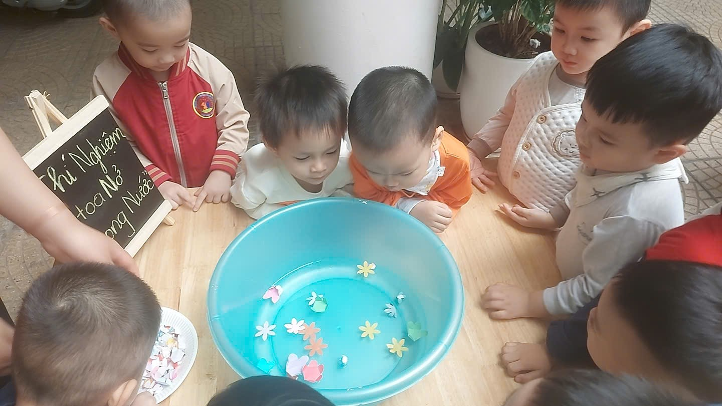 Các con rất là thích thú khi được cô cho làm thí nghiệm “Hoa nở trong nước”, các con được tận hưởng những điều kiện tự nhiên như nước, ánh nắng, không khí trong lành trong ngôi trường của mình.