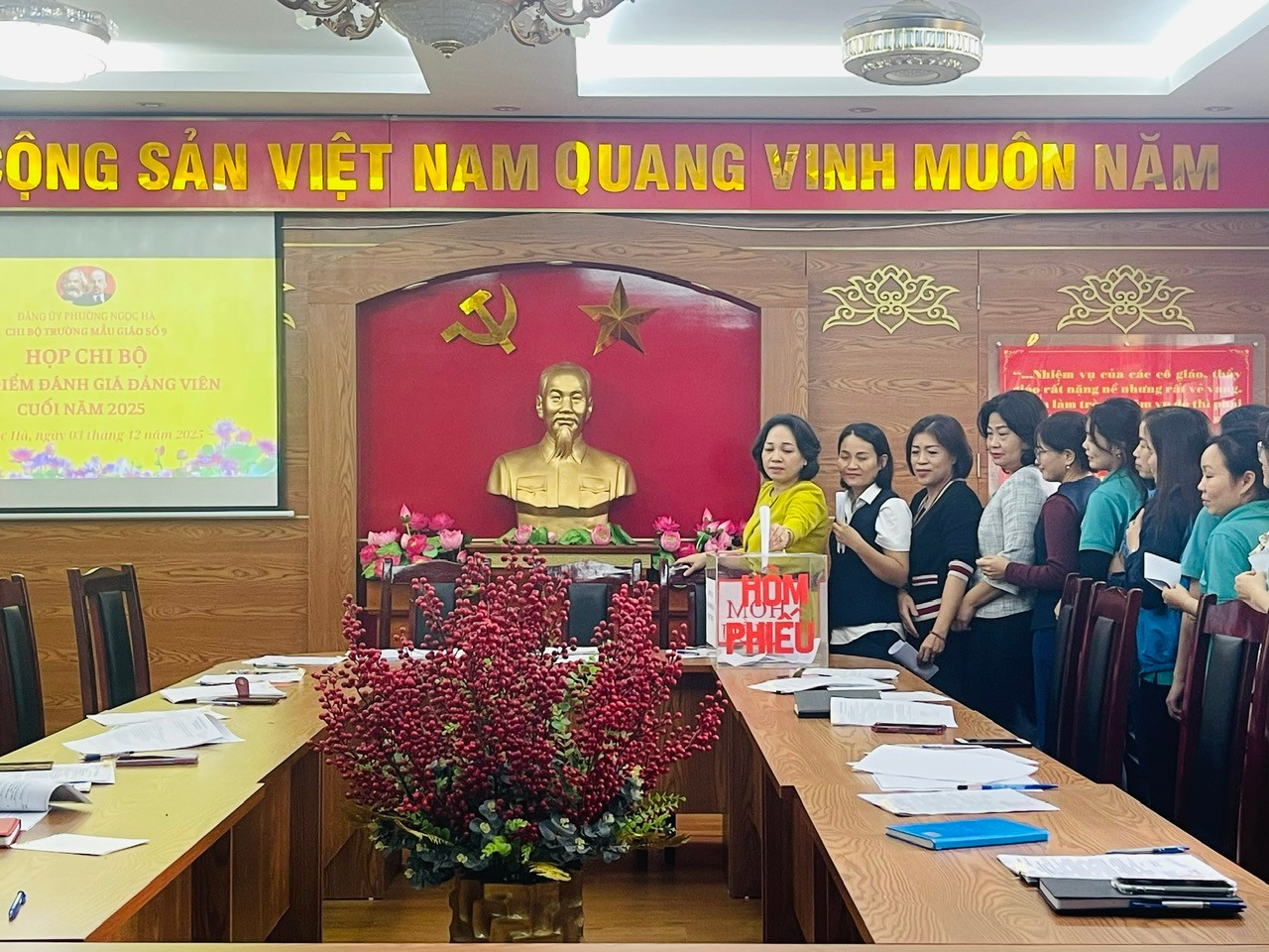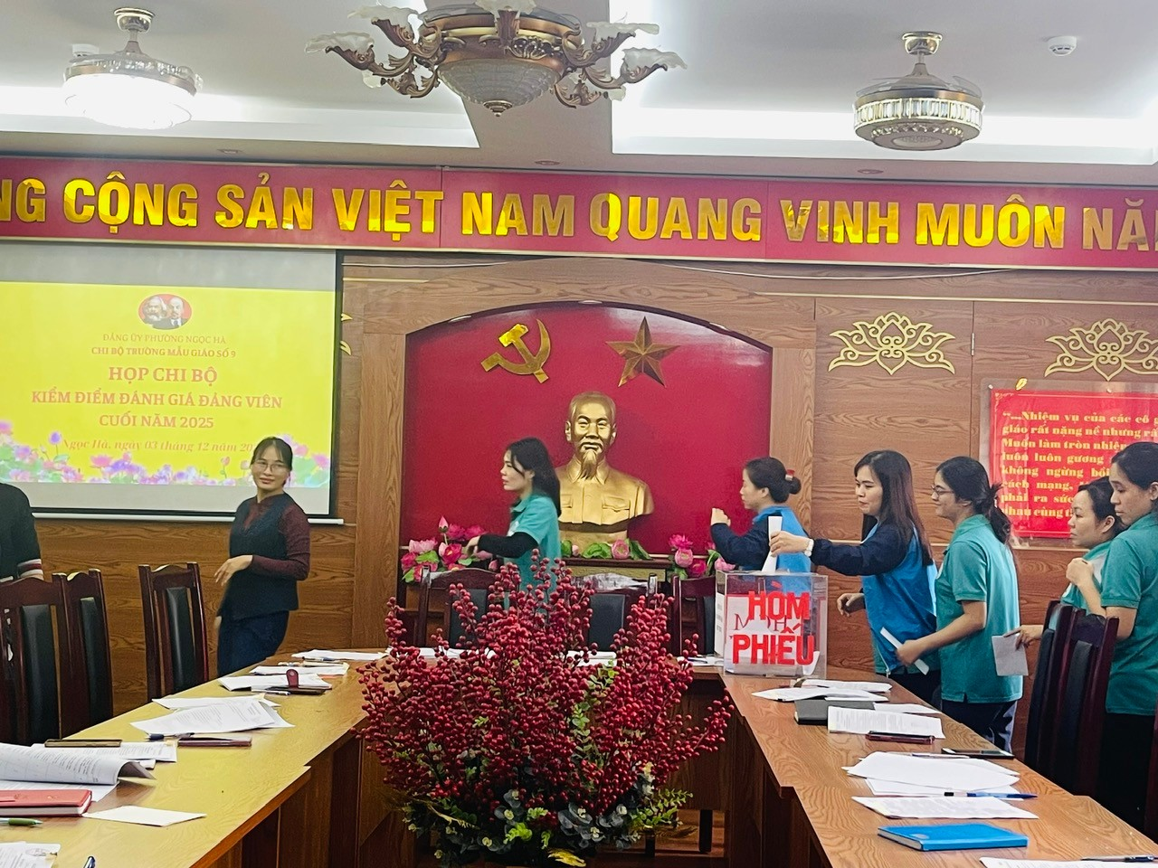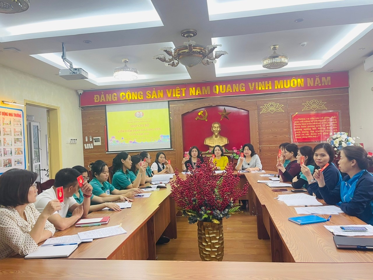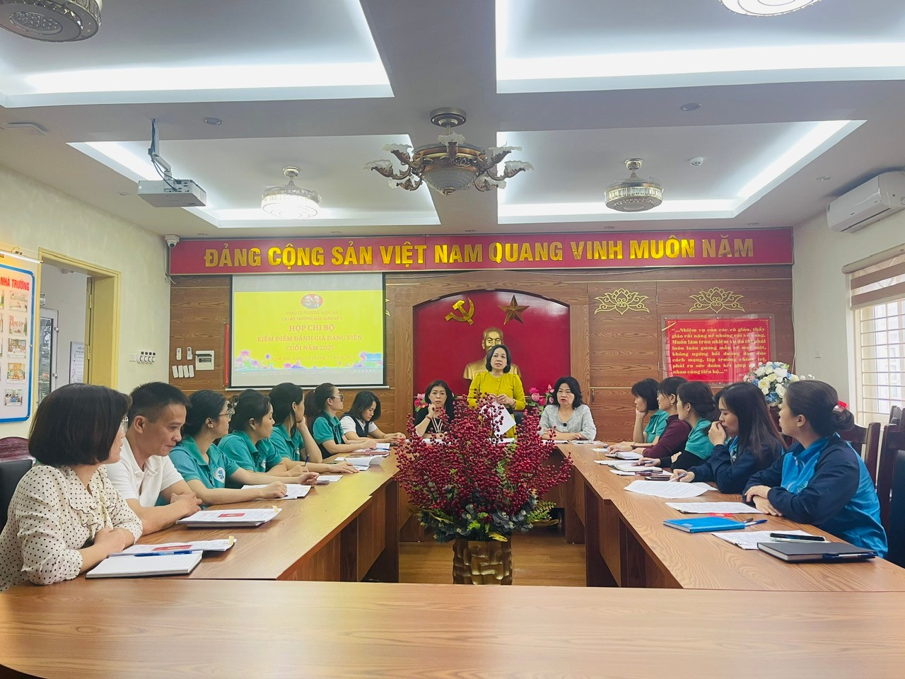 Nhằm đánh giá khách quan, toàn diện kết quả lãnh đạo, chỉ đạo và thực hiện nhiệm vụ của tập thể Chi bộ, Chi ủy và từng Đảng viên trong năm 2025, Chi bộ Mẫu giáo số 9 đã tổ chức thành công Hội nghị kiểm điểm, đánh giá chất lượng tổ chức đảng và đảng viên cuối năm theo đúng quy định của cấp ủy cấp trên.