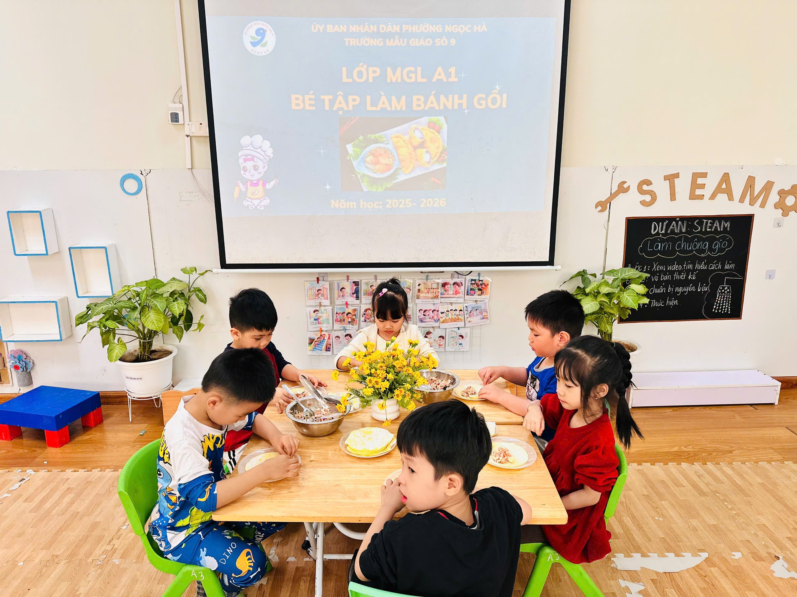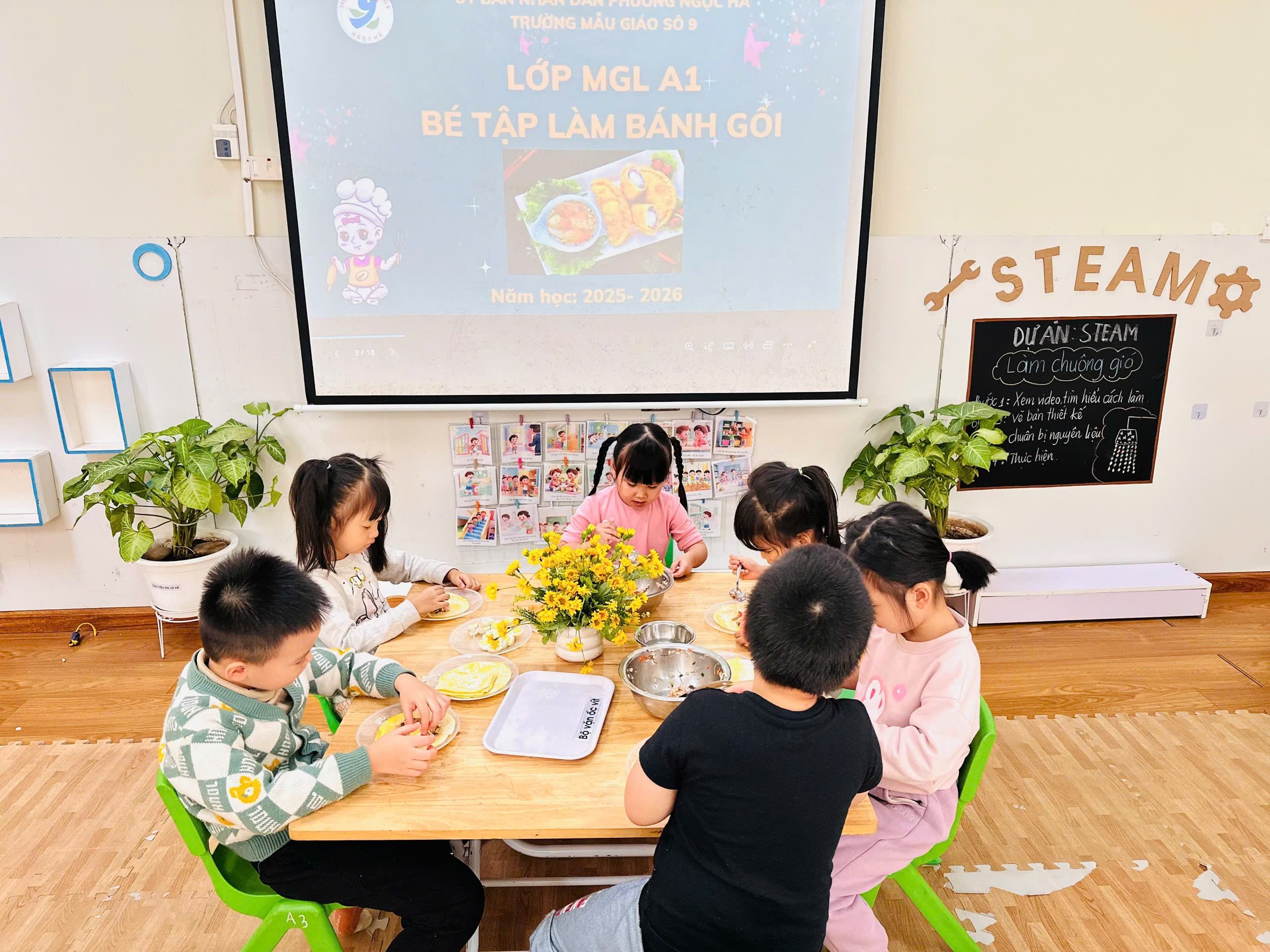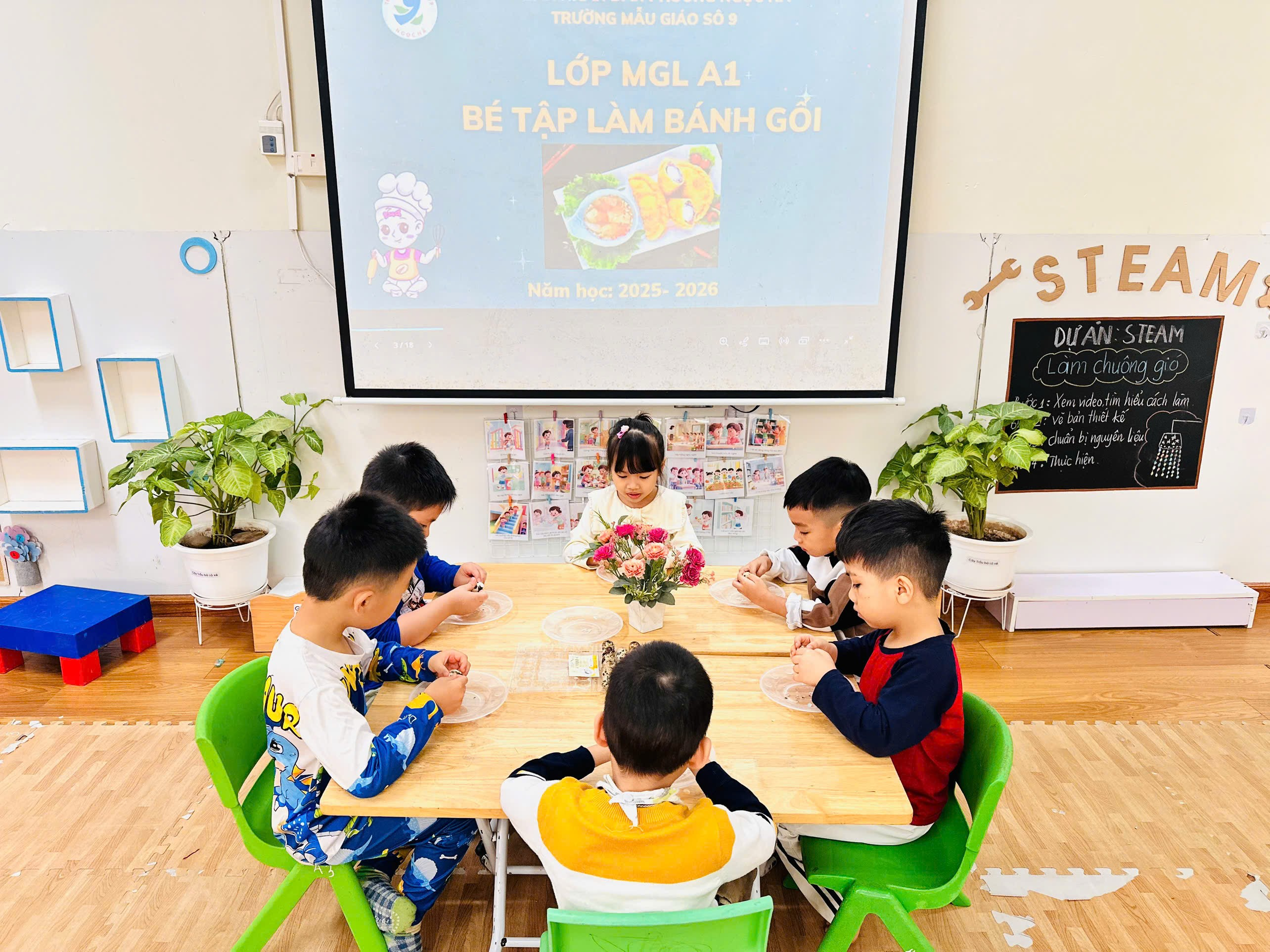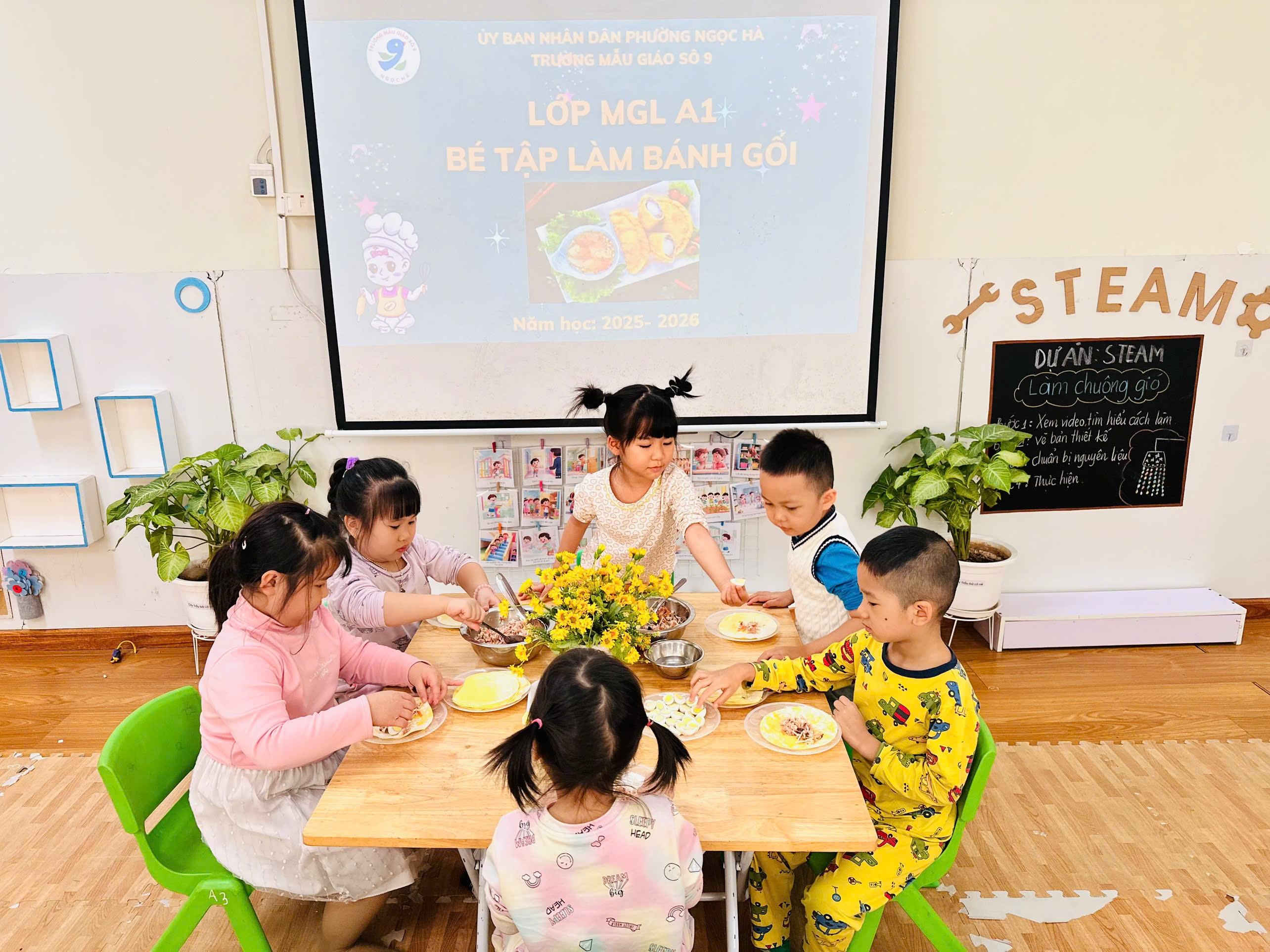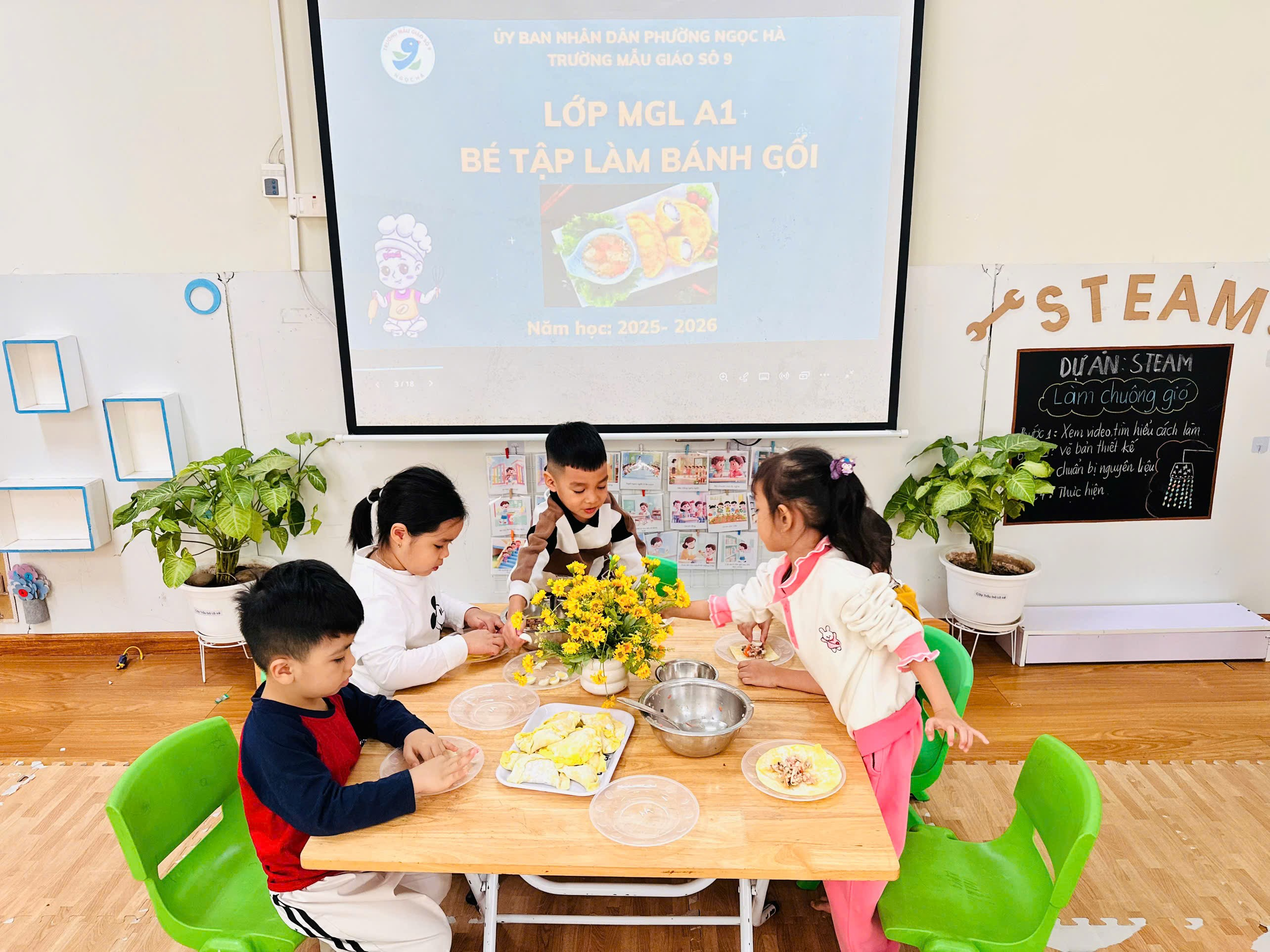 Hôm nay, lớp Mẫu giáo lớn A1 – Trường Mẫu giáo Số 9 đã có một buổi trải nghiệm vô cùng thú vị và ý nghĩa với hoạt động “Bé tập làm bánh gối”. Đây là hoạt động giúp các con tìm hiểu về món ăn truyền thống quen thuộc của Hà Nội, đồng thời rèn luyện nhiều kỹ năng quan trọng thông qua trải nghiệm thực tế.