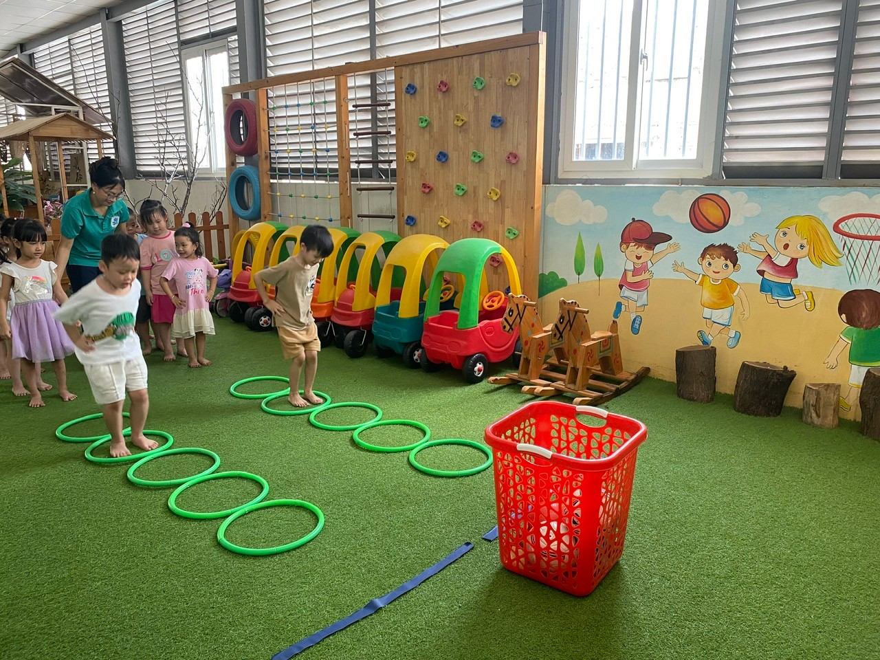 Mỗi chiếc vòng được sắp xếp một cách hợp lý trở thành thử thách thú vị cho các "vận động viên nhí". Trò chơi này giúp trẻ rèn luyện sức bật của đôi chân, sự phối hợp nhịp nhàng giữa tay và chân. Quan trọng hơn, việc xác định khoảng cách và bật nhảy qua vòng giúp các con cải thiện khả năng định hướng không gian và làm chủ cơ thể. Đây là một nền tảng quan trọng cho các hoạt động thể thao phức tạp hơn trong tương lai.
