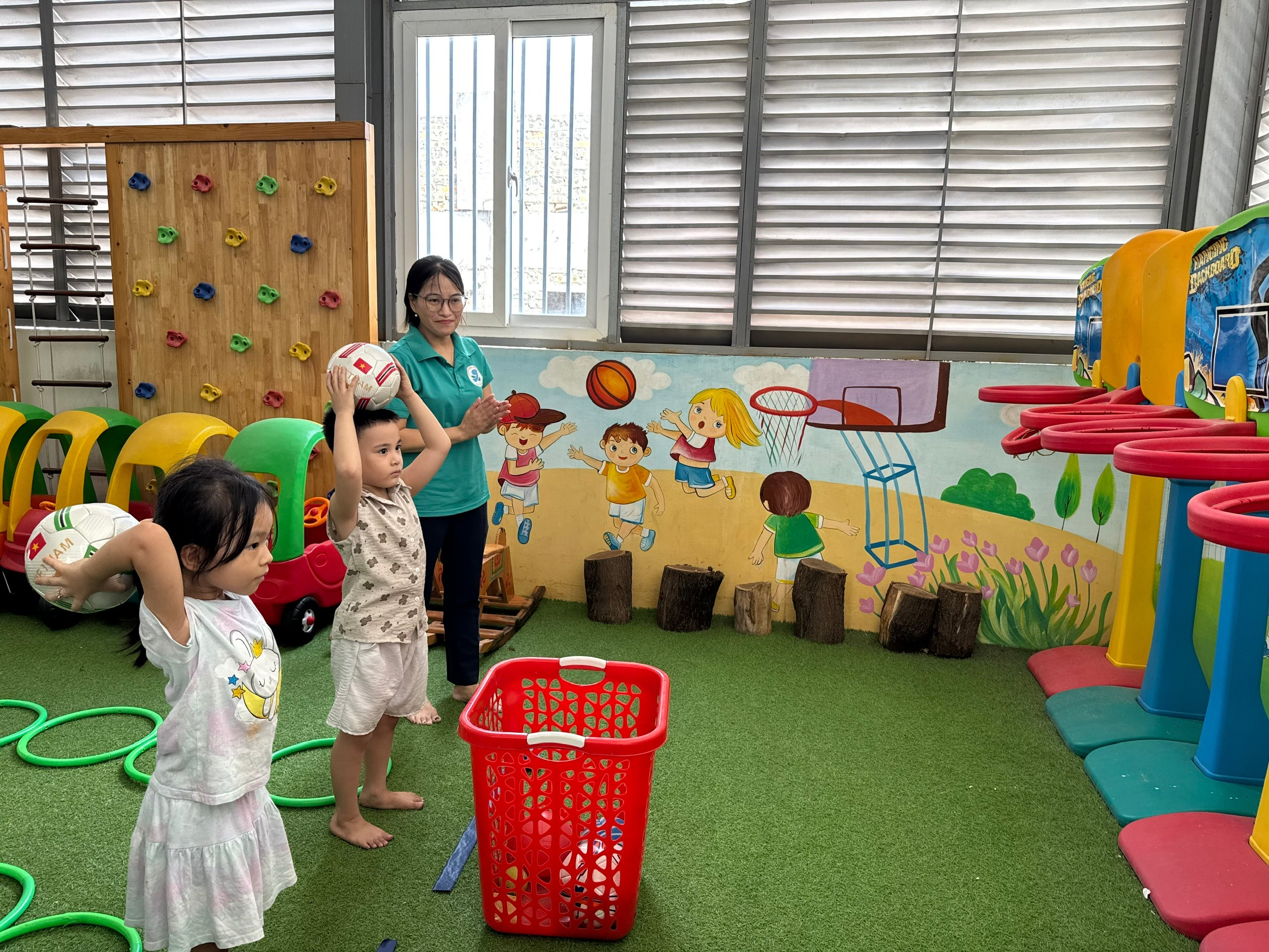 Đứng trước mục tiêu, các bé phải tính toán lực tay và hướng ném để đưa bóng vào đích. Hoạt động này không chỉ rèn luyện cơ tay mà còn đòi hỏi sự tập trung cao độ và tính chính xác. Qua mỗi lần ném, trẻ học được cách kiên nhẫn, điều chỉnh hành động để đạt được kết quả mong muốn. Đây là bài học tuyệt vời về sự nỗ lực và khả năng tự kiểm soát bản thân.