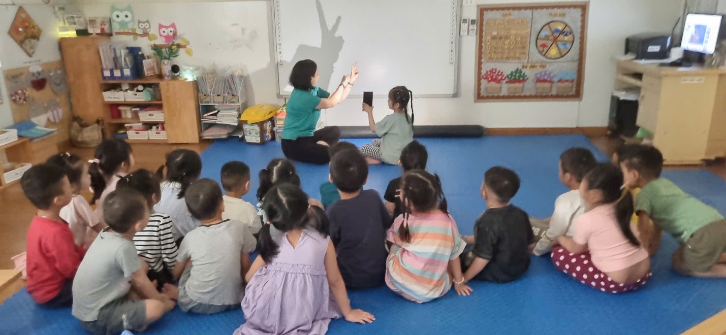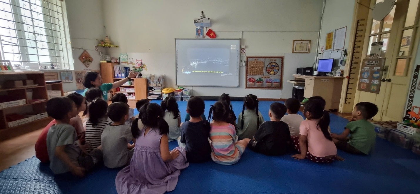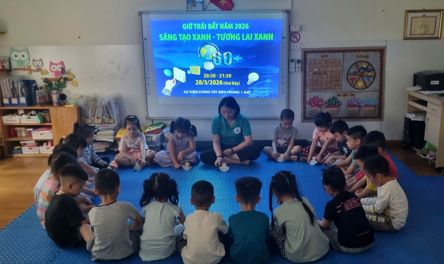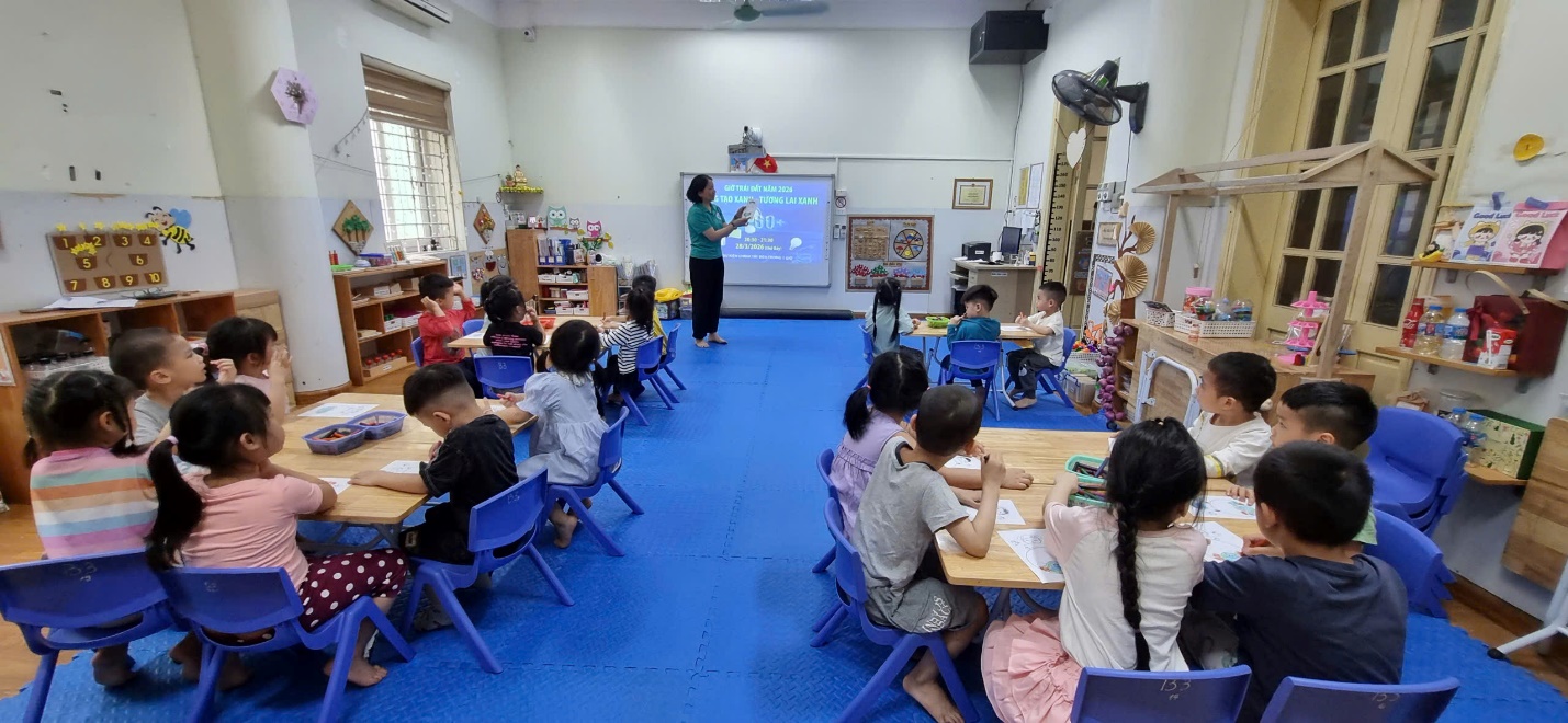 Ngoài ra, hoạt động ngồi vòng tròn trao đổi giúp trẻ mạnh dạn chia sẻ suy nghĩ, hình thành những hành vi tích cực như tắt điện khi không sử dụng, tiết kiệm nước, giữ gìn vệ sinh môi trường. Không khí lớp học diễn ra sôi nổi, hào hứng, trẻ tích cực tham gia vào các hoạt động trải nghiệm.