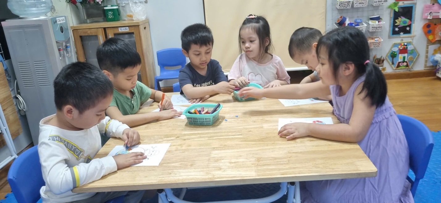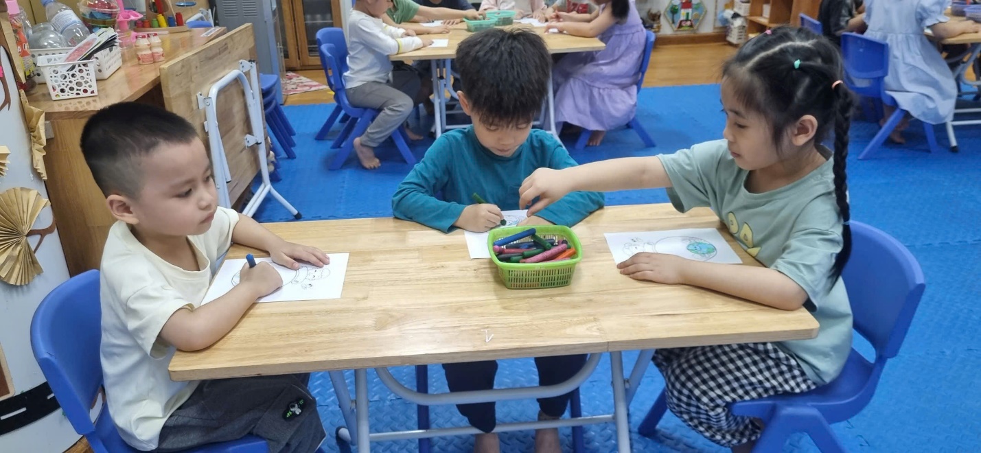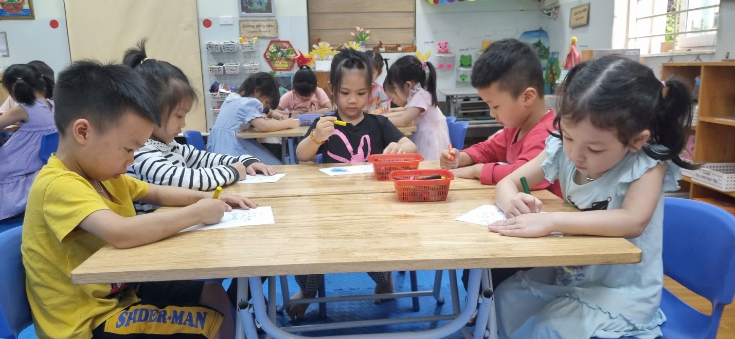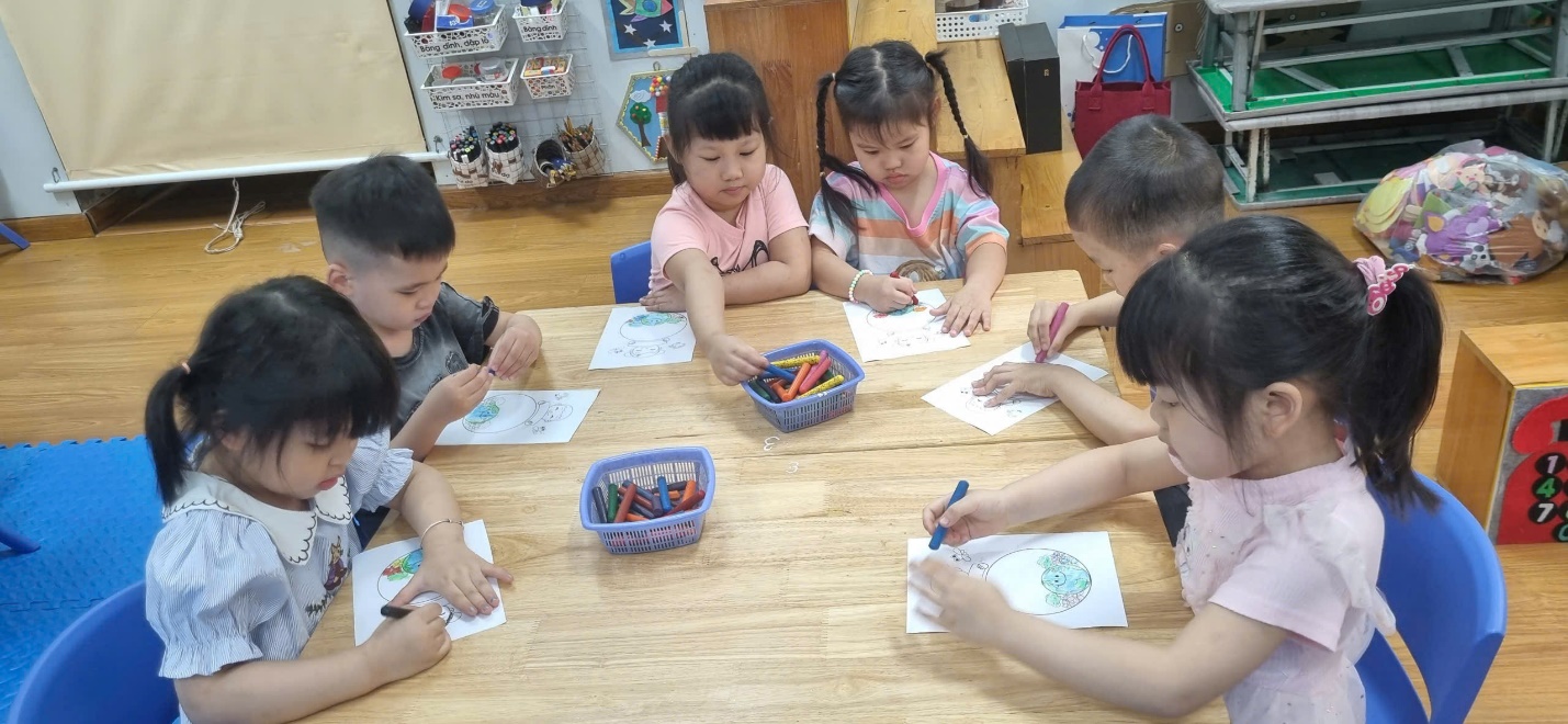 Trong các hoạt động học tập, trẻ được tham gia tạo hình với chủ đề “Trái đất xanh”. Những bức tranh ngộ nghĩnh, nhiều màu sắc thể hiện sự hồn nhiên và mong ước về một hành tinh trong lành. Bên cạnh đó, các bé còn tích cực tham gia hoạt động tô màu, vẽ tranh theo nhóm, rèn luyện kỹ năng hợp tác, chia sẻ và hỗ trợ bạn bè.