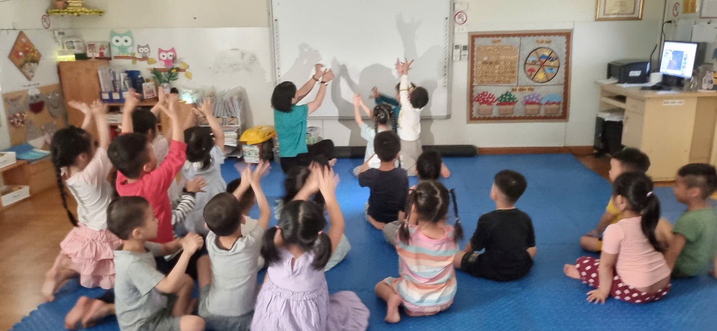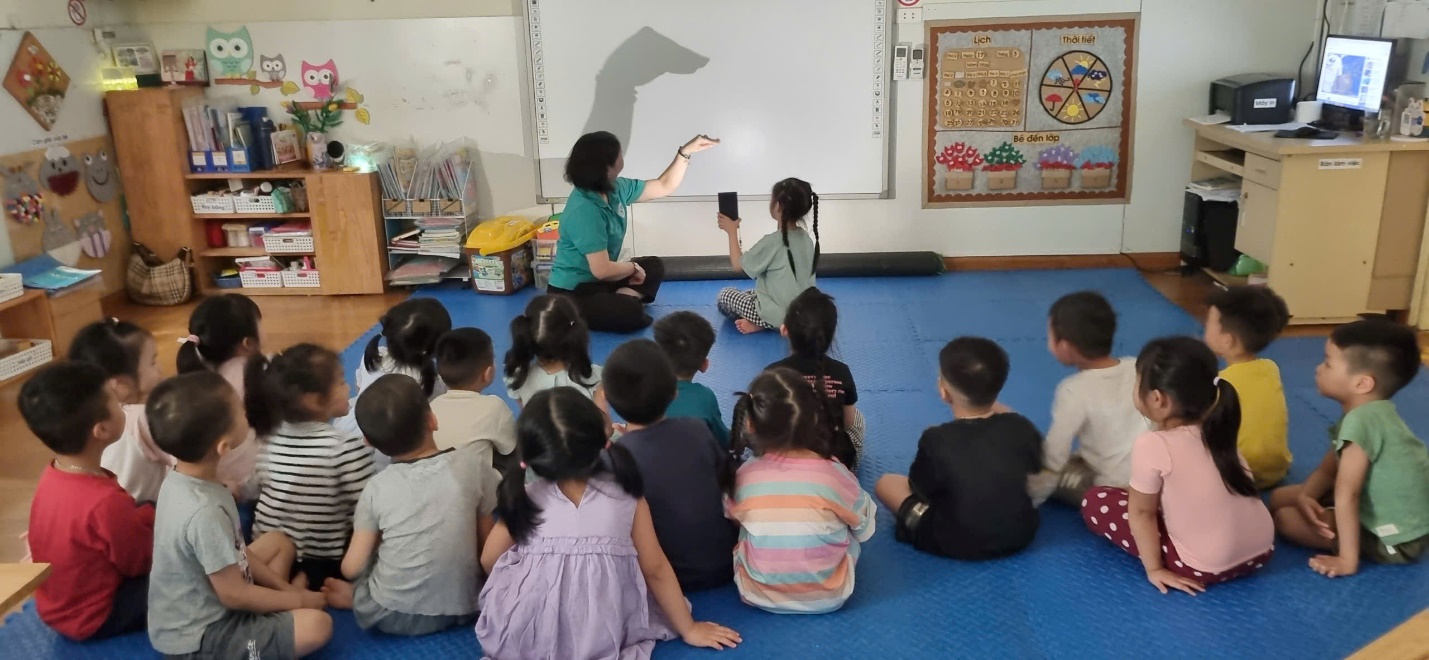 Một điểm nhấn của buổi hoạt động là trò chơi khám phá ánh sáng và bóng. Dưới sự hướng dẫn của cô giáo, trẻ sử dụng ánh sáng để tạo ra các hình bóng thú vị trên bảng, qua đó hiểu thêm về vai trò của ánh sáng cũng như ý nghĩa của việc sử dụng năng lượng hợp lý trong cuộc sống hàng ngày.