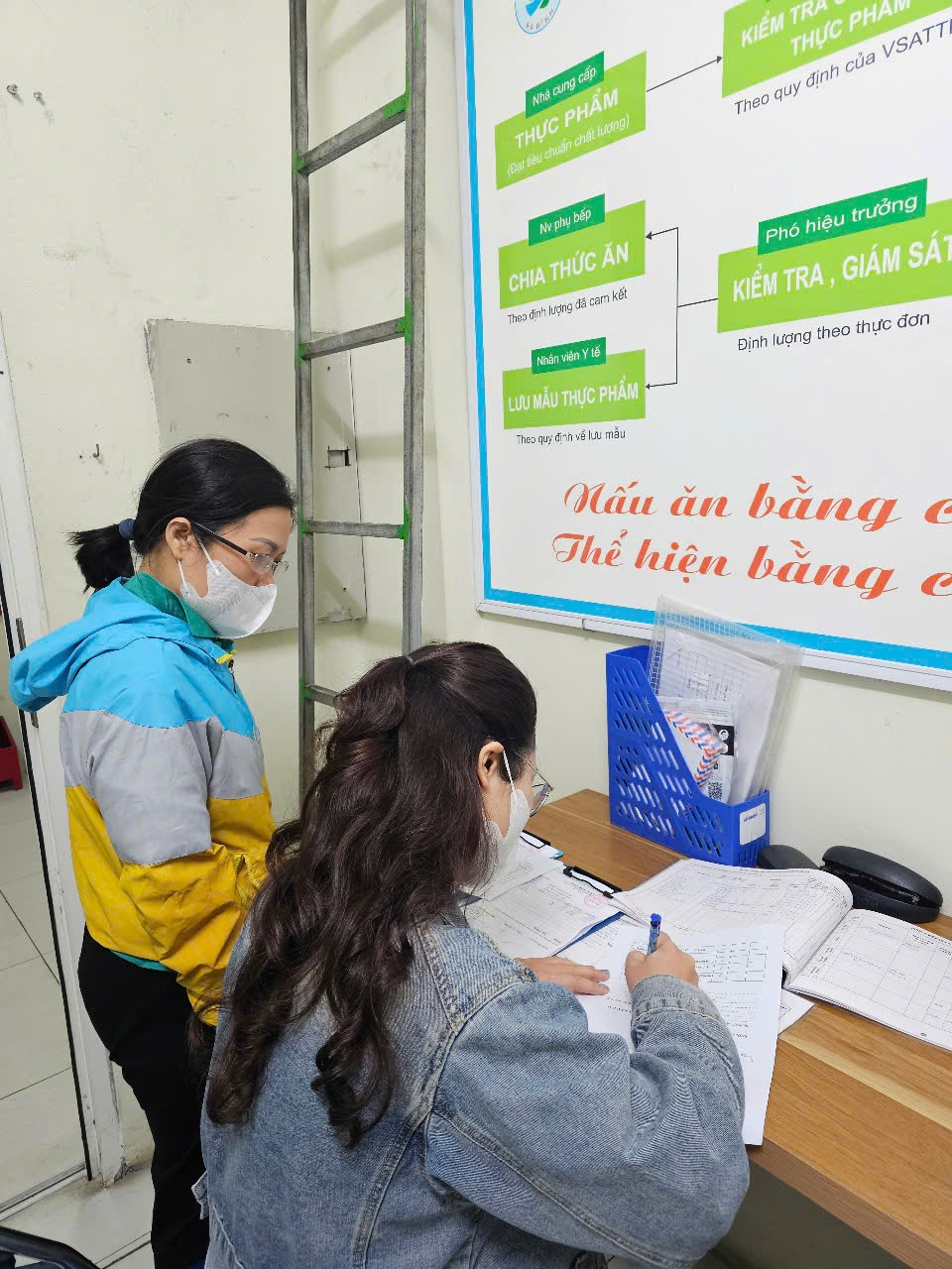 Trong công tác quản lý nuôi dưỡng, công tác giao nhận thực phẩm trong nhà trường luôn được chú trọng, kiểm soát chặt chẽ. Thực phẩm khi nhận vào trường luôn được kiểm tra kỹ, đảm bảo về số lượng và chất lượng theo tiêu chuẩn. Thực hiện ghi chép sổ kiểm thực ba bước theo dõi chất lượng, số lượng thực phẩm từ khâu giao nhận, chế biến, chia ăn, lưu mẫu theo quy trình.