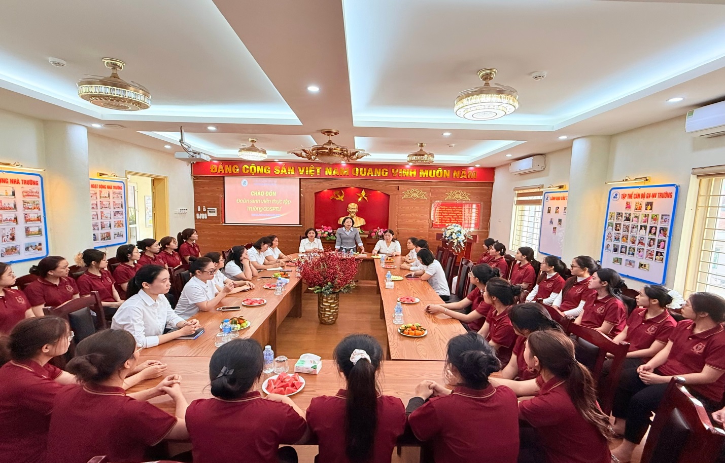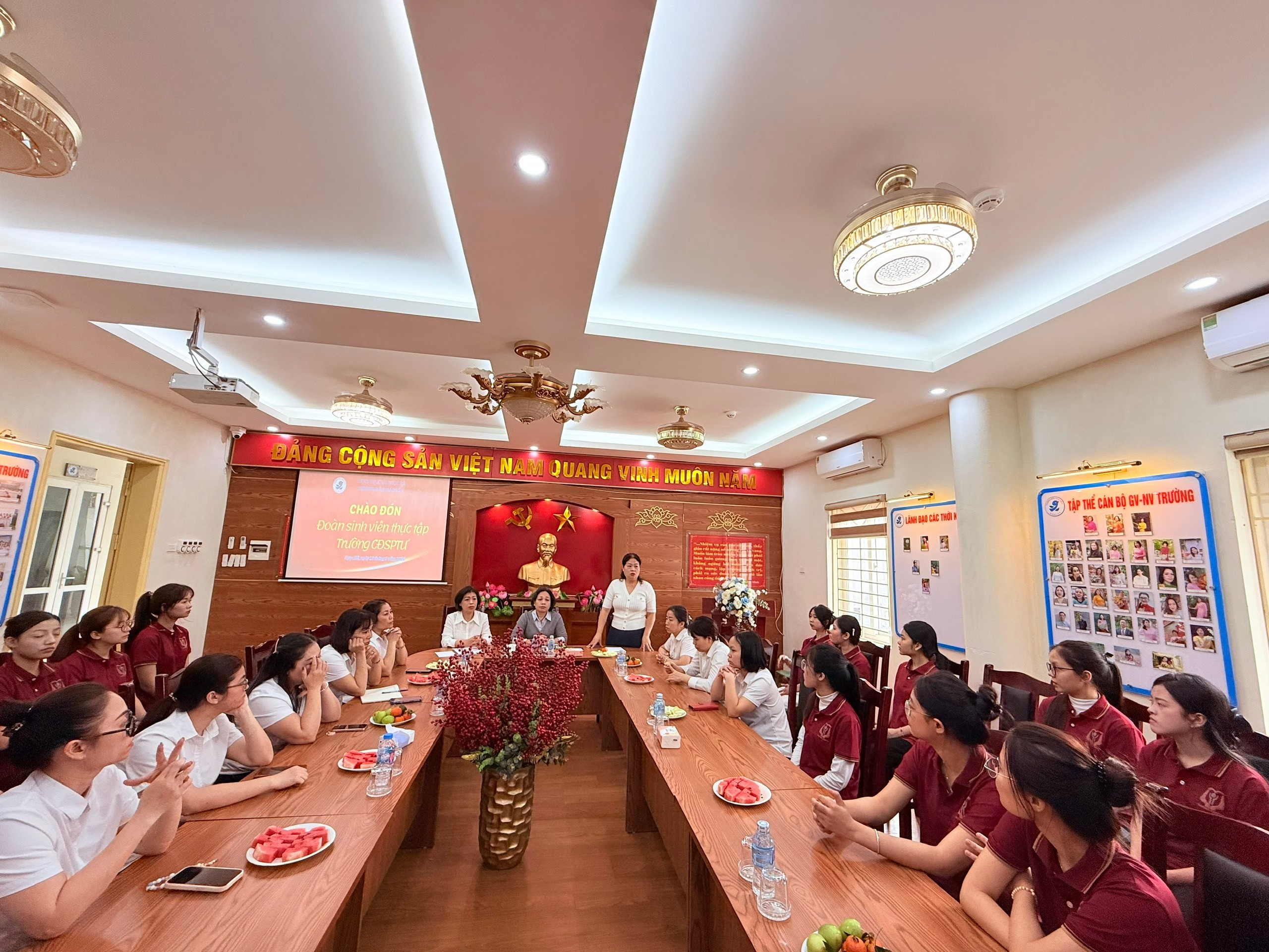 Buổi lễ diễn ra trong không khí thân mật, ấm áp với sự tham dự của Ban Giám hiệu, các cô giáo chủ nhiệm và phụ trách chuyên môn, cùng toàn thể các bạn sinh viên thực tập.