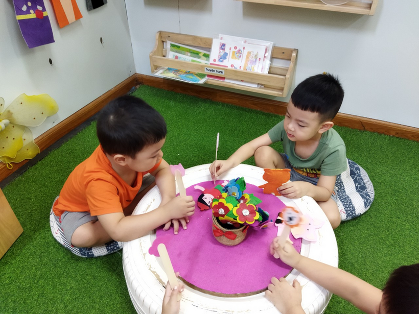 Trong giờ chơi tự do nhóm trẻ xếp bàn ghế thành xe đua, nhóm khác chơi búp bê trong lều, mấy bạn khác nấu ăn bằng vài mẩu gỗ.