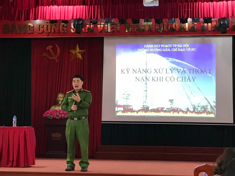 Giảng viên của Hội nghị tập huấn là Thiếu tá Nguyễn Đức Thắng - phó trưởng công an quận Ba Đình cùng các Đội PCCC&CNCH đến từ các trường mầm non, tiểu học trên địa bàn quận.