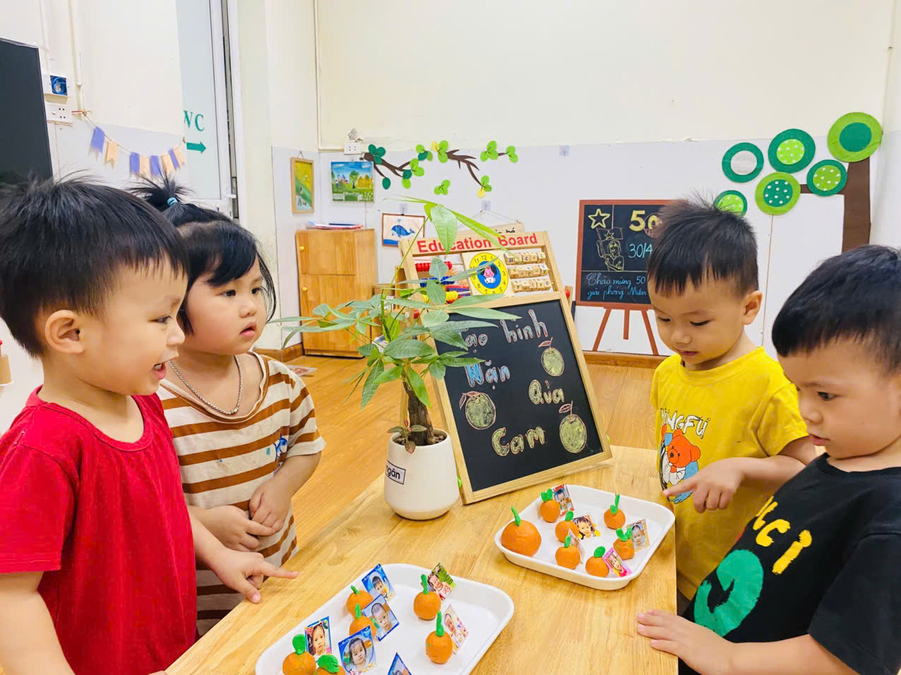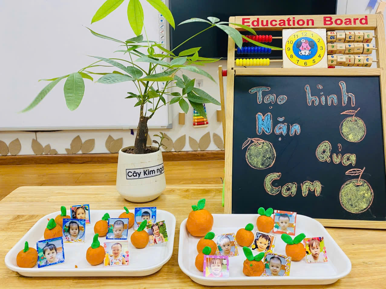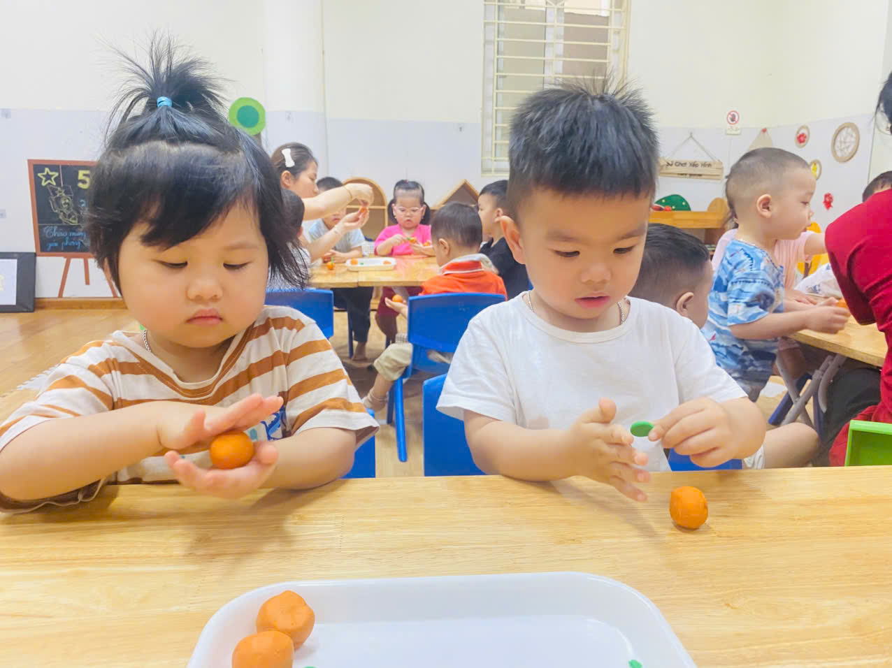 Có bé cẩn thận xoay tròn viên đất, nắn nó thành hình tròn trịa. Có bé lại thích thú véo những "múi cam" nhỏ xíu. Mỗi "quả cam" là một tác phẩm độc đáo, thể hiện sự ngây thơ và sáng tạo riêng của từng bé. Khuôn mặt các con rạng rỡ niềm vui khi tự tay tạo ra "sản phẩm" của mình.