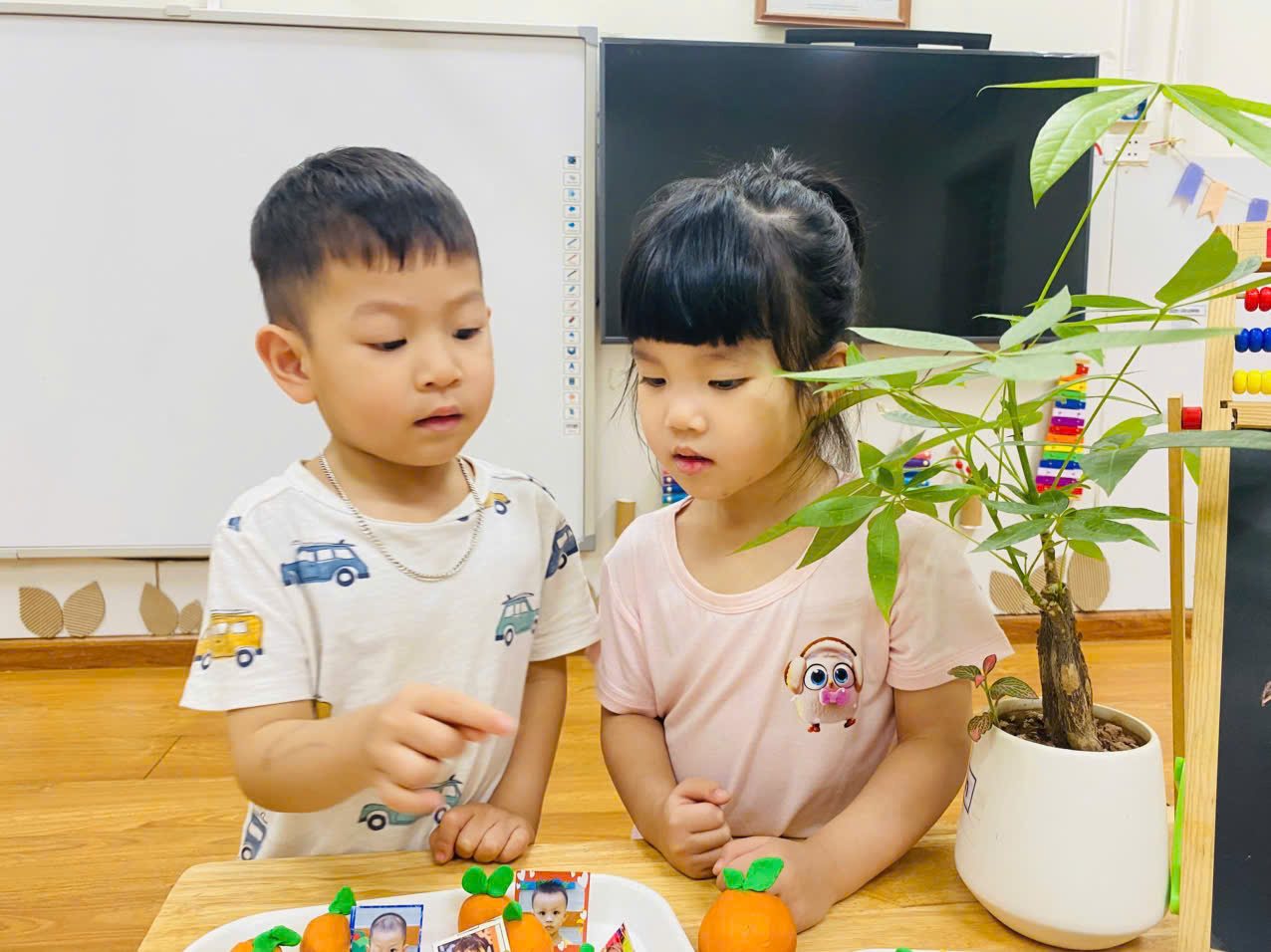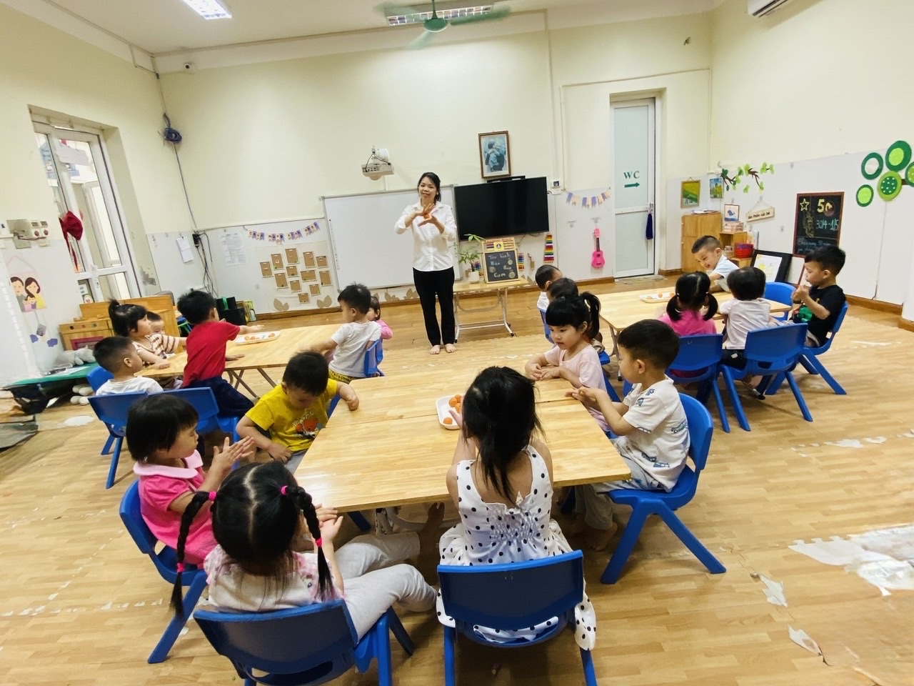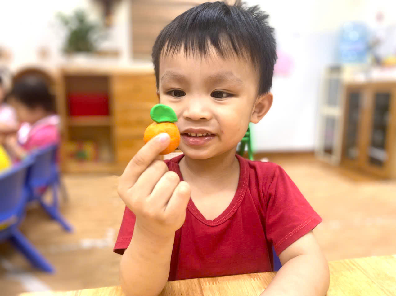 Có bé cẩn thận xoay tròn viên đất, nắn nó thành hình tròn trịa. Có bé lại thích thú véo những "múi cam" nhỏ xíu. Mỗi "quả cam" là một tác phẩm độc đáo, thể hiện sự ngây thơ và sáng tạo riêng của từng bé. Khuôn mặt các con rạng rỡ niềm vui khi tự tay tạo ra "sản phẩm" của mình.