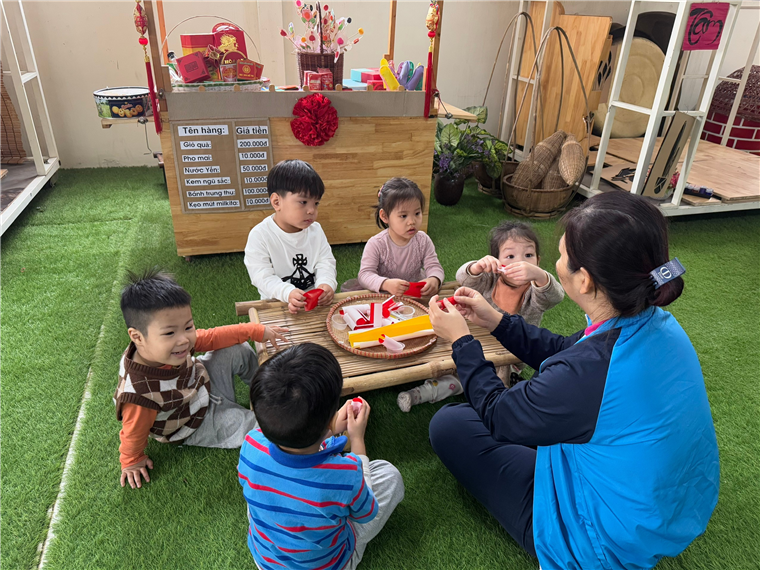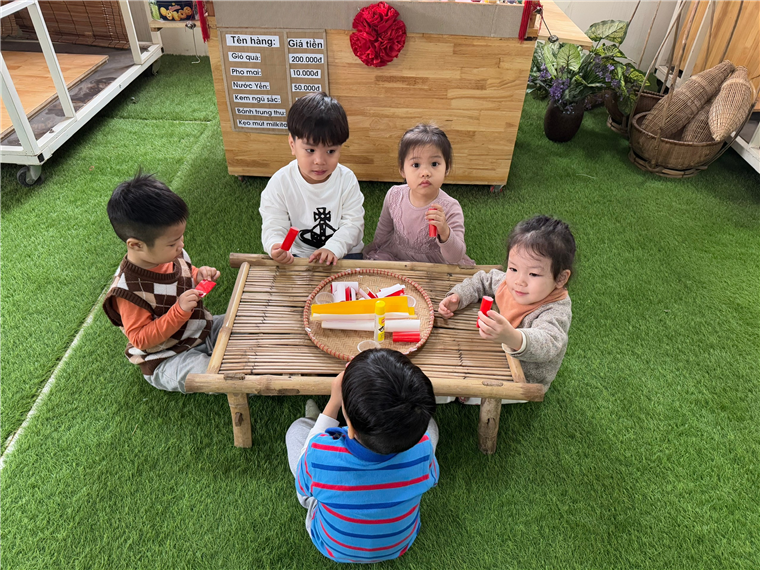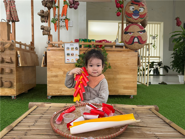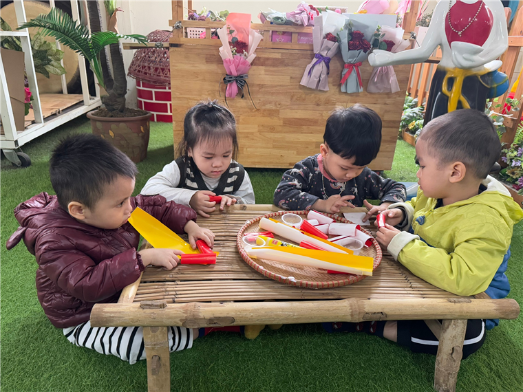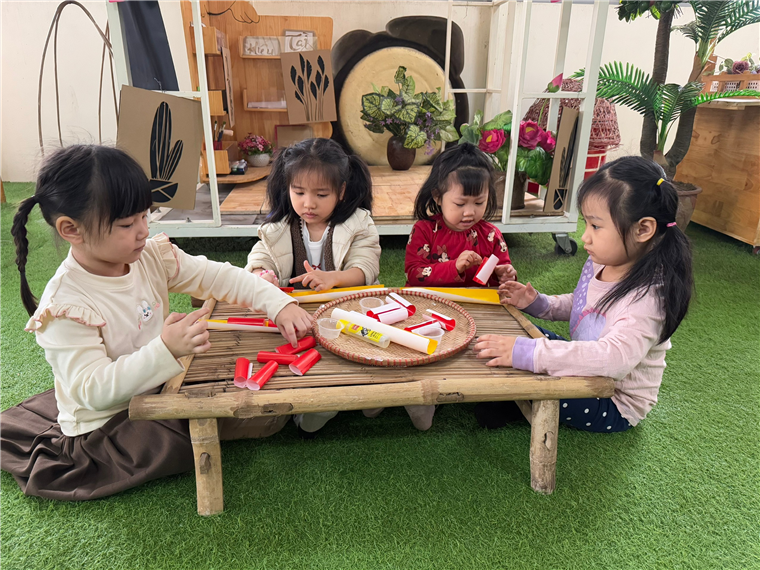 Các bạn nhỏ đang làm pháo để trang trí