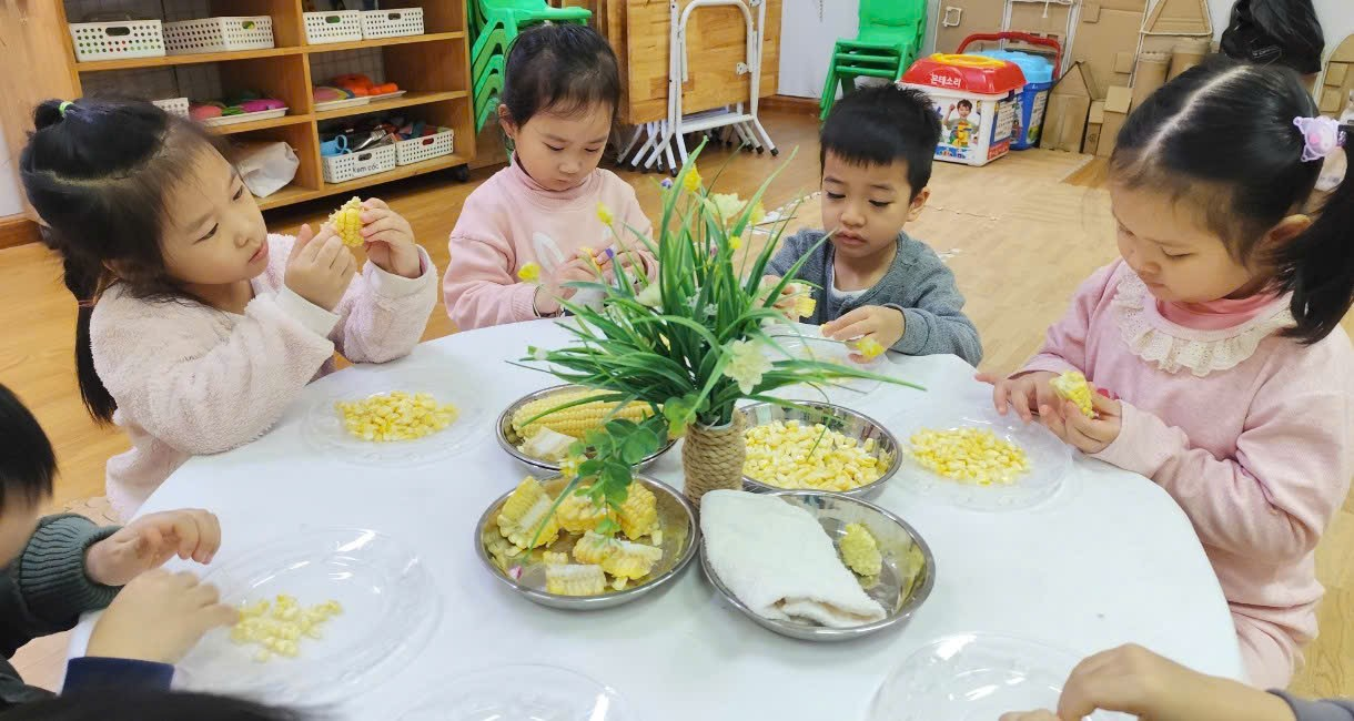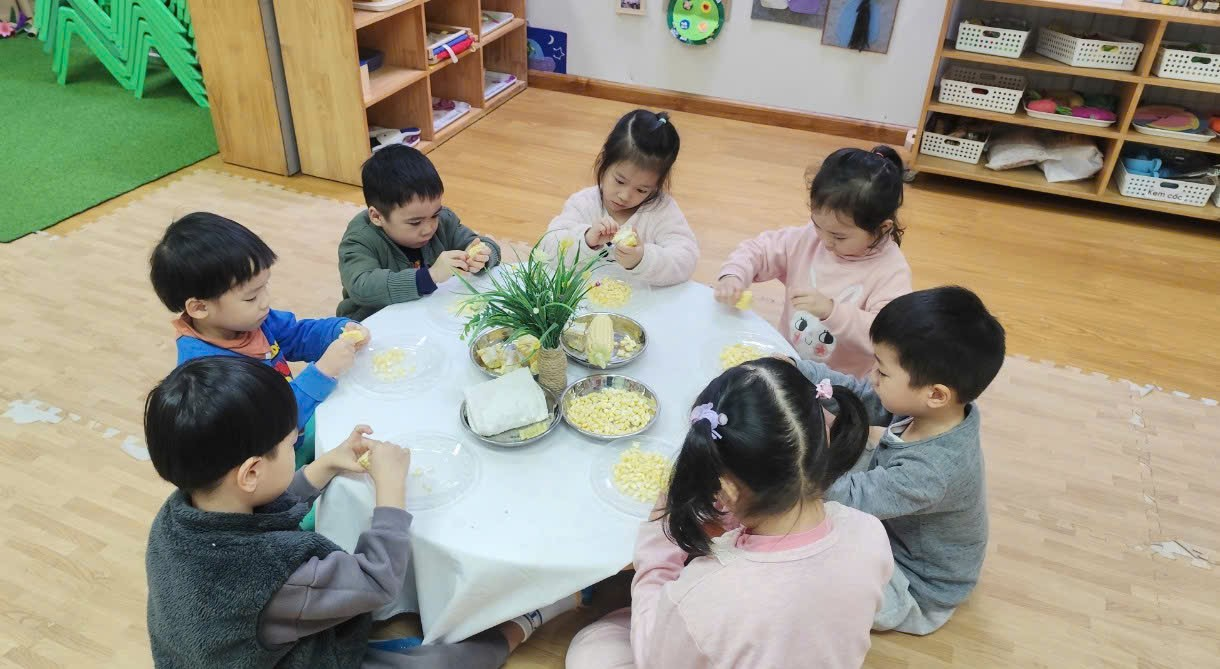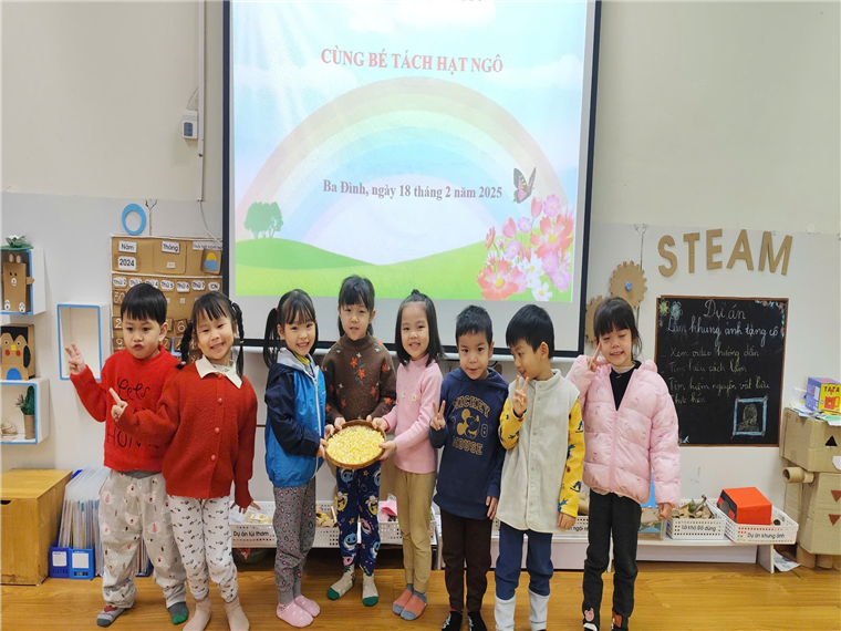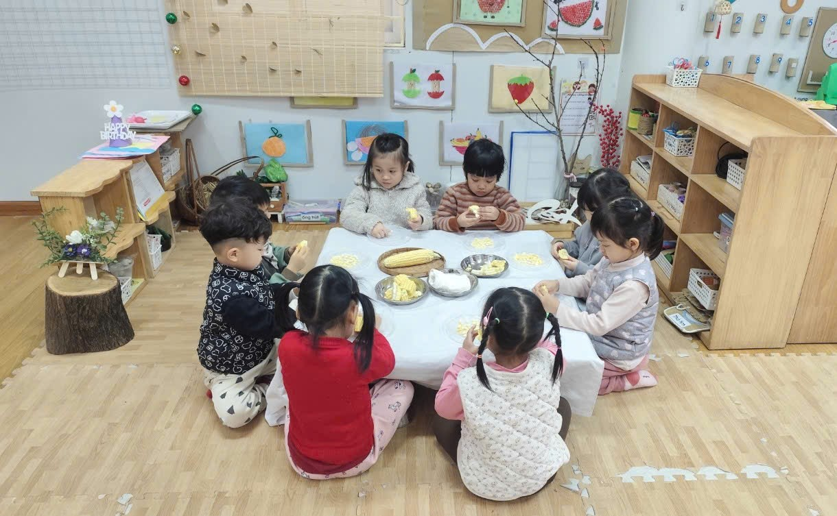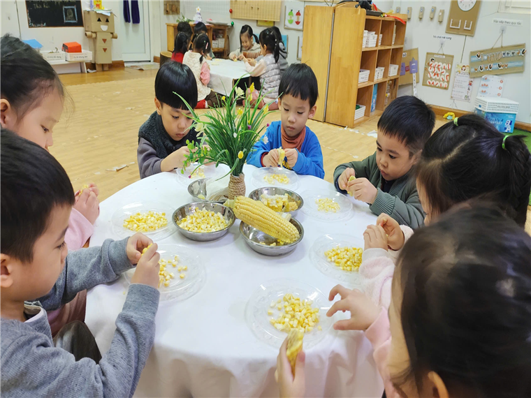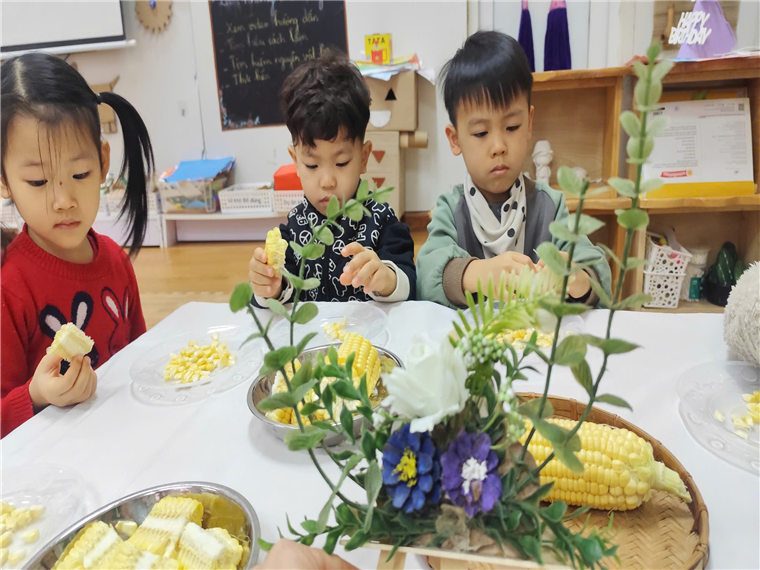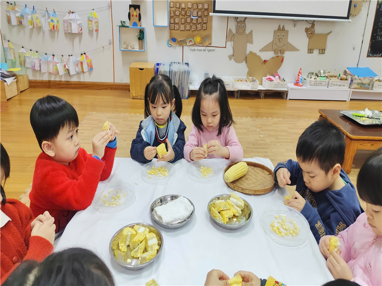Qua hoạt động này, các bé không chỉ rèn luyện sự khéo léo của đôi tay mà còn hiểu thêm về quá trình thu hoạch và chế biến ngô – một loại thực phẩm quen thuộc trong bữa ăn hàng ngày. Bé nào cũng chăm chú, say sưa, đôi mắt ánh lên niềm vui khi thấy thành quả của mình.