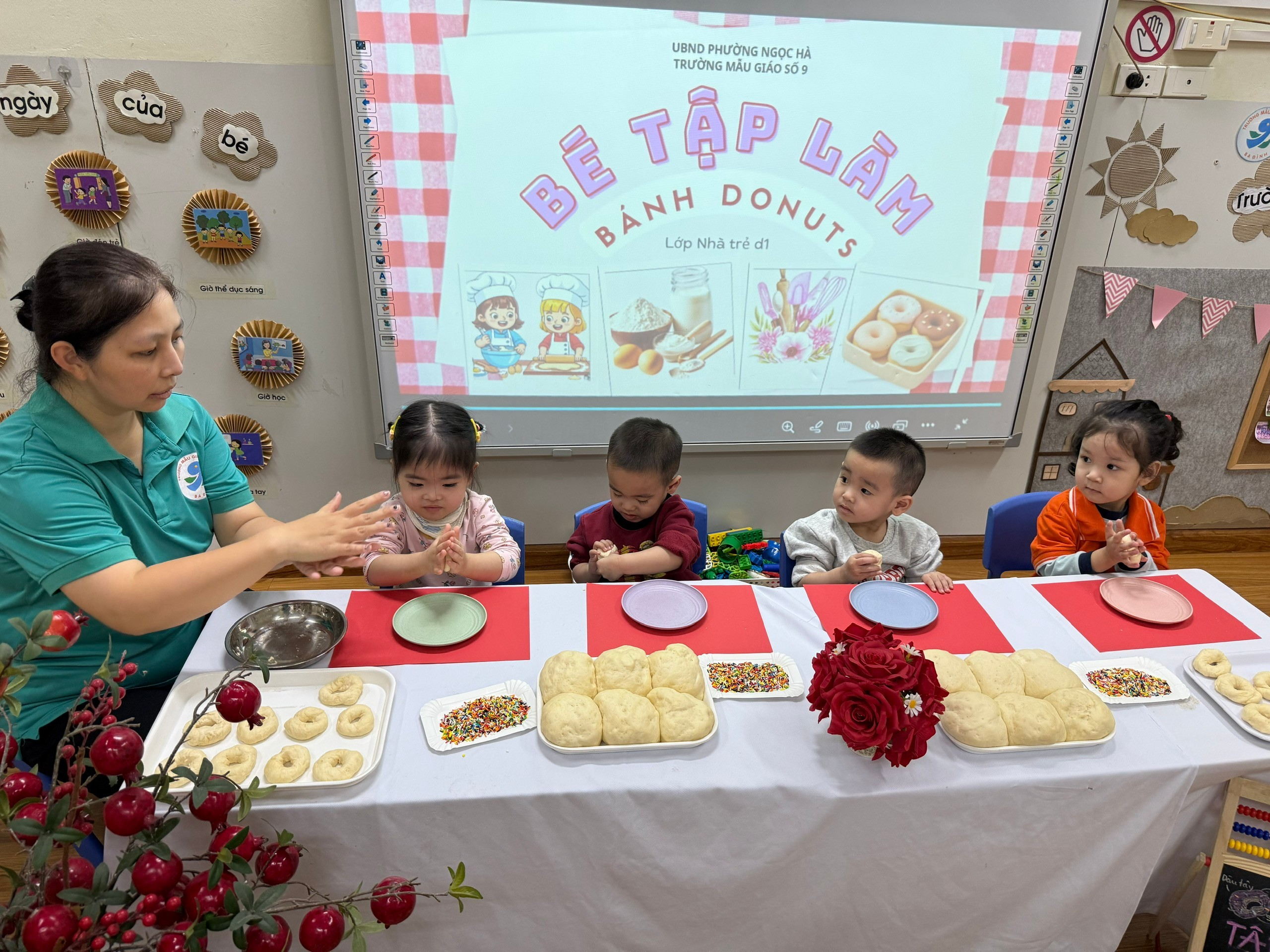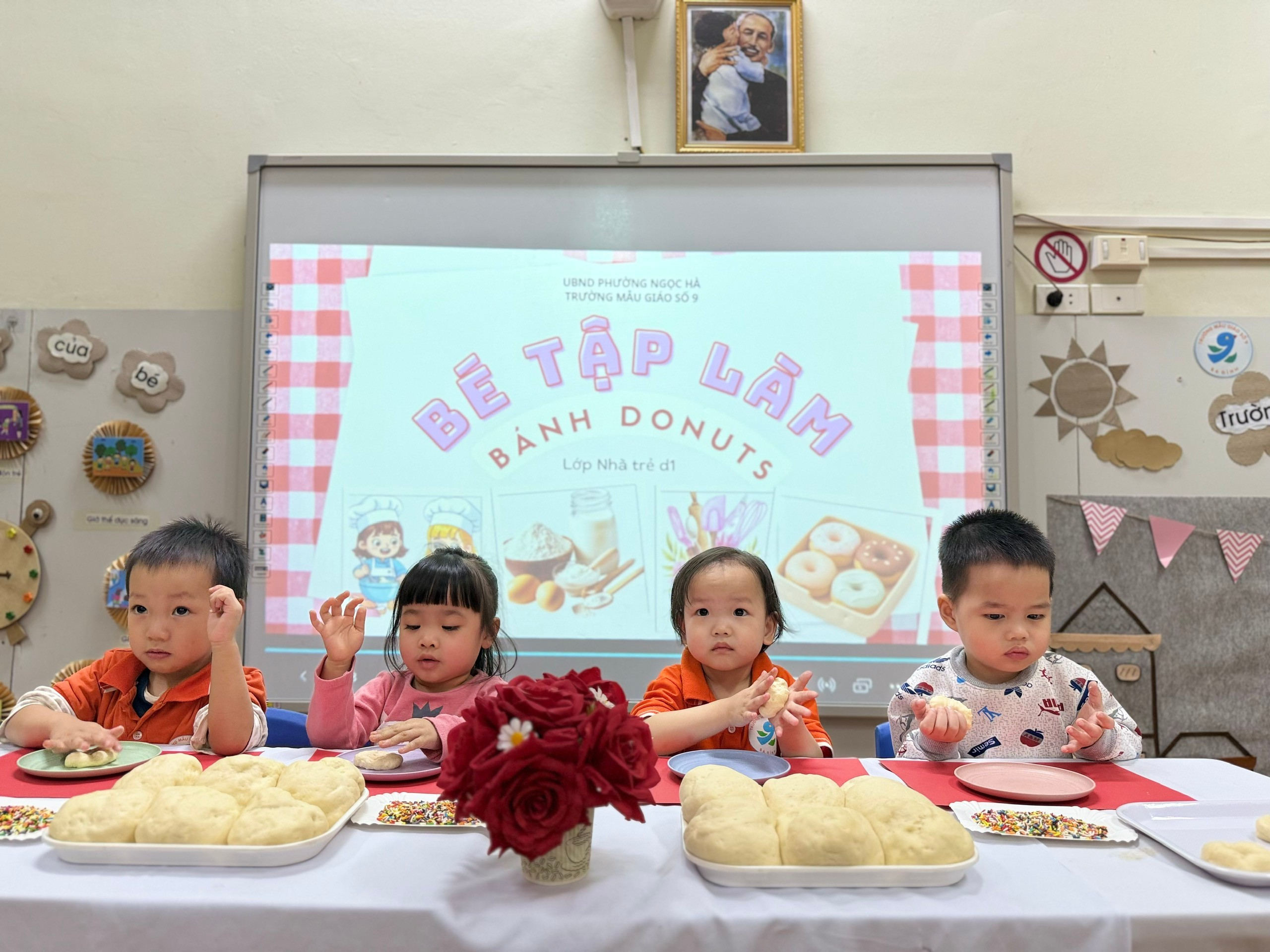 Mở đầu là hoạt động trải nghiệm đầu bếp nhí D2 - bé tập làm bánh Donut. Dưới sự hướng dẫn tận tình của các cô giáo, những “đầu bếp nhí” lớp D2 đã được làm quen với chiếc bánh donut – bánh vòng ngọt ngào, đầy màu sắc. Các bé vô cùng hào hứng khi được quan sát nguyên liệu, lắng nghe cô giới thiệu từng bước và trực tiếp tham gia tạo hình chiếc bánh theo cách của riêng mình. Đôi bàn tay nhỏ xinh, còn vụng về nhưng đầy cố gắng, đã tạo nên những chiếc donut đáng yêu, mang đậm dấu ấn sáng tạo của từng bé.
