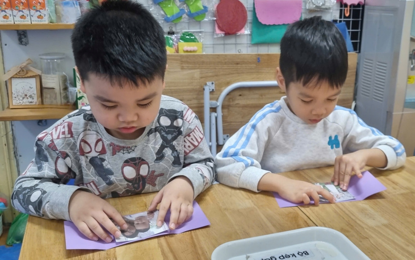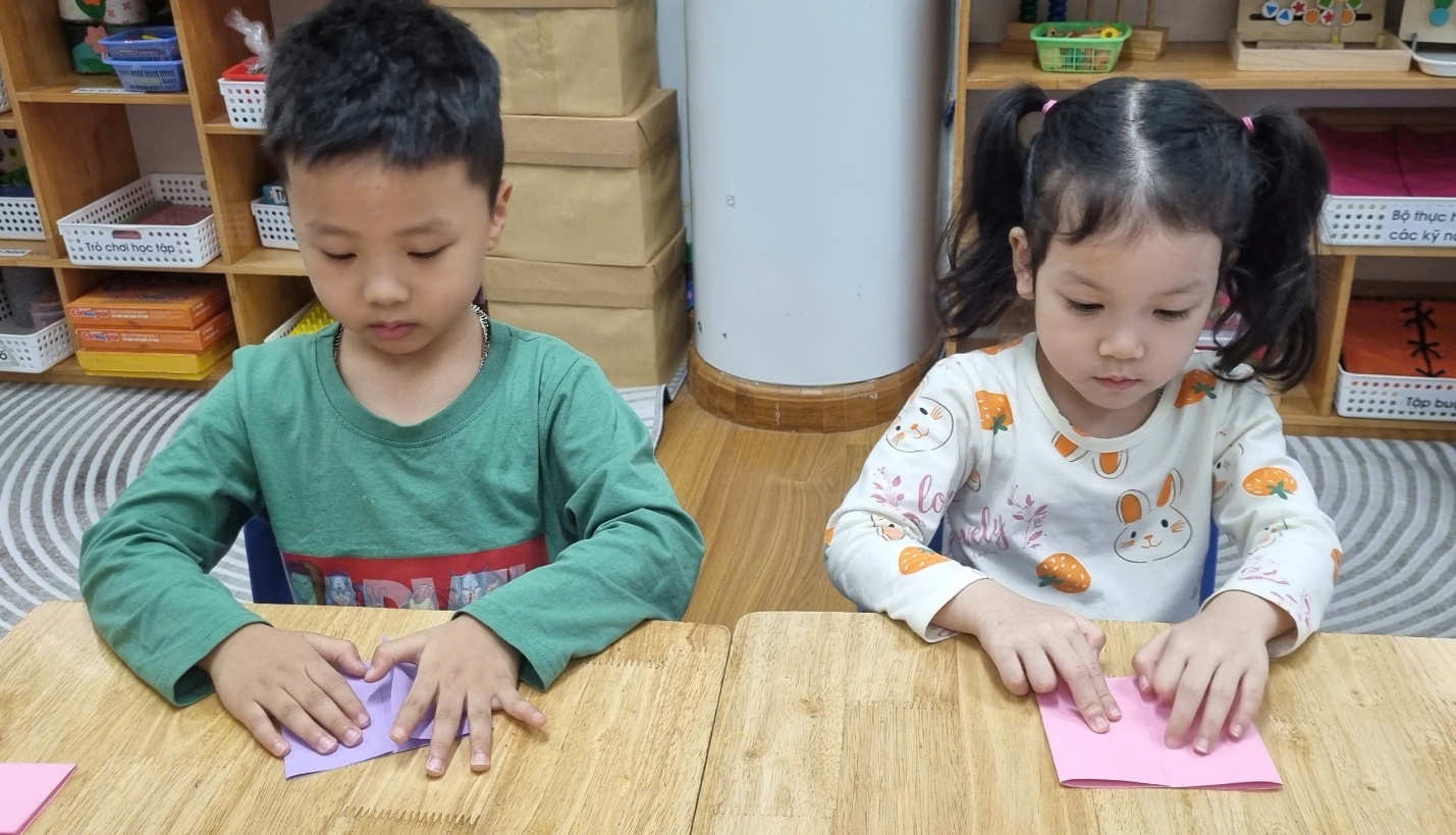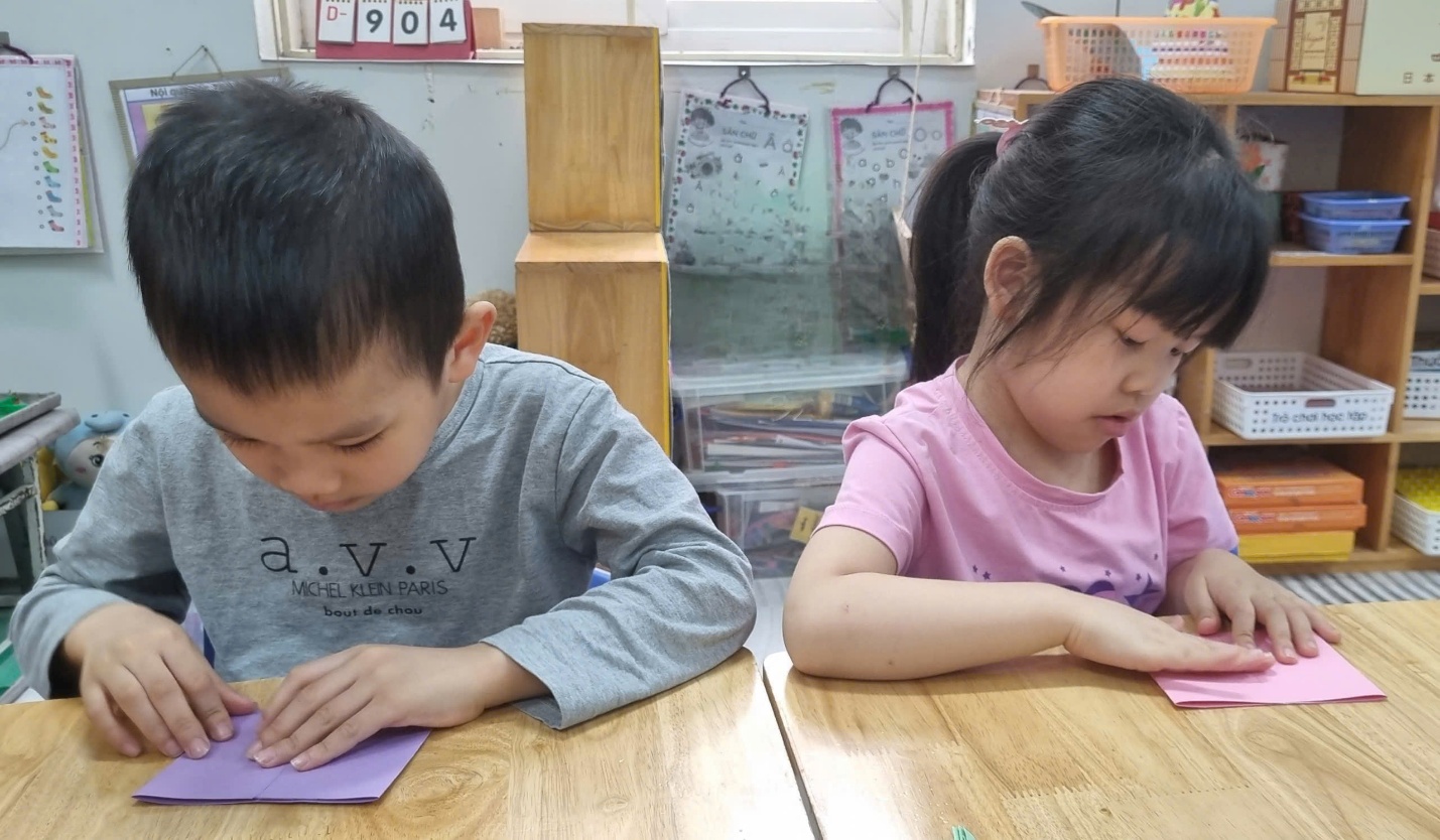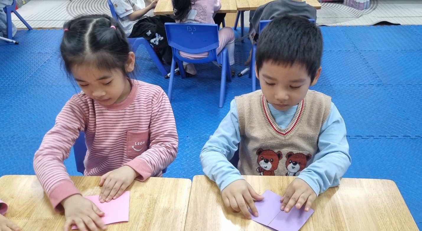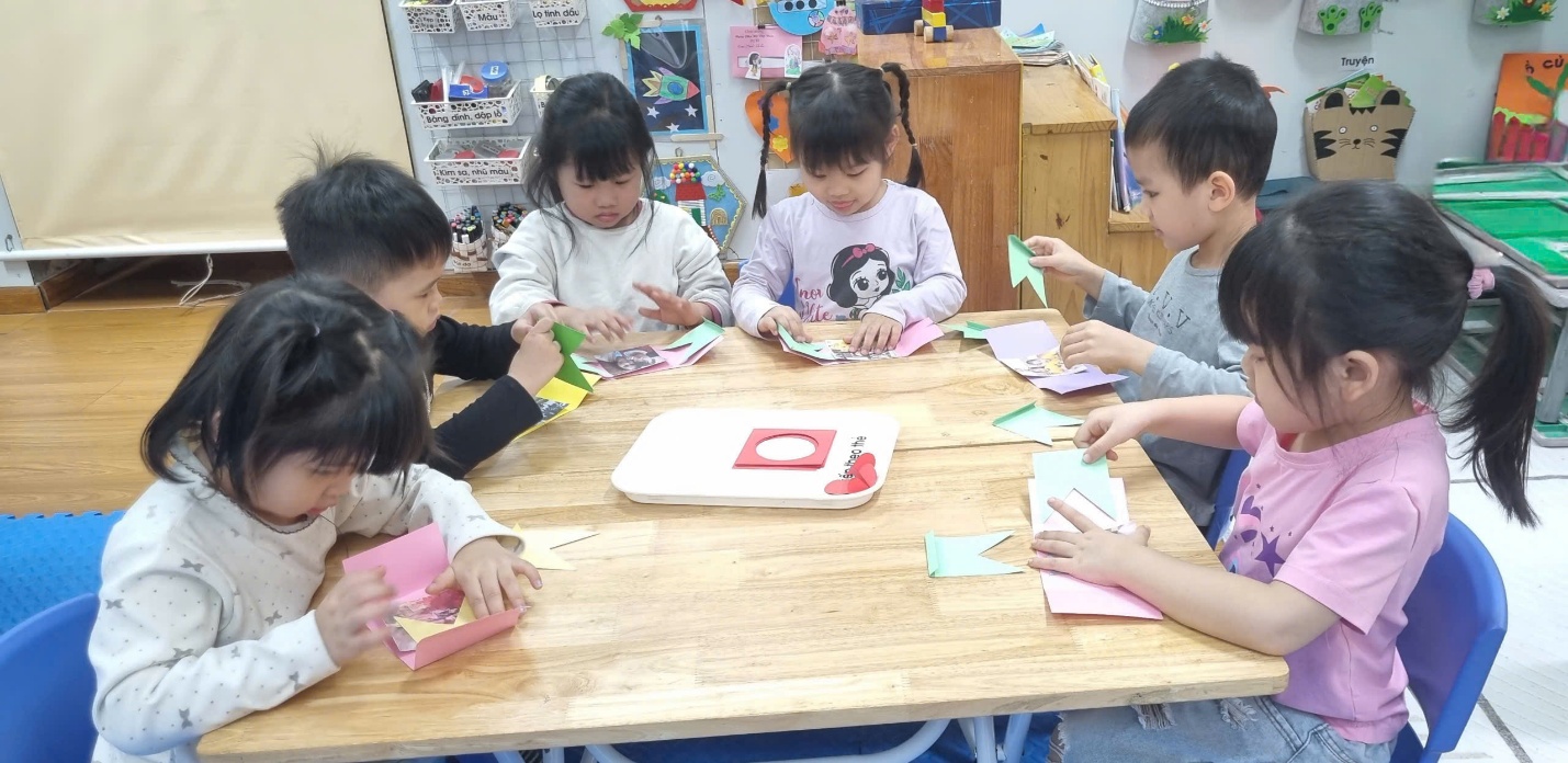 Trong không khí lớp học sôi nổi, từng nhóm trẻ chăm chú gấp giấy, khéo léo dán các hình trang trí và tỉ mỉ sắp xếp những chi tiết nhỏ để hoàn thiện tấm thiệp.