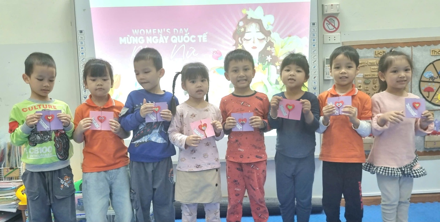 Ngay từ đầu giờ học, cô giáo đã giới thiệu cho các bé ý nghĩa của ngày 8/3 – ngày tôn vinh những người phụ nữ thân yêu trong gia đình và xã hội. Trẻ được quan sát mẫu thiệp, làm quen với các bước thực hiện như gấp giấy, dán hình trang trí, gắn ảnh và tạo các chi tiết trang trí nhỏ xinh như trái tim, hình hoa… Qua sự hướng dẫn tận tình của cô, các bé hào hứng bắt tay vào thực hiện sản phẩm của mình.