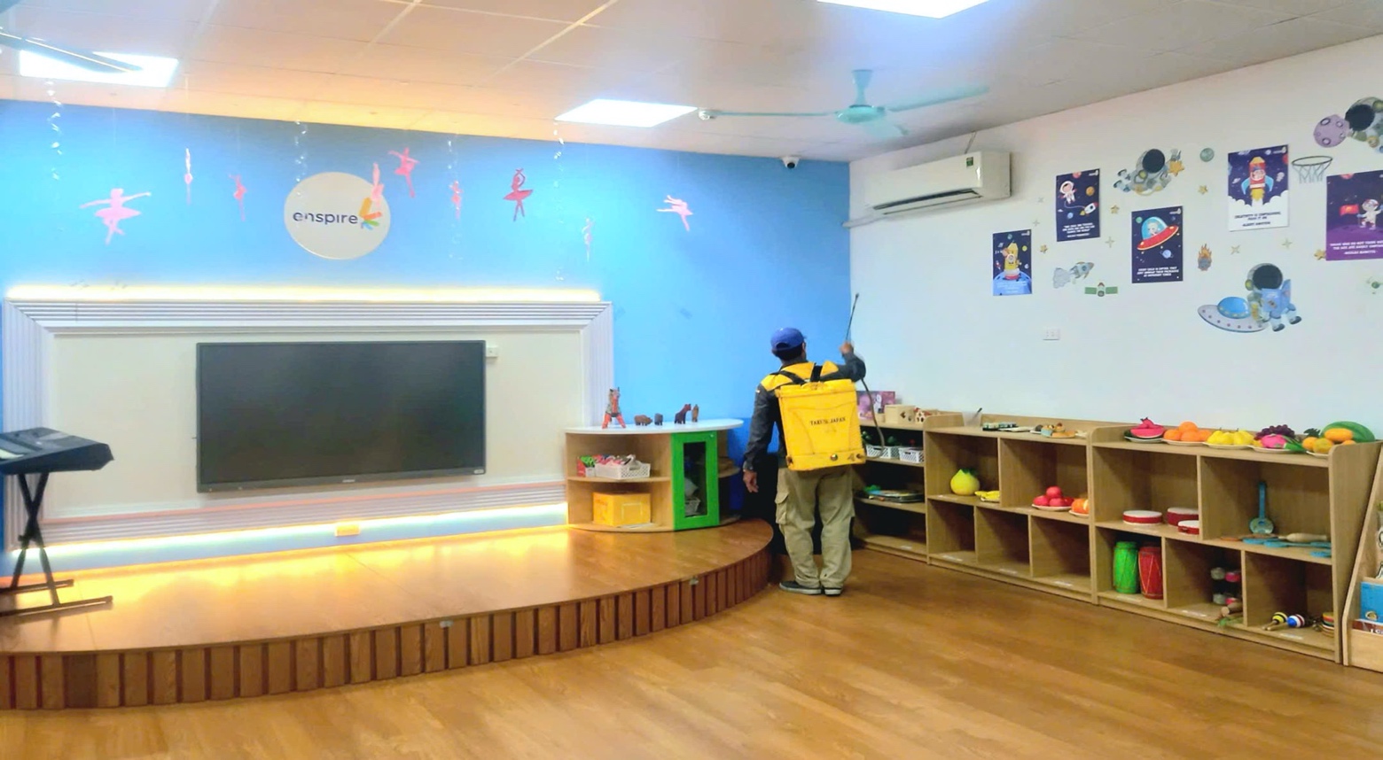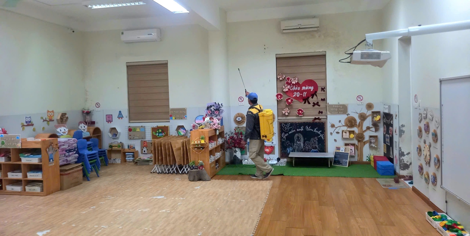 Hoạt động phun muỗi được triển khai tại tất cả các khu vực: phòng học, phòng chức năng, bếp ăn bán trú, hành lang, sân chơi ngoài trời và các góc cây xanh. Nhà trường đã bố trí thời gian hợp lý để đảm bảo không ảnh hưởng đến hoạt động học tập, sinh hoạt của trẻ, đồng thời tuân thủ đầy đủ quy trình kỹ thuật theo khuyến cáo của ngành y tế.
