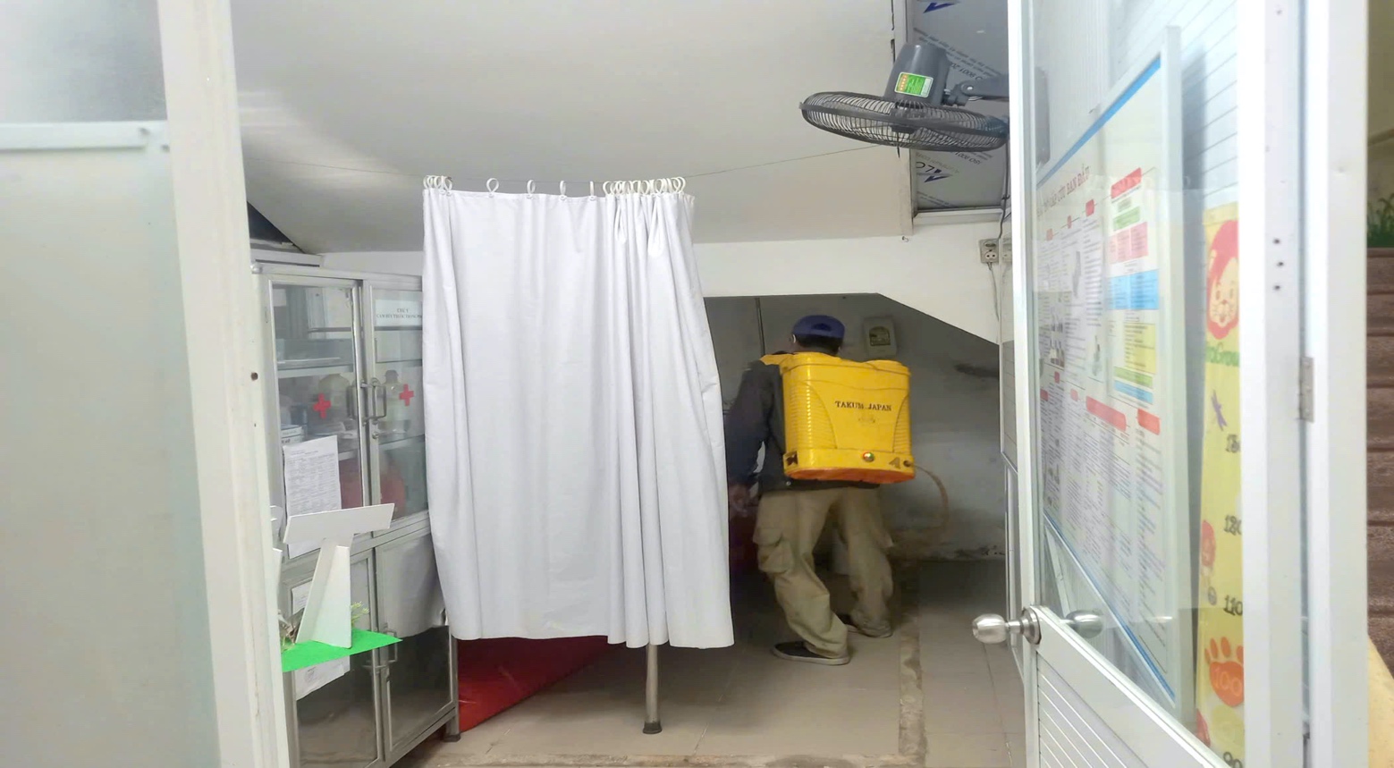 ( Hình ảnh phun thuốc muỗi trong các phòng, lớp)