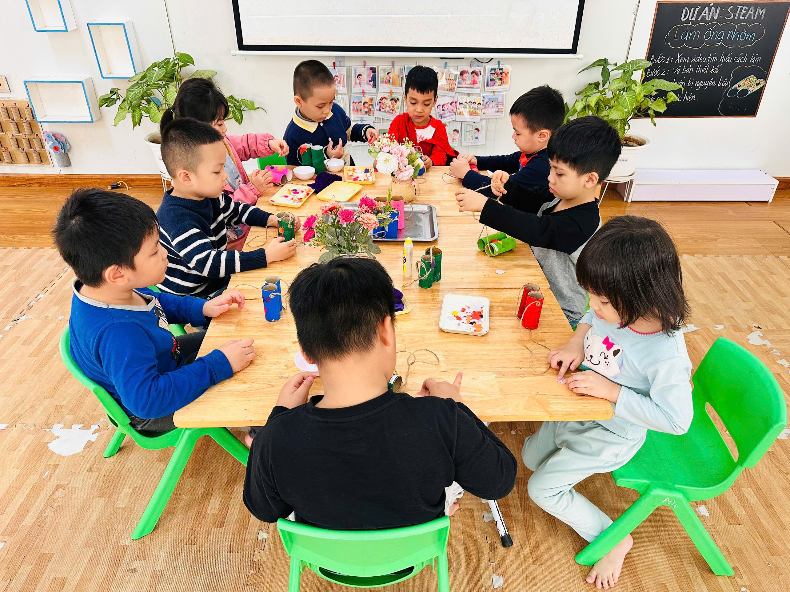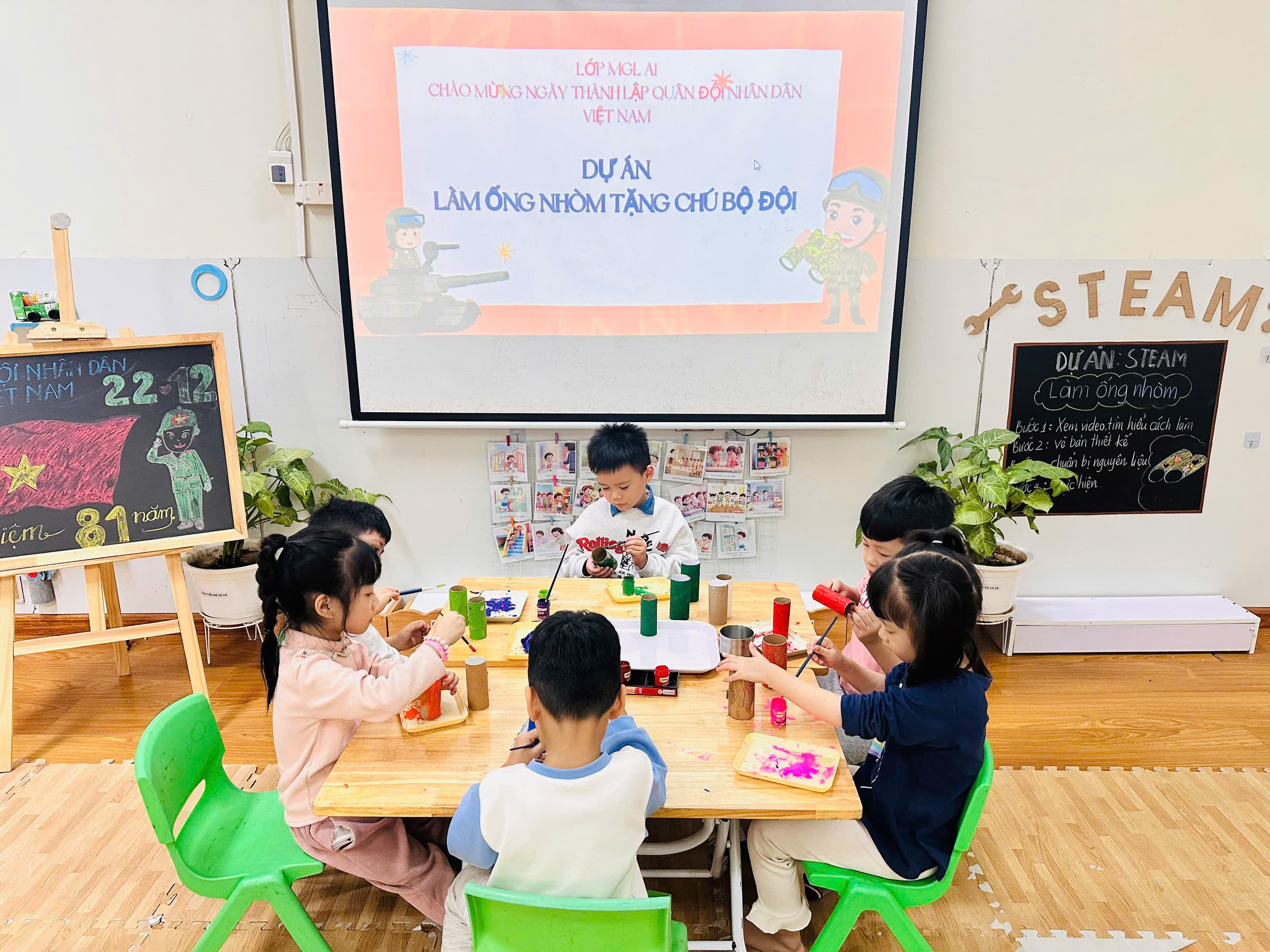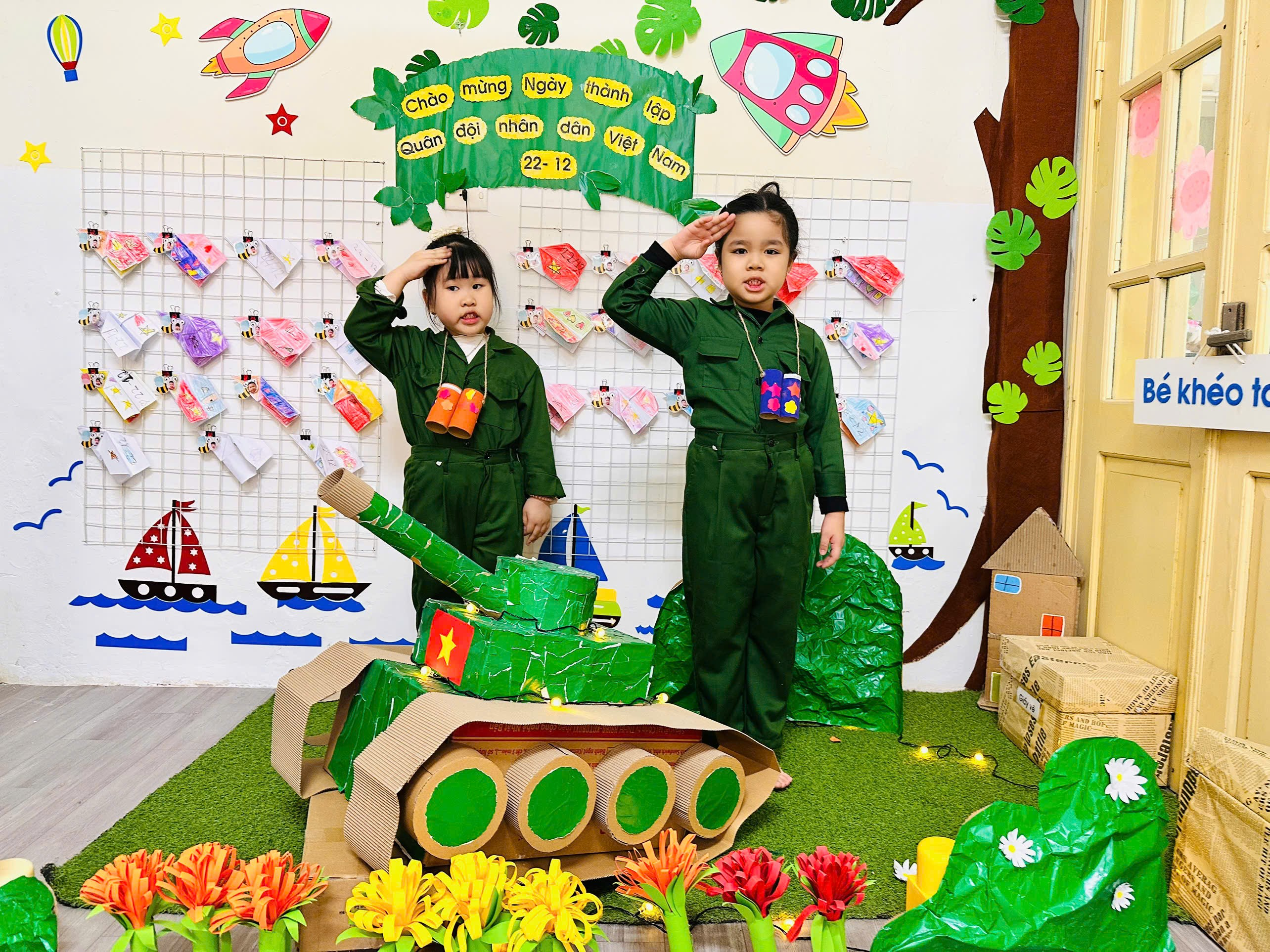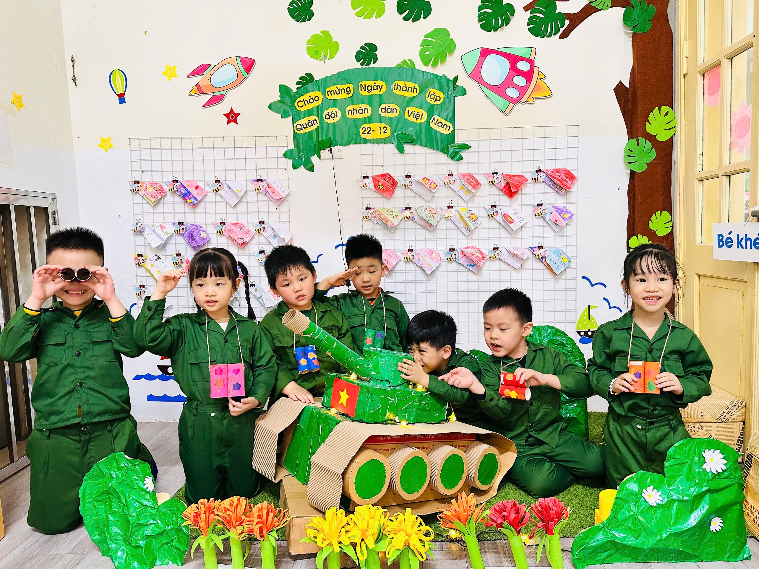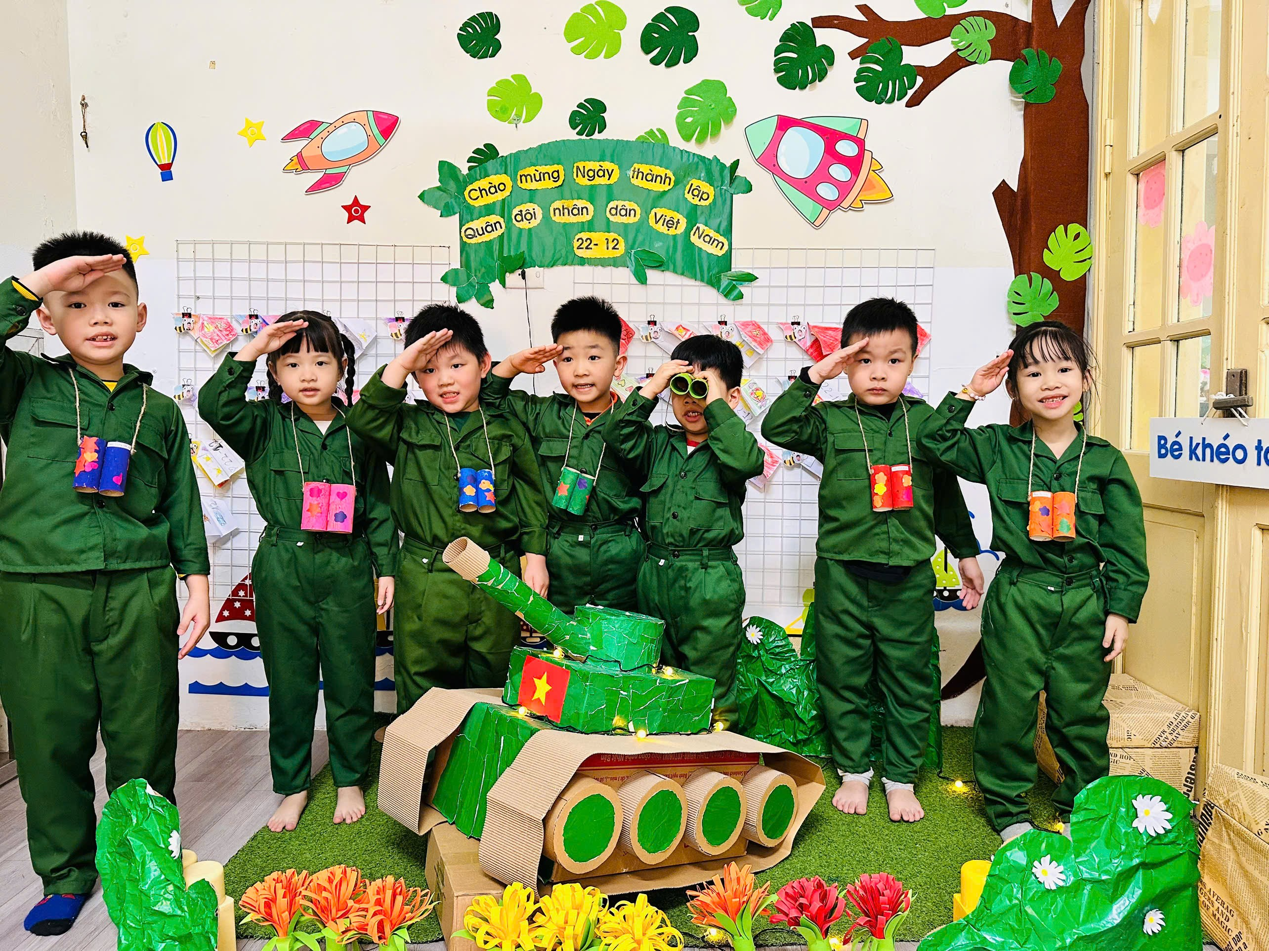Với những nguyên vật liệu gần gũi, dễ tìm như lõi giấy vệ sinh, giấy màu, hồ dán…, dưới sự hướng dẫn tận tình của các cô giáo, các bé đã khéo léo sáng tạo nên những chiếc ống nhòm xinh xắn, ngộ nghĩnh mang màu sắc riêng của mình. Qua hoạt động, trẻ không chỉ được rèn luyện kỹ năng vận động tinh, óc quan sát và trí tưởng tượng, mà còn được tìm hiểu, hóa thân vào hình ảnh chú bộ đội – những người chiến sĩ dũng cảm, luôn ngày đêm bảo vệ Tổ quốc.