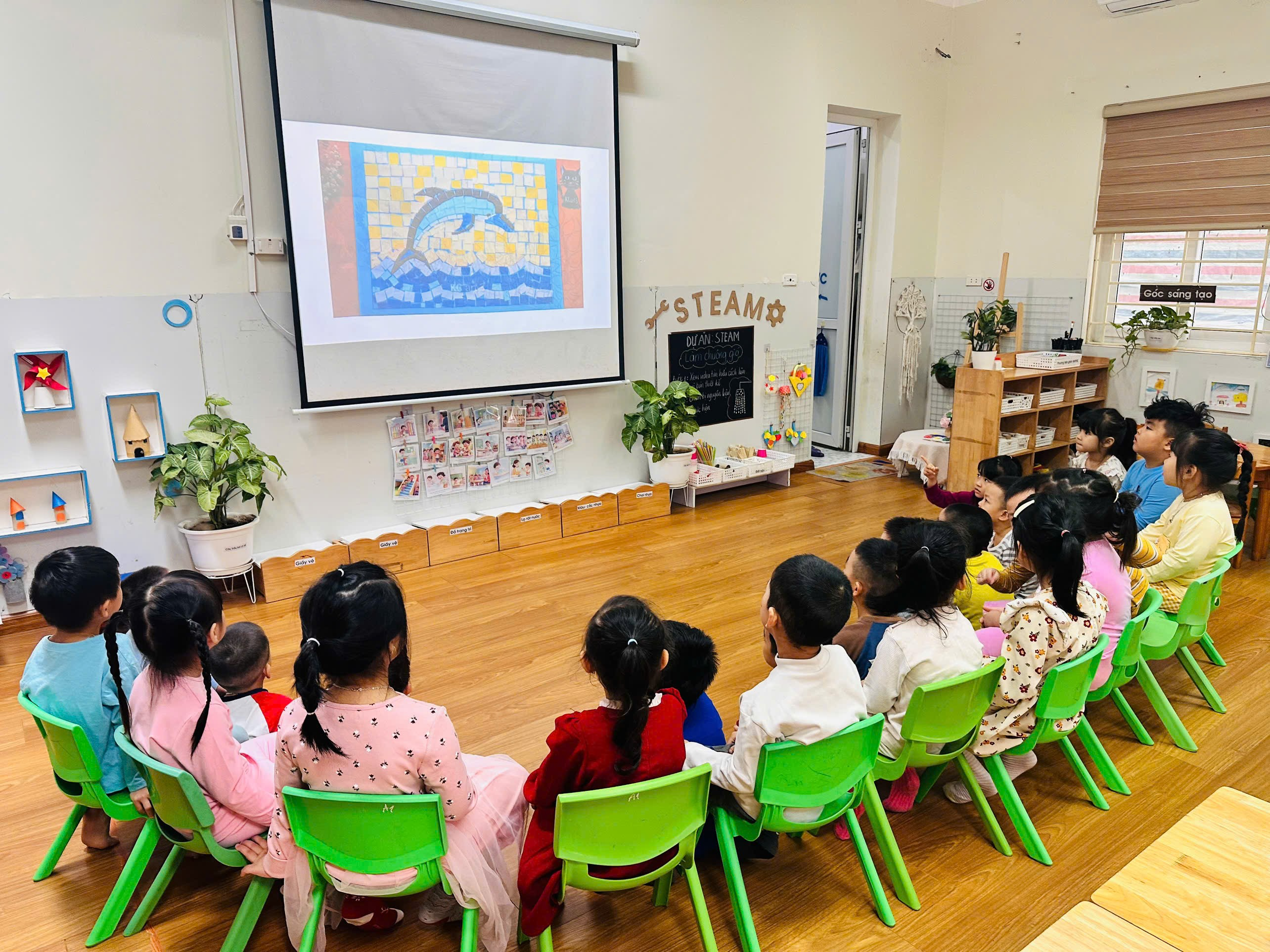 Ngay từ phần mở đầu, các bé đã được xem video với các loại tranh khảm khác nhau. Hình ảnh ấy khiến các con vô cùng thích thú và háo hức bắt tay vào sáng tạo.