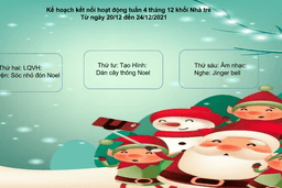 Nhà trường trân trọng gửi tới Quý phụ huynh kế hoạch giáo dục kết nối giữa giáo viên với phụ huynh và học sinh các lớp tuần 4 tháng 12, từ ngày 20/12 đến 24/12. Nhà trường rất mong nhận được sự hỗ trợ, hợp tác từ các gia đình trong hoạt động chăm sóc giáo dục trẻ. Trân trọng cảm ơn!