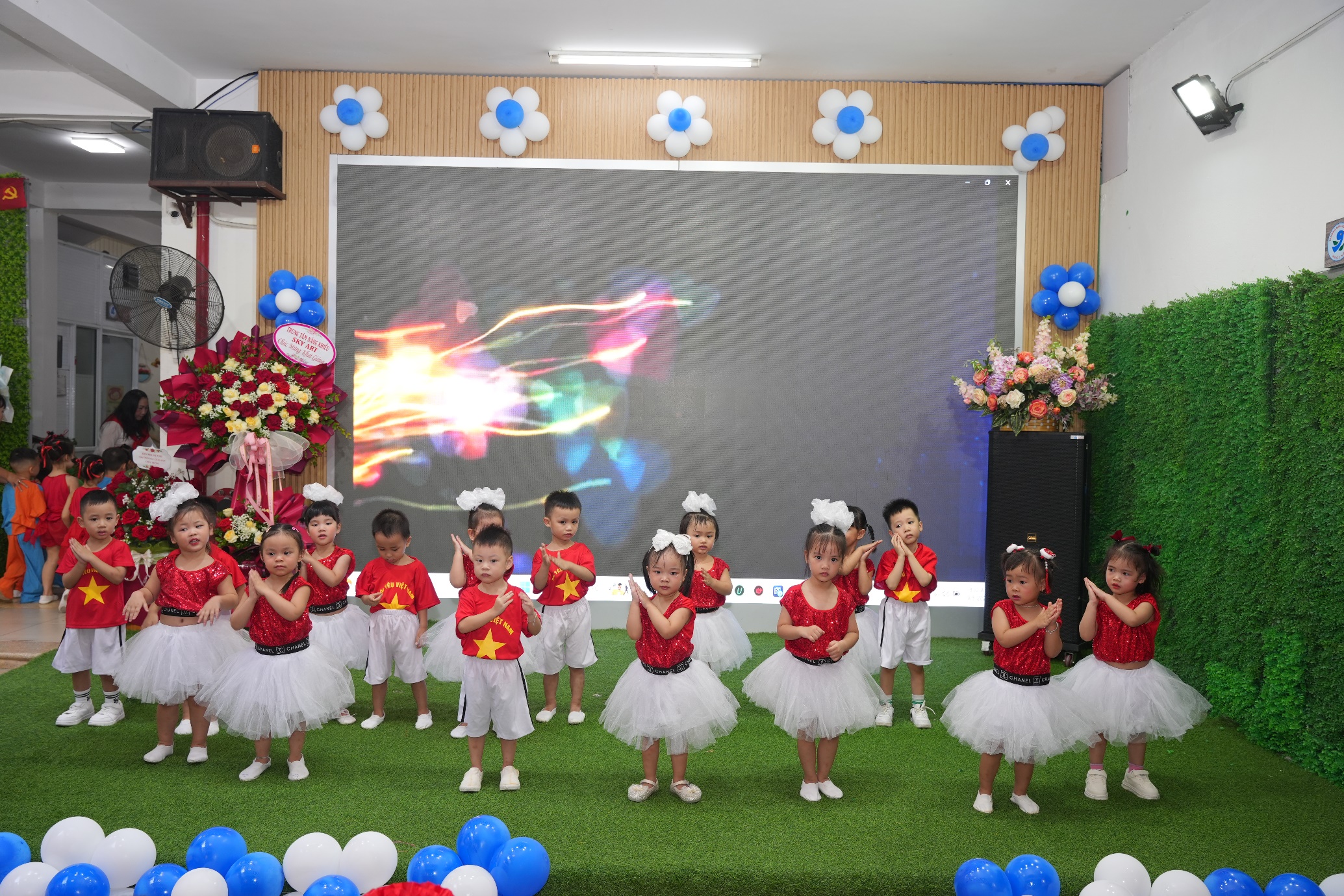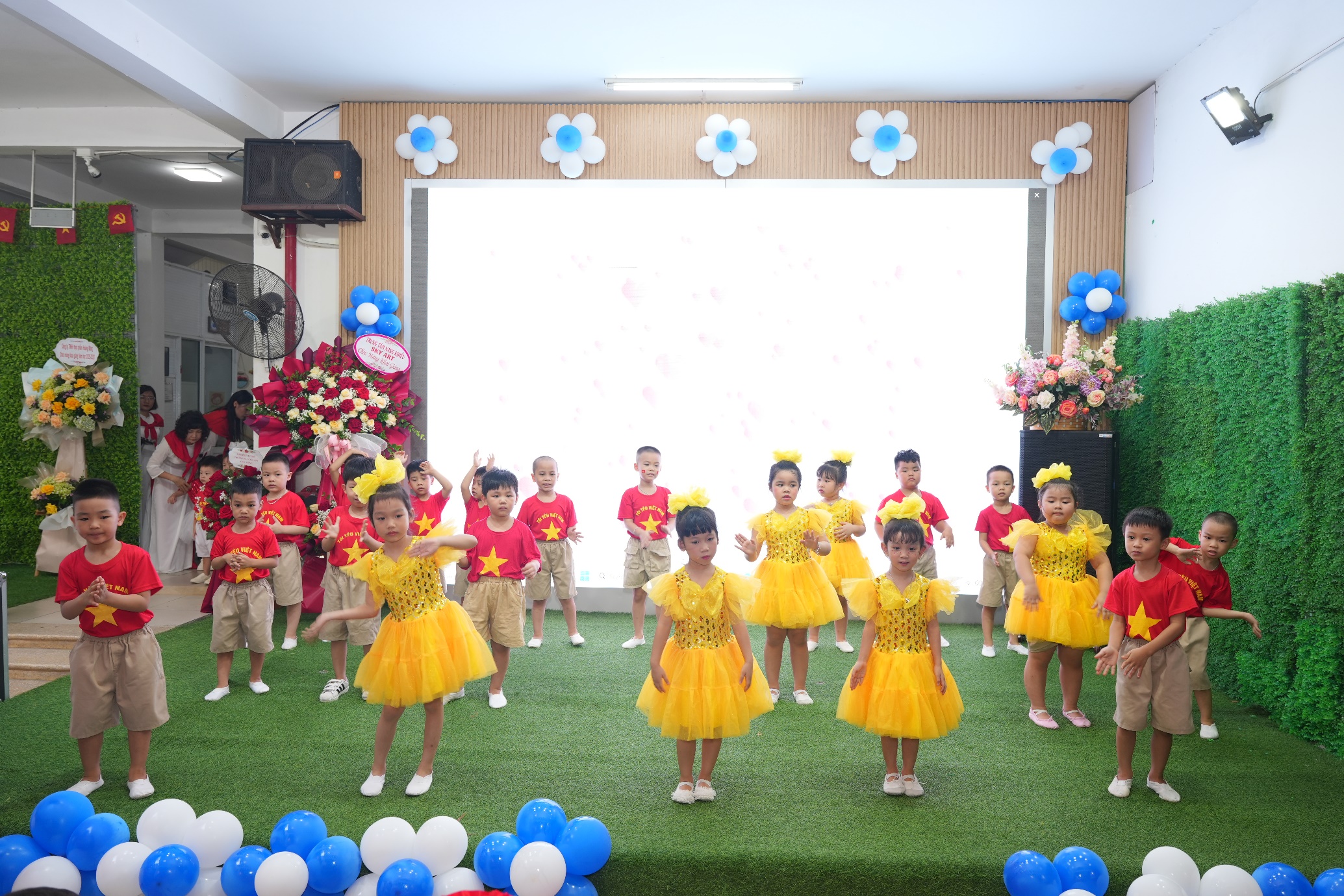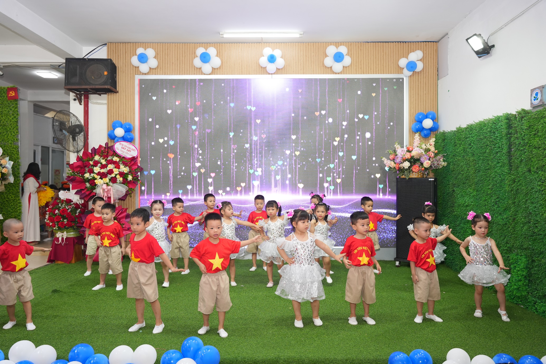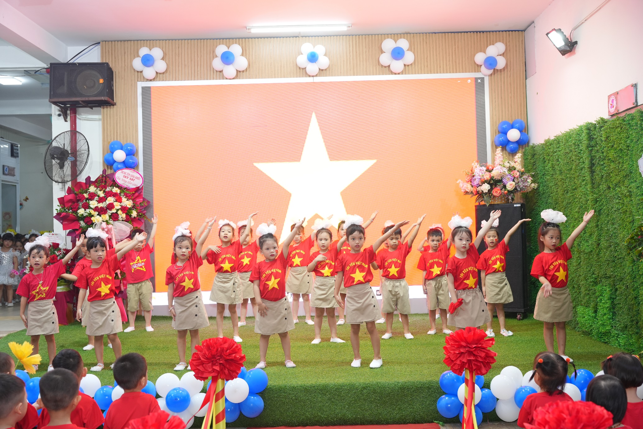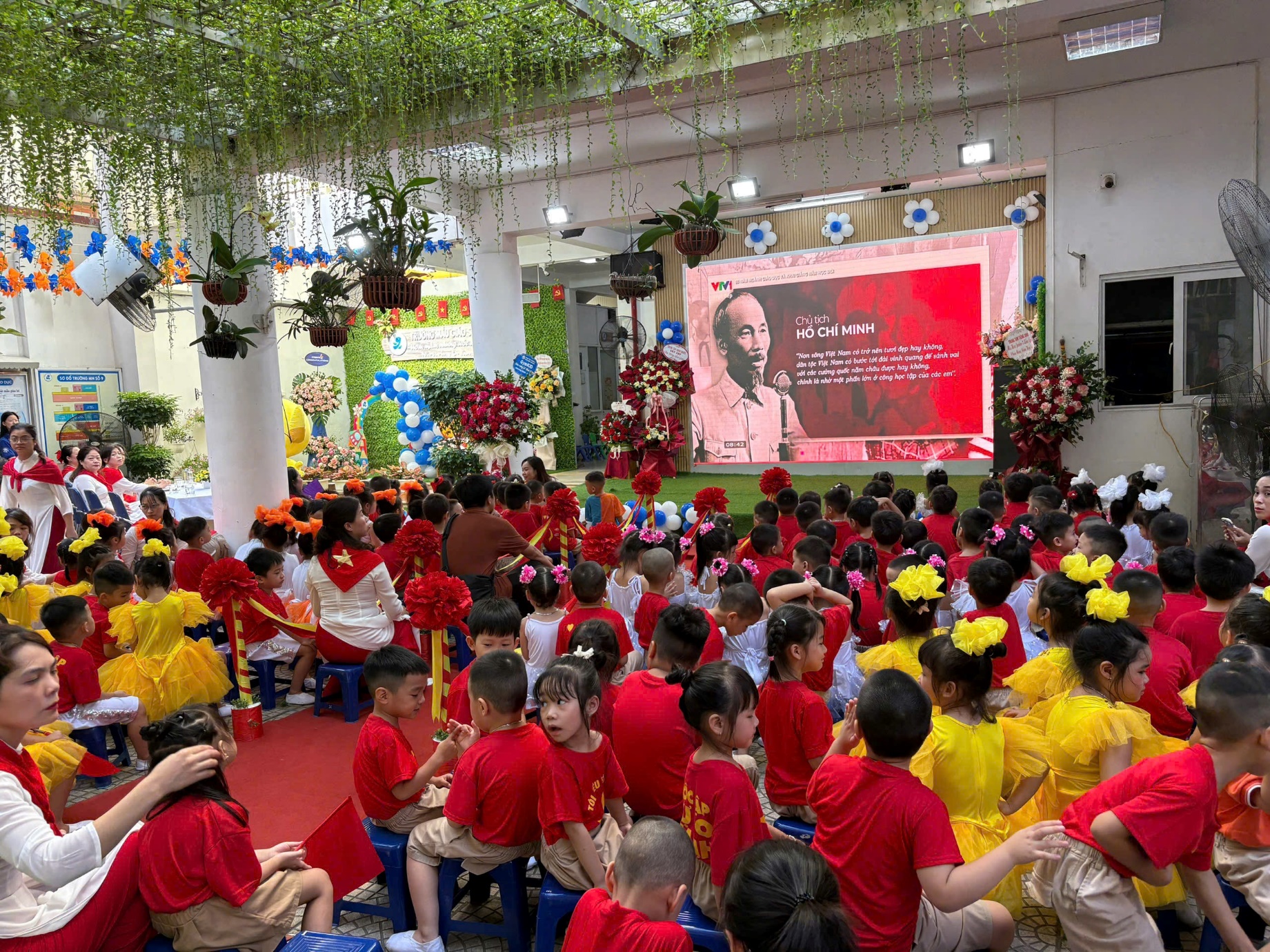 Sau phần lễ trang trọng, các bạn nhỏ lại được đắm mình trong thế giới âm nhạc và vũ điệu. Các tiết mục văn nghệ như “Vui đến trường” (lớp A1), “Dung dăng dung dẻ” (lớp B2), hay “Khám phá thế giới tuyệt vời” (lớp B3) tiếp tục khuấy động không khí, tạo nên một sân trường rộn rã tiếng cười. Đặc biệt, tiết mục “Như có Bác trong ngày vui đại thắng” với sự tham gia của toàn trường đã khép lại phần văn nghệ một cách đầy tự hào và xúc động. Cuối cùng, toàn thể giáo viên và học sinh cùng nhau hướng về màn hình lớn để theo dõi lễ khai giảng được truyền hình trực tiếp trên sóng của Đài Truyền hình Việt Nam, một khoảnh khắc vô cùng ý nghĩa.