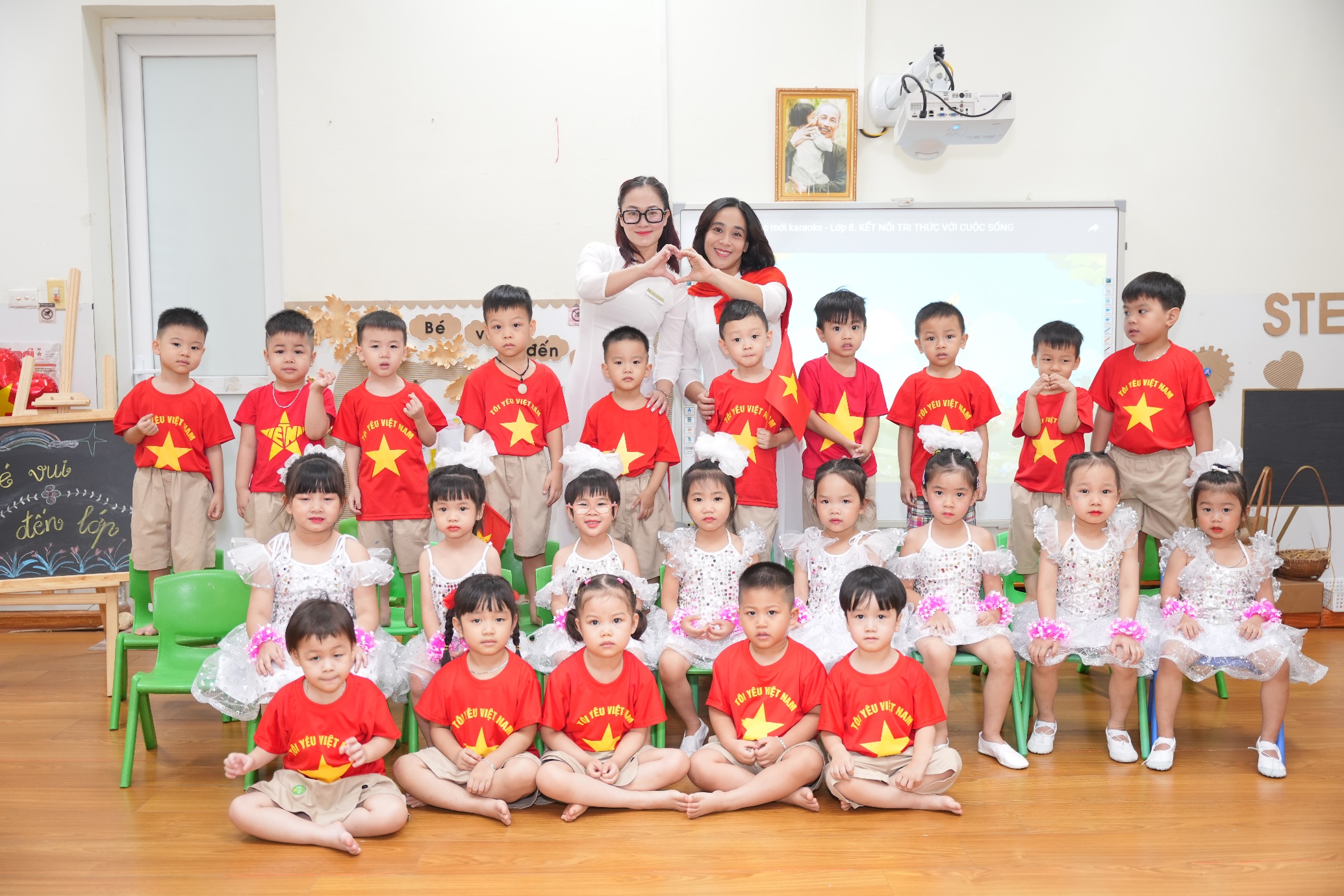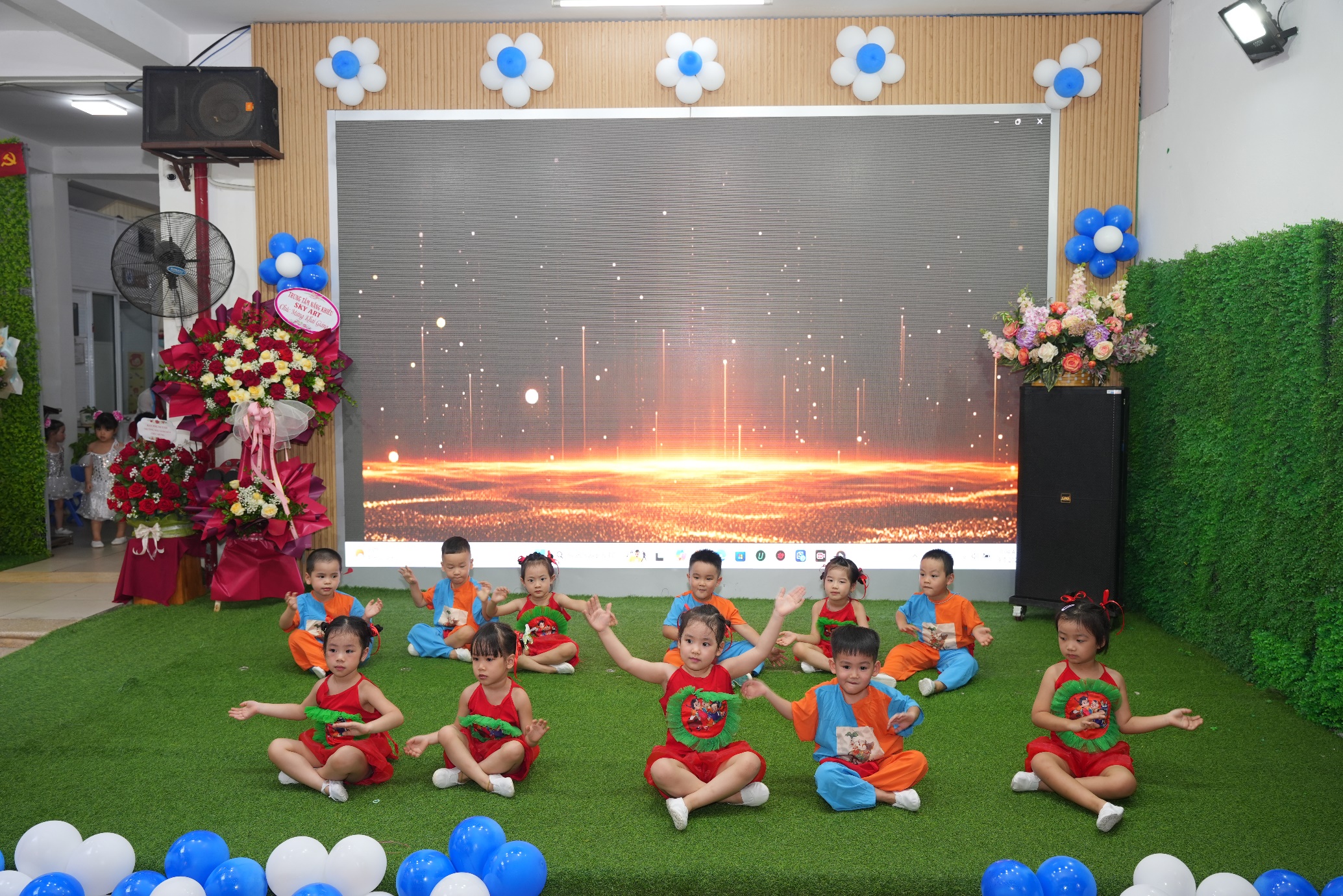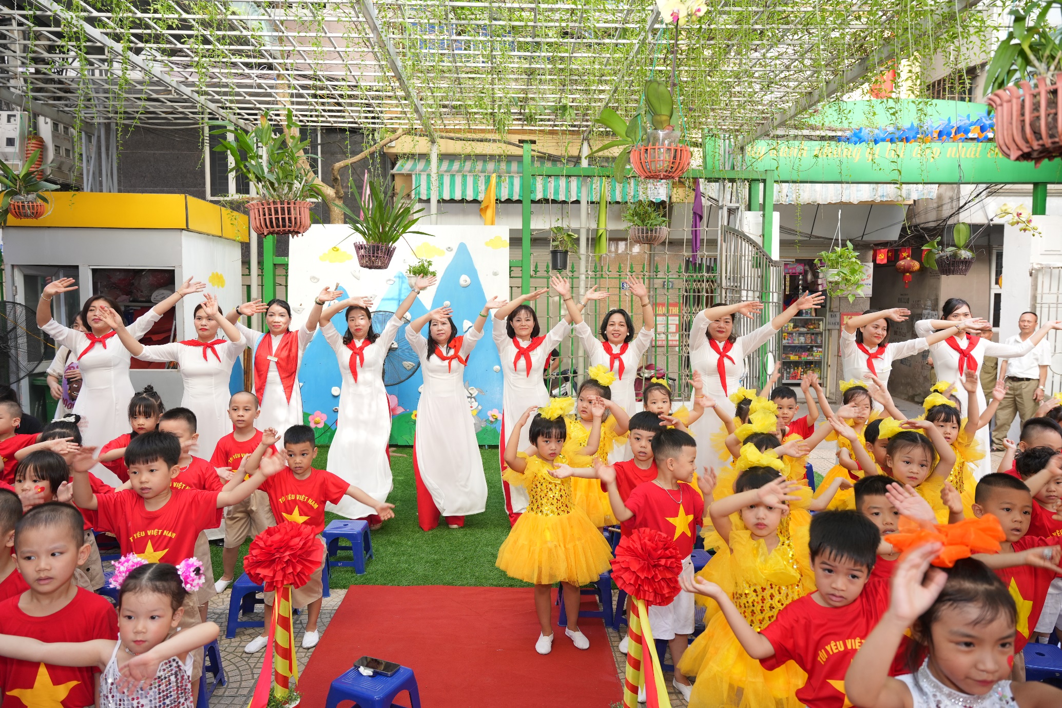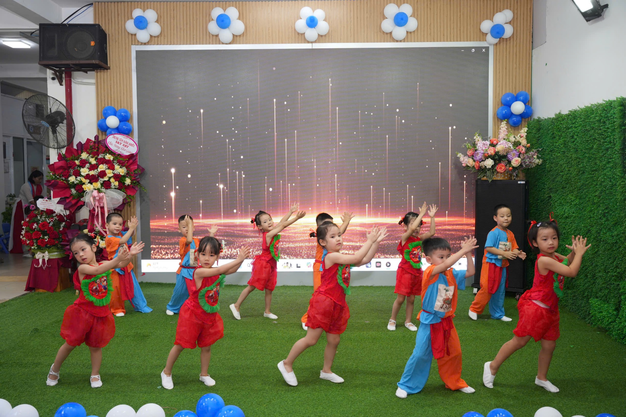 Sau phần lễ trang trọng, các bạn nhỏ lại được đắm mình trong thế giới âm nhạc và vũ điệu. Các tiết mục văn nghệ như “Vui đến trường” (lớp A1), “Dung dăng dung dẻ” (lớp B2), hay “Khám phá thế giới tuyệt vời” (lớp B3) tiếp tục khuấy động không khí, tạo nên một sân trường rộn rã tiếng cười. Đặc biệt, tiết mục “Như có Bác trong ngày vui đại thắng” với sự tham gia của toàn trường đã khép lại phần văn nghệ một cách đầy tự hào và xúc động. Cuối cùng, toàn thể giáo viên và học sinh cùng nhau hướng về màn hình lớn để theo dõi lễ khai giảng được truyền hình trực tiếp trên sóng của Đài Truyền hình Việt Nam, một khoảnh khắc vô cùng ý nghĩa.