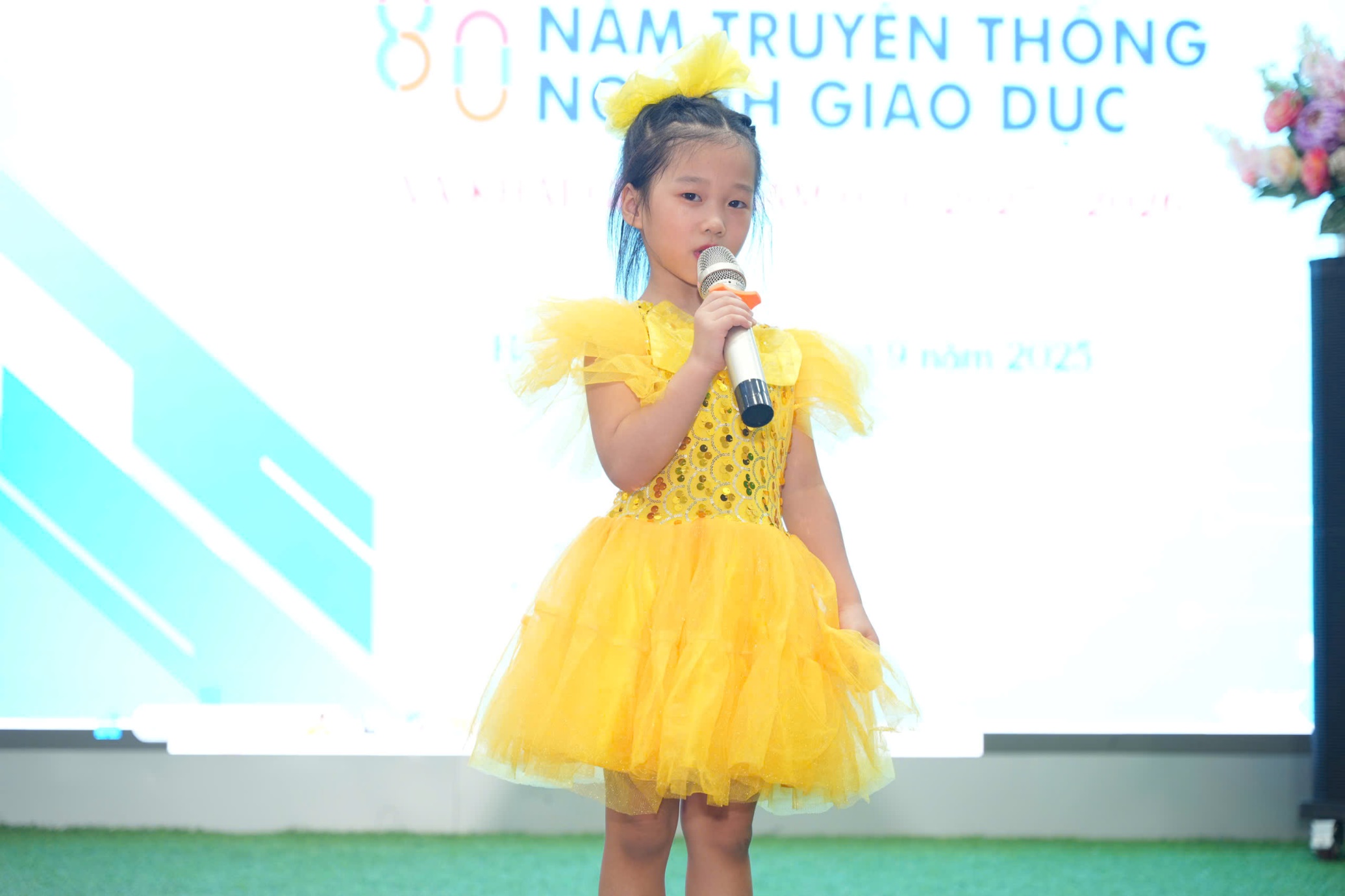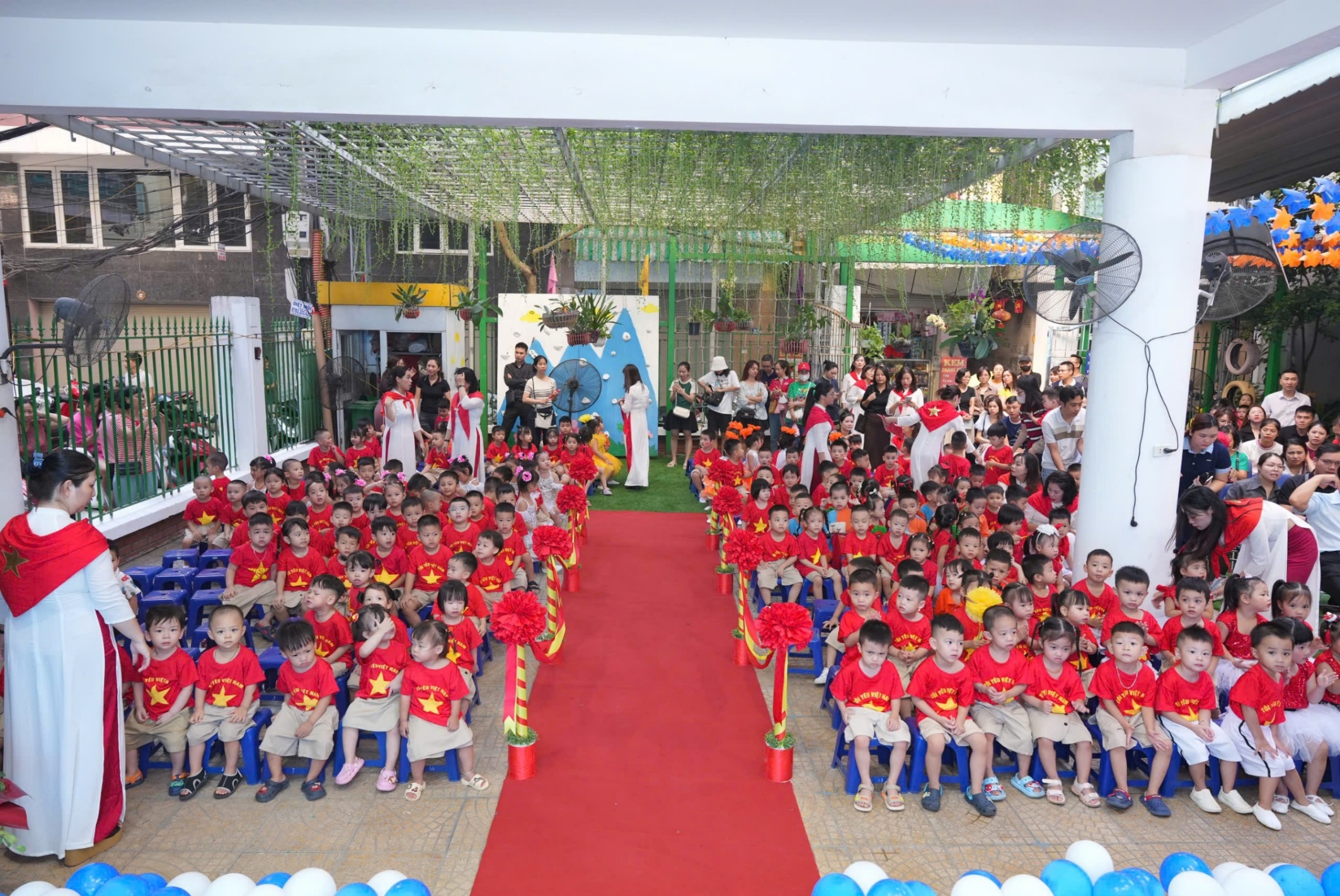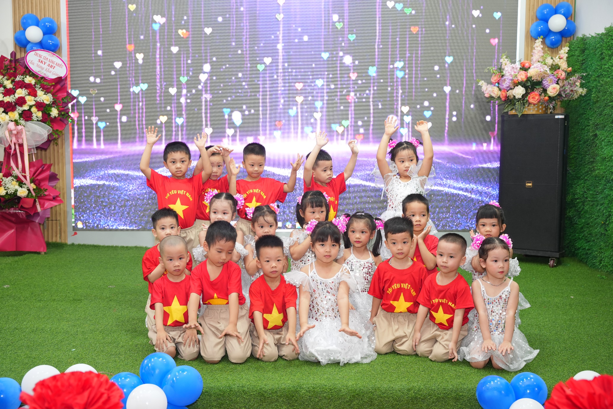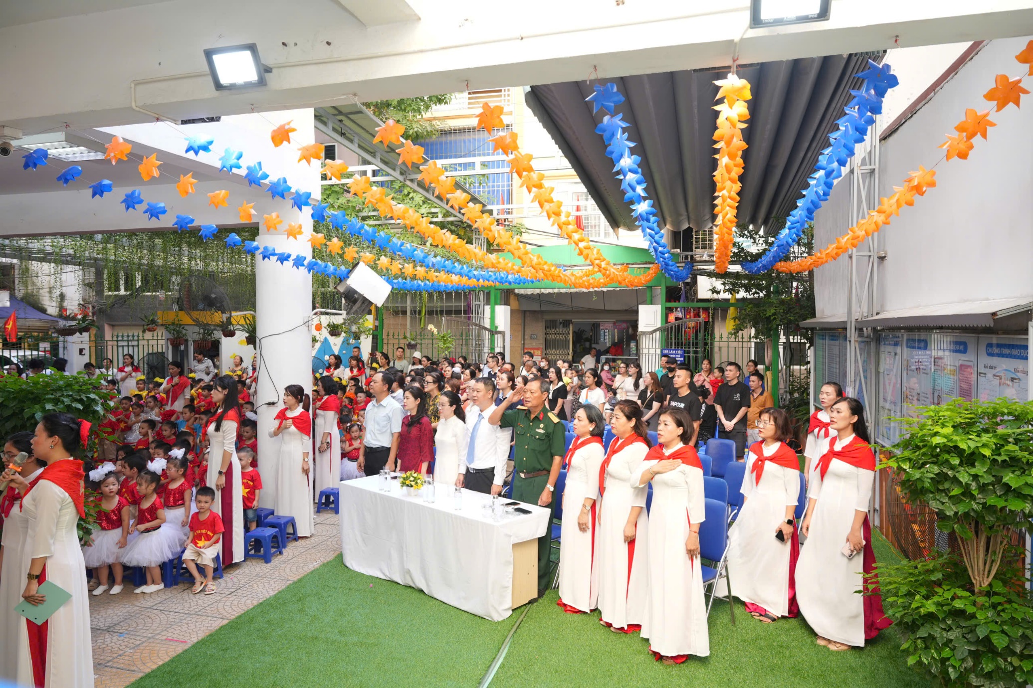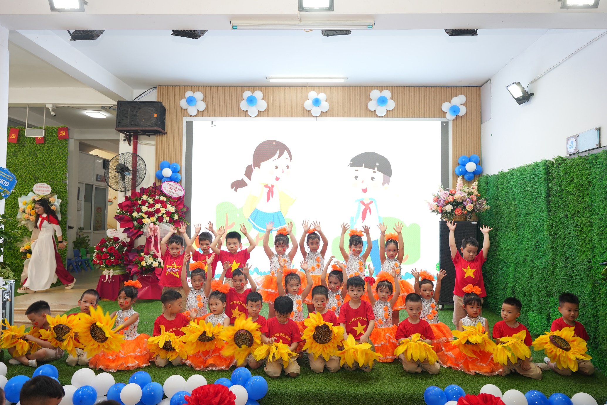 Sau phần lễ trang trọng, các bạn nhỏ lại được đắm mình trong thế giới âm nhạc và vũ điệu. Các tiết mục văn nghệ như “Vui đến trường” (lớp A1), “Dung dăng dung dẻ” (lớp B2), hay “Khám phá thế giới tuyệt vời” (lớp B3) tiếp tục khuấy động không khí, tạo nên một sân trường rộn rã tiếng cười. Đặc biệt, tiết mục “Như có Bác trong ngày vui đại thắng” với sự tham gia của toàn trường đã khép lại phần văn nghệ một cách đầy tự hào và xúc động. Cuối cùng, toàn thể giáo viên và học sinh cùng nhau hướng về màn hình lớn để theo dõi lễ khai giảng được truyền hình trực tiếp trên sóng của Đài Truyền hình Việt Nam, một khoảnh khắc vô cùng ý nghĩa.