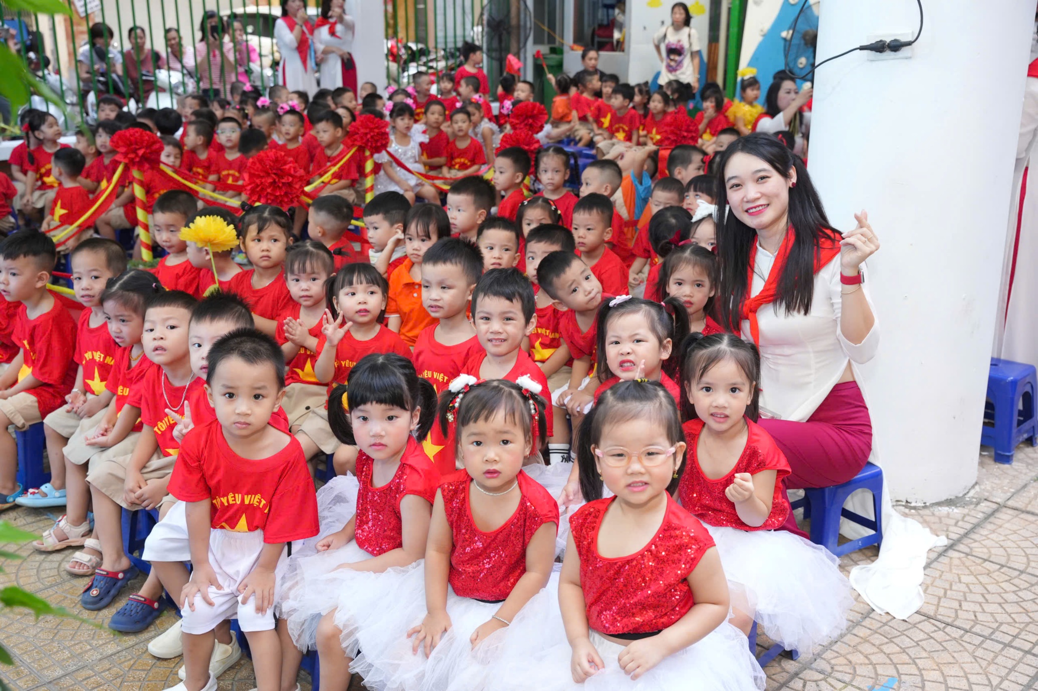 Mở đầu chương trình, các bạn nhỏ đã mang đến những tiết mục văn nghệ đặc sắc, sôi động. Từ điệu múa “Dậy đi thôi” của lớp B1, “Chào năm học mới” của lớp A2 đến tiết mục dân vũ “Việt Nam ơi” của lớp MGL, tất cả đều thể hiện sự hồn nhiên, trong sáng và niềm vui khi được trở lại trường. Sân khấu trở nên bừng sáng với những nụ cười rạng rỡ của các cô giáo và học sinh, xóa tan mọi lo lắng, hồi hộp ban đầu.