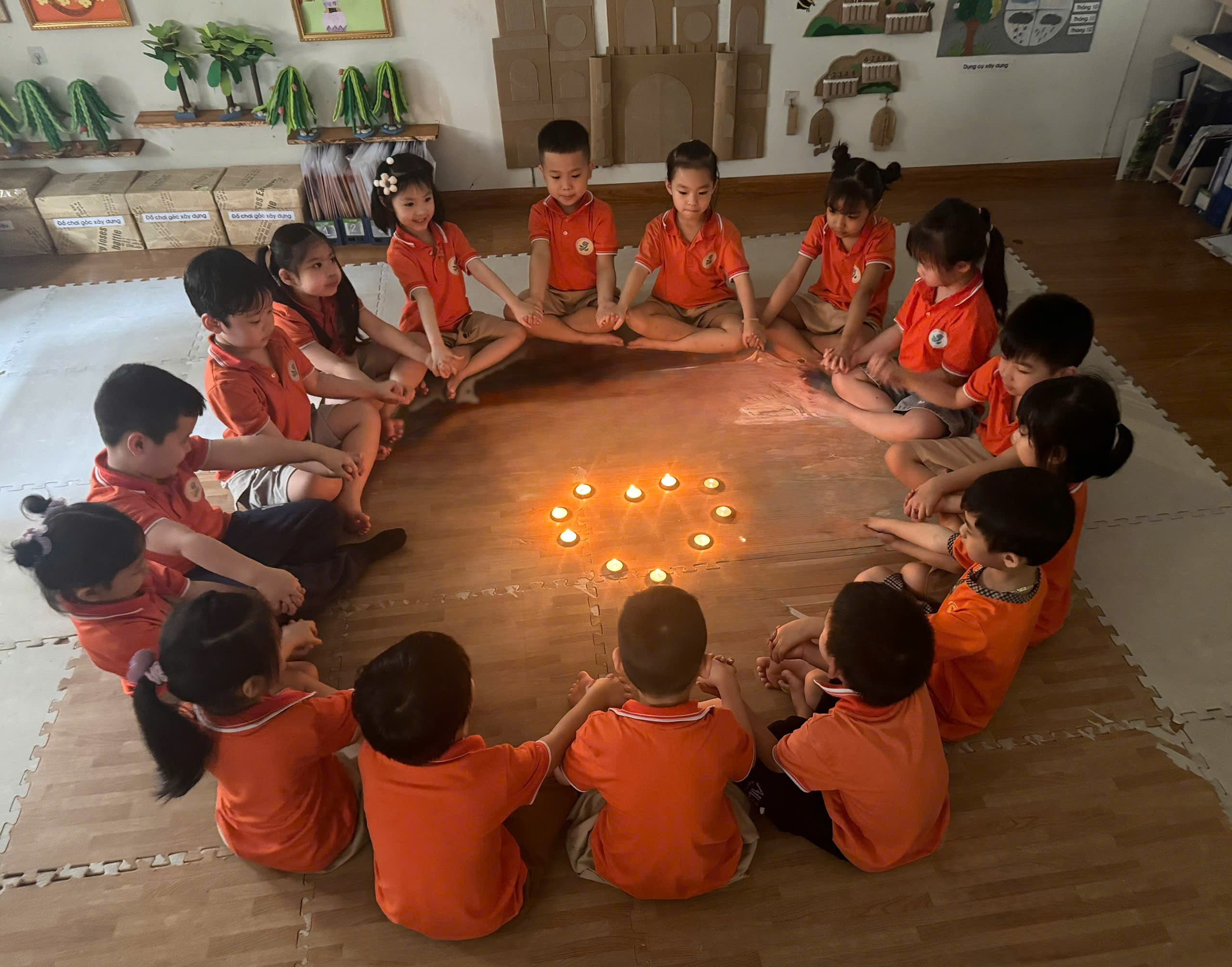 Khoảnh khắc mong chờ nhất chính là khi cả lớp cùng thực hành "Tắt đèn". Thay vì bóng đèn, các cô đã thắp lên những ngọn nến lung linh. Trong không gian ấm áp và huyền ảo, các bé lớp A2 đã trải nghiệm cảm giác không sử dụng điện. Ánh sáng ấm từ nến không chỉ chiếu sáng lớp học mà còn thắp sáng tình yêu Trái đất trong mỗi trái tim nhỏ. Các con được hiểu rõ hơn về giá trị của điện năng và tầm quan trọng của việc tiết kiệm thông qua trải nghiệm thực tế này.