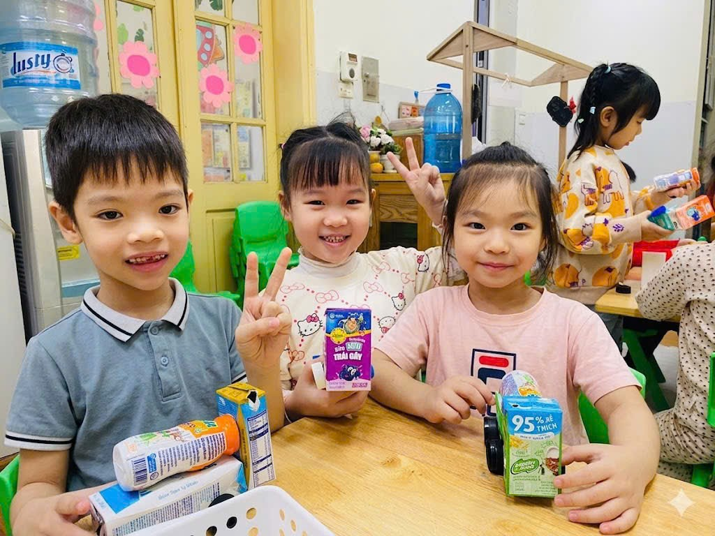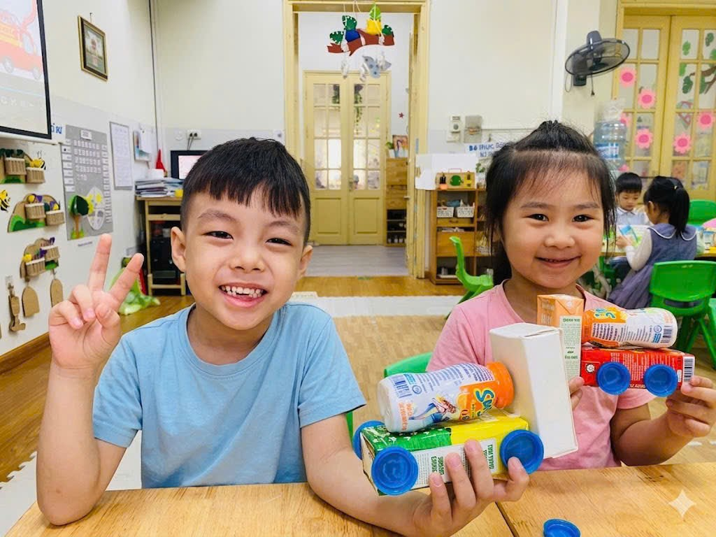 Không chỉ dừng lại ở việc tiết kiệm điện, các bạn nhỏ lớp A2 còn học cách trân trọng nguồn tài nguyên thông qua hoạt động tái chế đầy thú vị. Từ những vỏ hộp sữa, lõi giấy hay chai nhựa cũ vốn định bỏ đi, dưới sự hướng dẫn của cô giáo và sự sáng tạo không giới hạn, các con đã "biến hóa" chúng thành những món đồ chơi ngộ nghĩnh như ô tô, máy bay hay hộp đựng bút xinh xắn. Qua đó, các bé hiểu rằng rác thải nếu biết tận dụng sẽ có một "vòng đời thứ hai" hữu ích, giúp giảm bớt áp lực cho môi trường và hạn chế rác thải ra ngoài tự nhiên.
