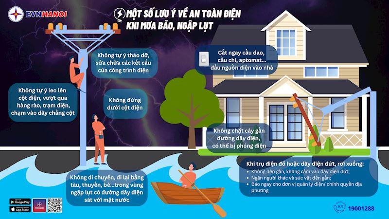 Nếu phát hiện sự cố điện do thiên tai gây ra, khách hàng thông báo ngay cho Trung tâm Chăm sóc khách hàng của EVNHANOI (Tổng đài 19001288 phục vụ 24/7) để kịp thời khắc phục, giảm thiểu nguy cơ thiệt hại về người và tài sản.