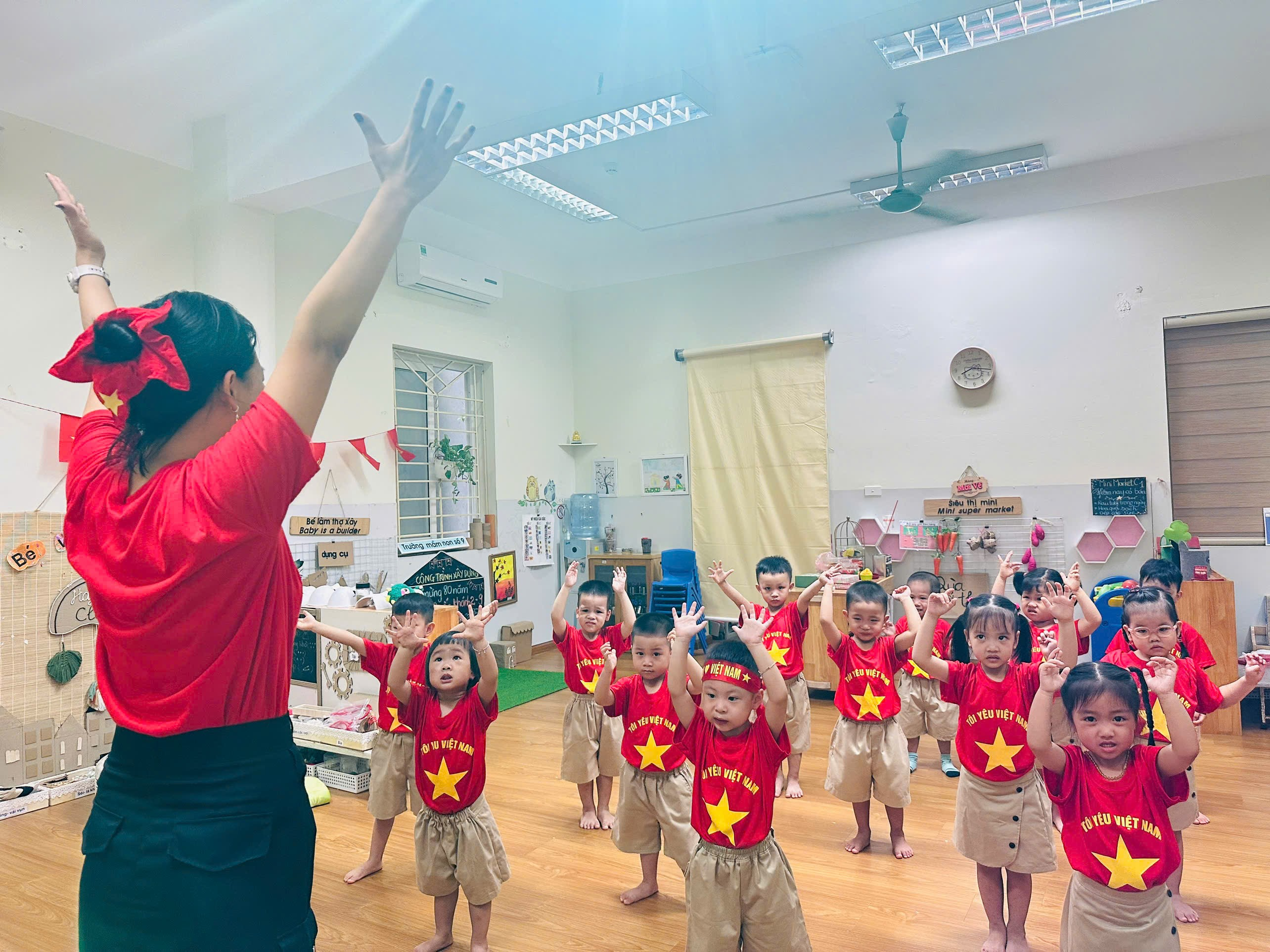 Bên cạnh đó, không khí ngày Quốc khánh còn được khuấy động bởi những giai điệu vui tươi. Các bé đã cùng nhau biểu diễn những tiết mục văn nghệ đặc sắc, múa hát chào mừng ngày 2/9. Tiếng hát trong trẻo, những động tác múa hồn nhiên đã mang đến niềm vui, niềm tự hào cho các cô và phụ huynh.