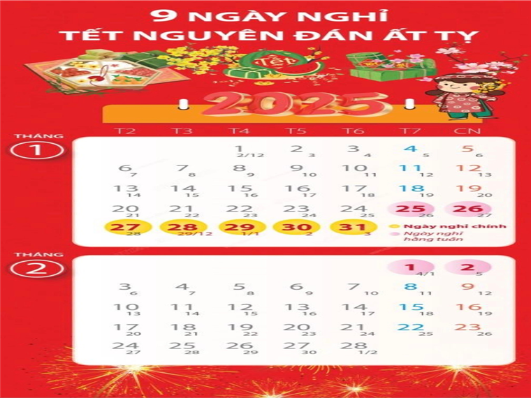 Lịch nghỉ Tết Nguyên đán Ất Tỵ 2025