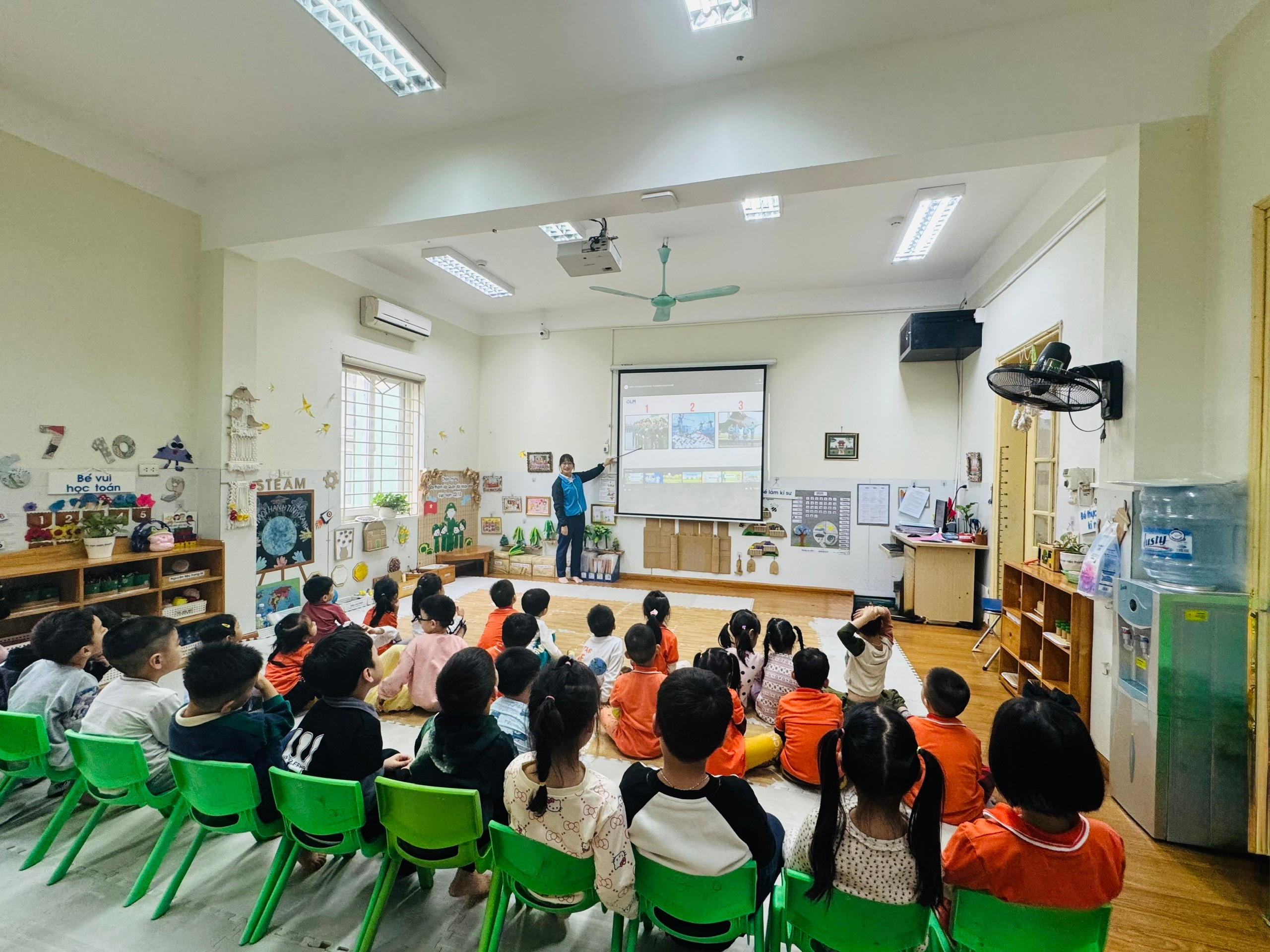 Các bạn nhỏ lớp MGL A2 đang chăm chú xem các hình ảnh chú Bộ Đội.