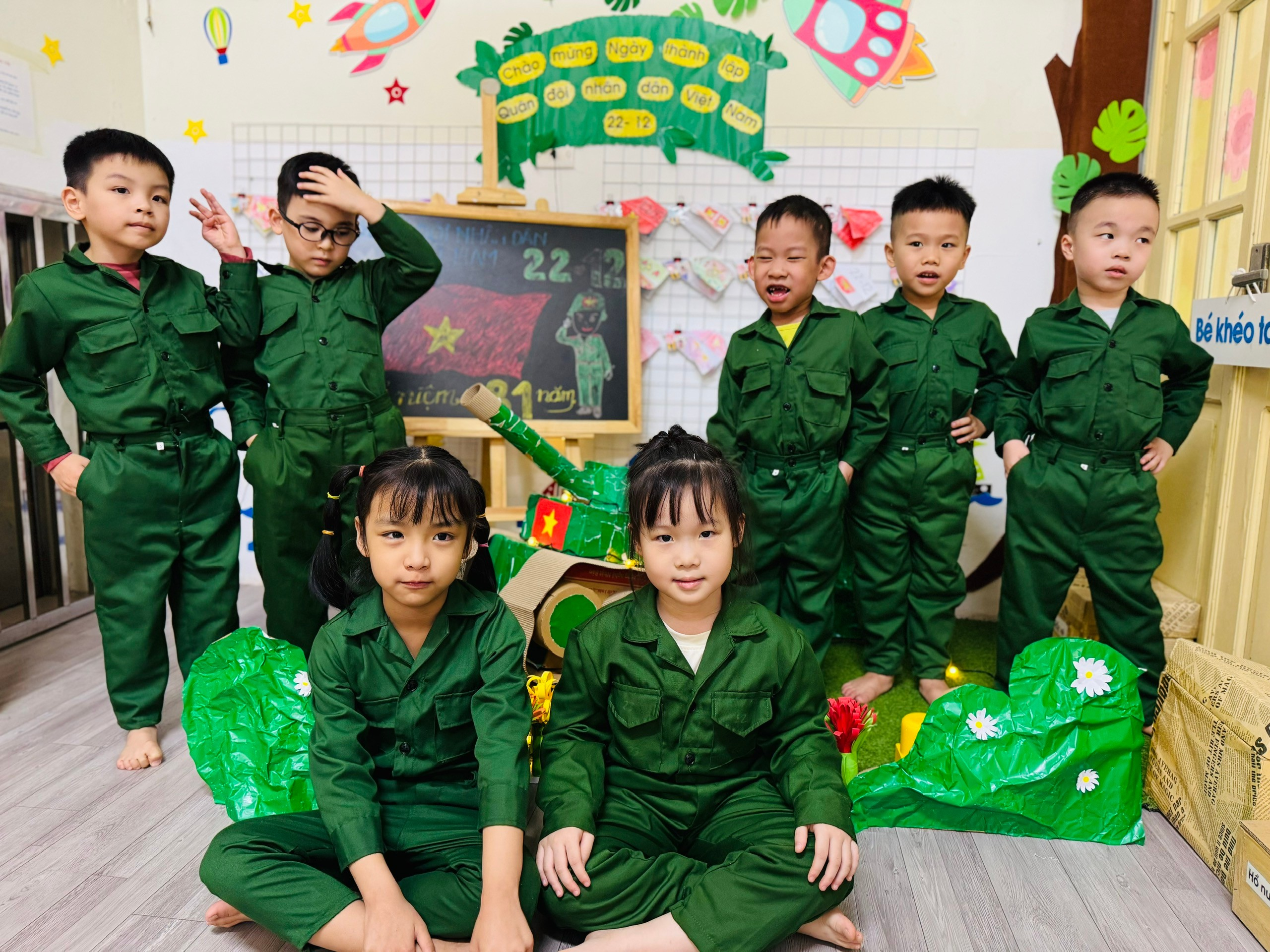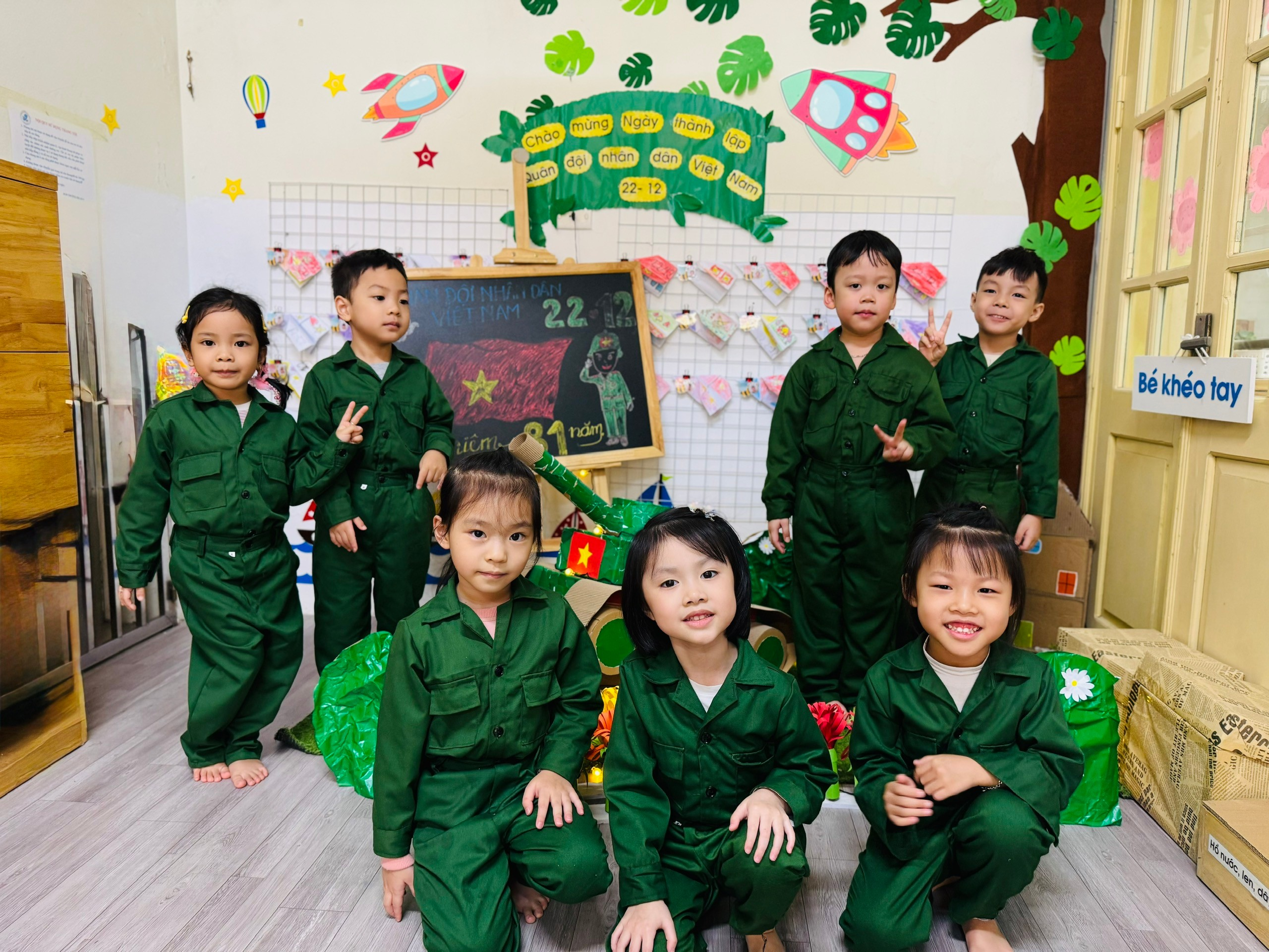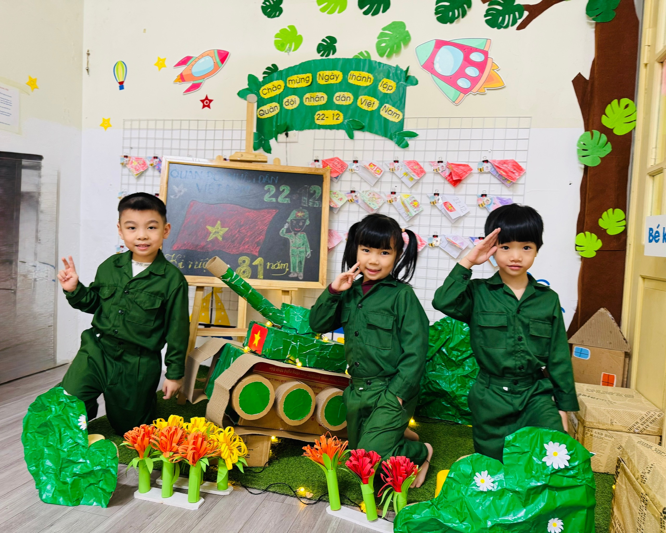 Bên cạnh đó, các bé còn được tham gia hoạt động tạo hình với chủ đề “Chú bộ đội của em”, “Bộ đội bảo vệ Tổ quốc”; hoạt động âm nhạc với những bài hát vui tươi, trong sáng ca ngợi người lính như: Cháu thương chú bộ đội, Làm chú bộ đội… Các sản phẩm tạo hình ngộ nghĩnh, đáng yêu thể hiện sự khéo léo, sáng tạo và tình cảm hồn nhiên của các con. Đặc biệt, lớp còn tổ chức hoạt động trải nghiệm đóng vai chú bộ đội, tham gia các trò chơi vận động như hành quân, vượt chướng ngại vật… giúp trẻ rèn luyện thể chất, tinh thần đoàn kết, kỷ luật và sự mạnh dạn, tự tin.