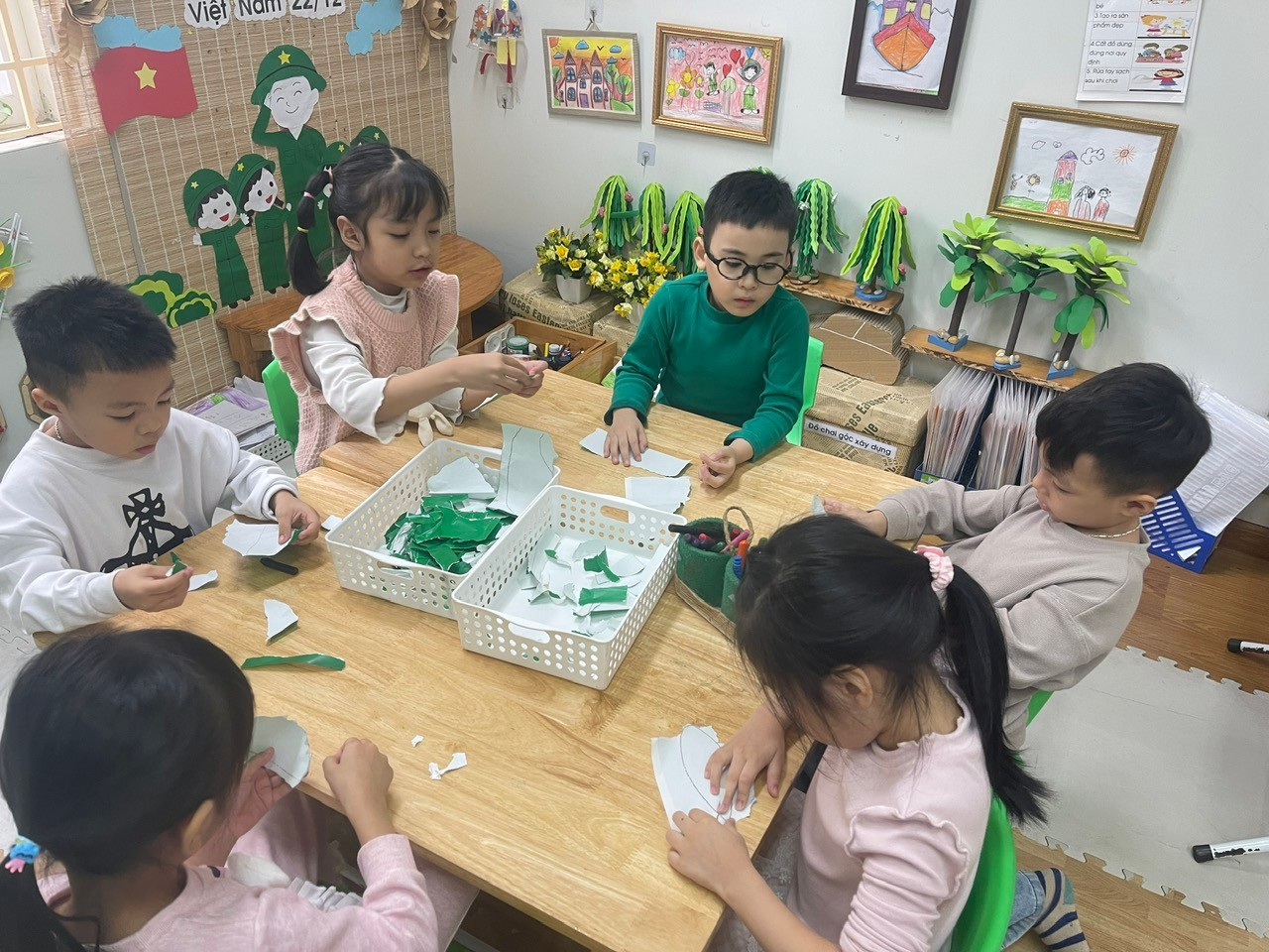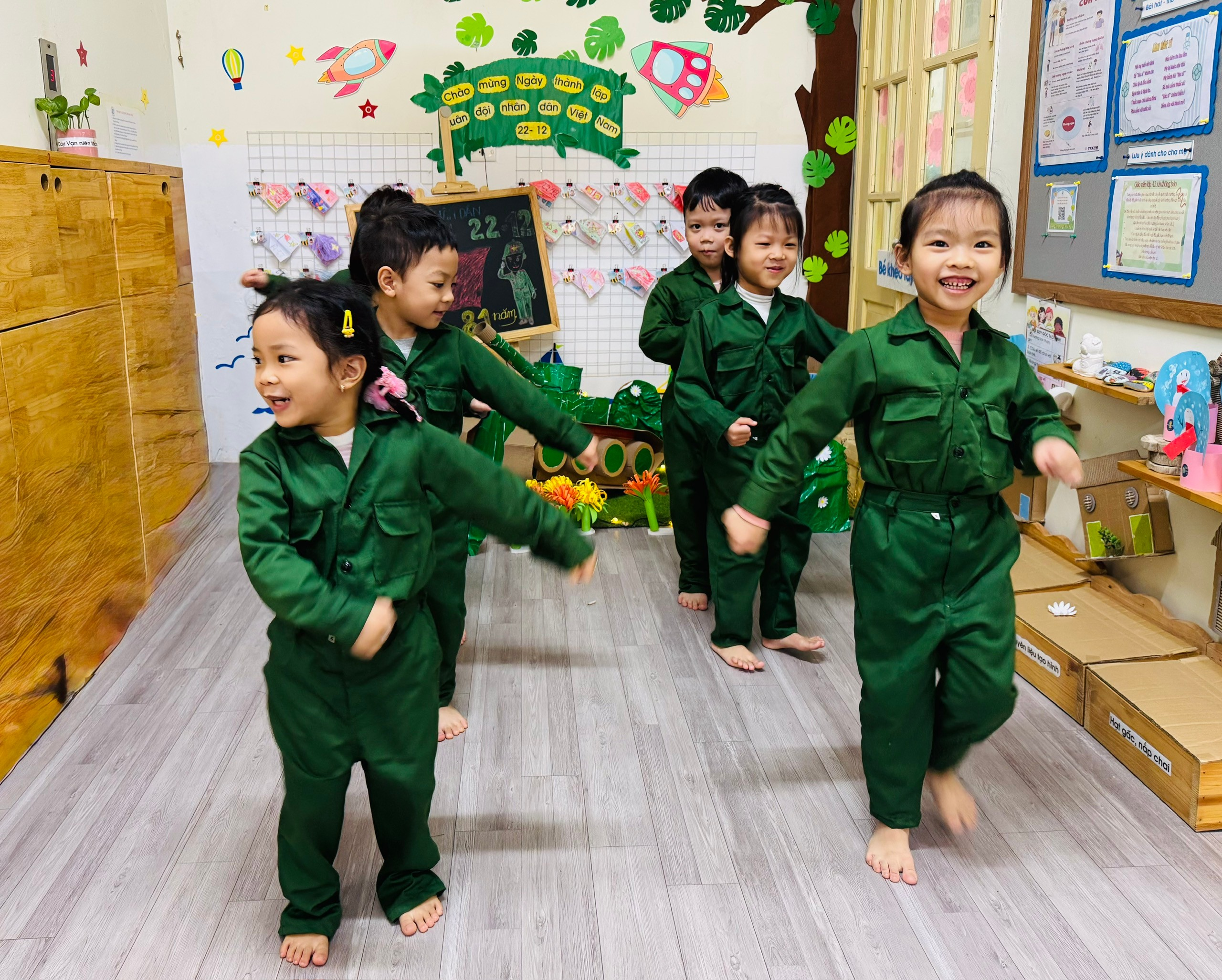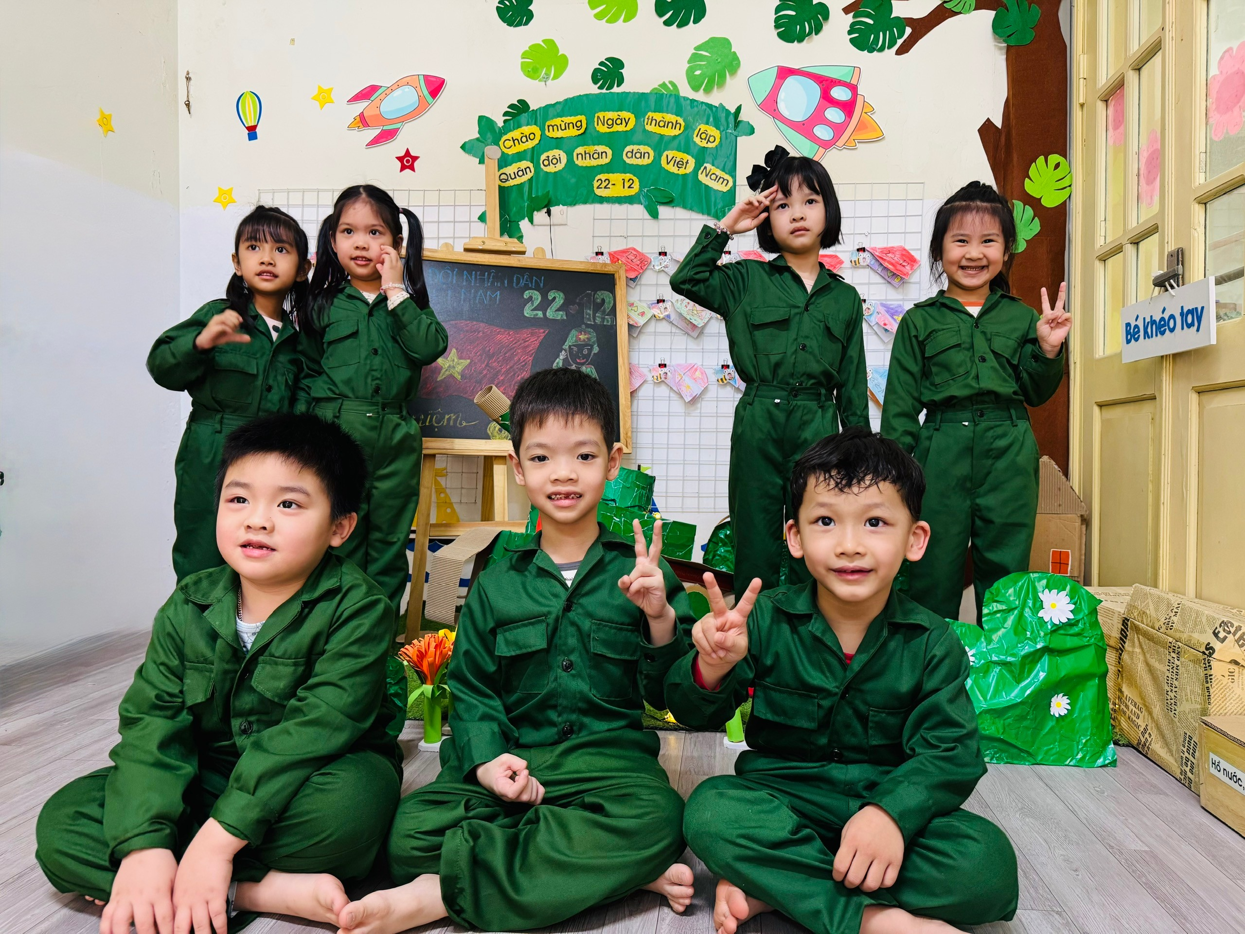 Bên cạnh đó, các bé còn được tham gia hoạt động tạo hình với chủ đề “Chú bộ đội của em”, “Bộ đội bảo vệ Tổ quốc”; hoạt động âm nhạc với những bài hát vui tươi, trong sáng ca ngợi người lính như: Cháu thương chú bộ đội, Làm chú bộ đội… Các sản phẩm tạo hình ngộ nghĩnh, đáng yêu thể hiện sự khéo léo, sáng tạo và tình cảm hồn nhiên của các con. Đặc biệt, lớp còn tổ chức hoạt động trải nghiệm đóng vai chú bộ đội, tham gia các trò chơi vận động như hành quân, vượt chướng ngại vật… giúp trẻ rèn luyện thể chất, tinh thần đoàn kết, kỷ luật và sự mạnh dạn, tự tin.
