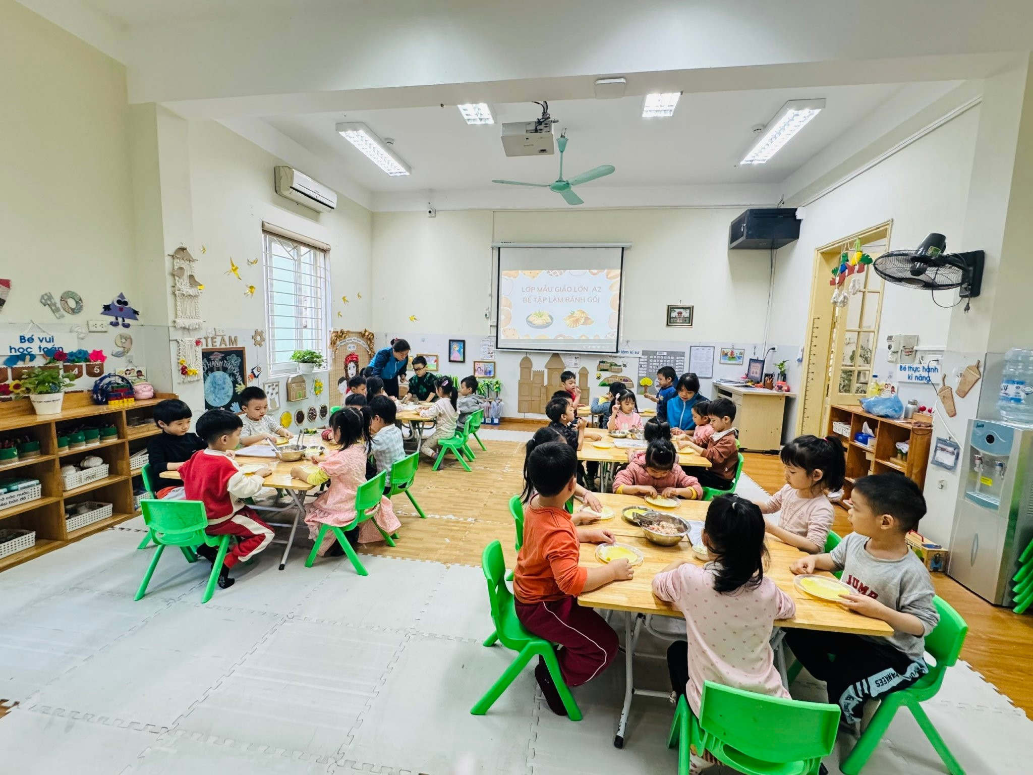 Các cô đang hướng dẫn trẻ gói bánh Gối.