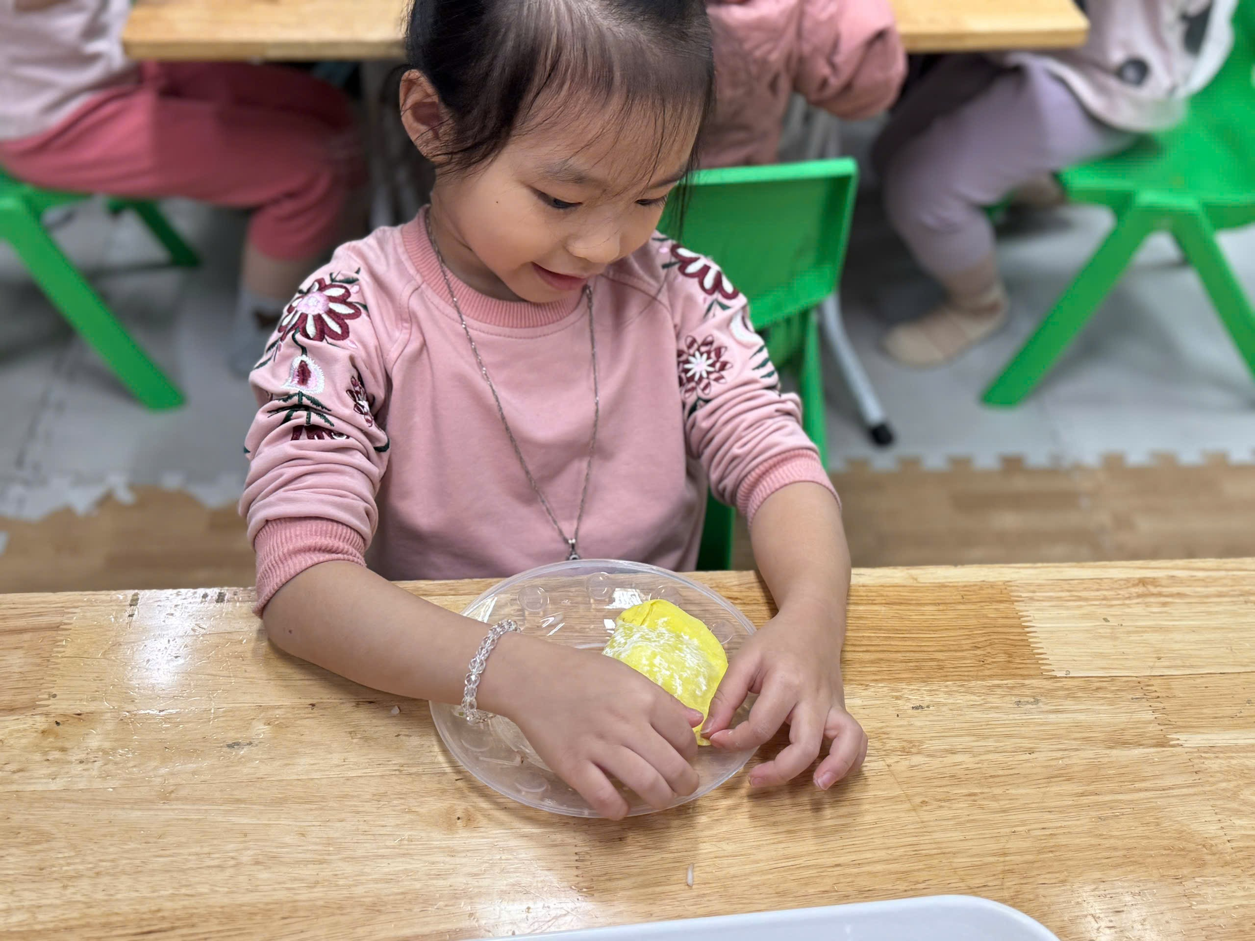 Dưới sự hướng dẫn tận tình của các cô, những đôi bàn tay nhỏ xinh và khéo léo của bé, các con bắt tay vào gói bánh. Tuy còn lúng túng, nhưng cũng đã ra hình bánh gối rồi đấy thật xinh xắn và đáng yêu.