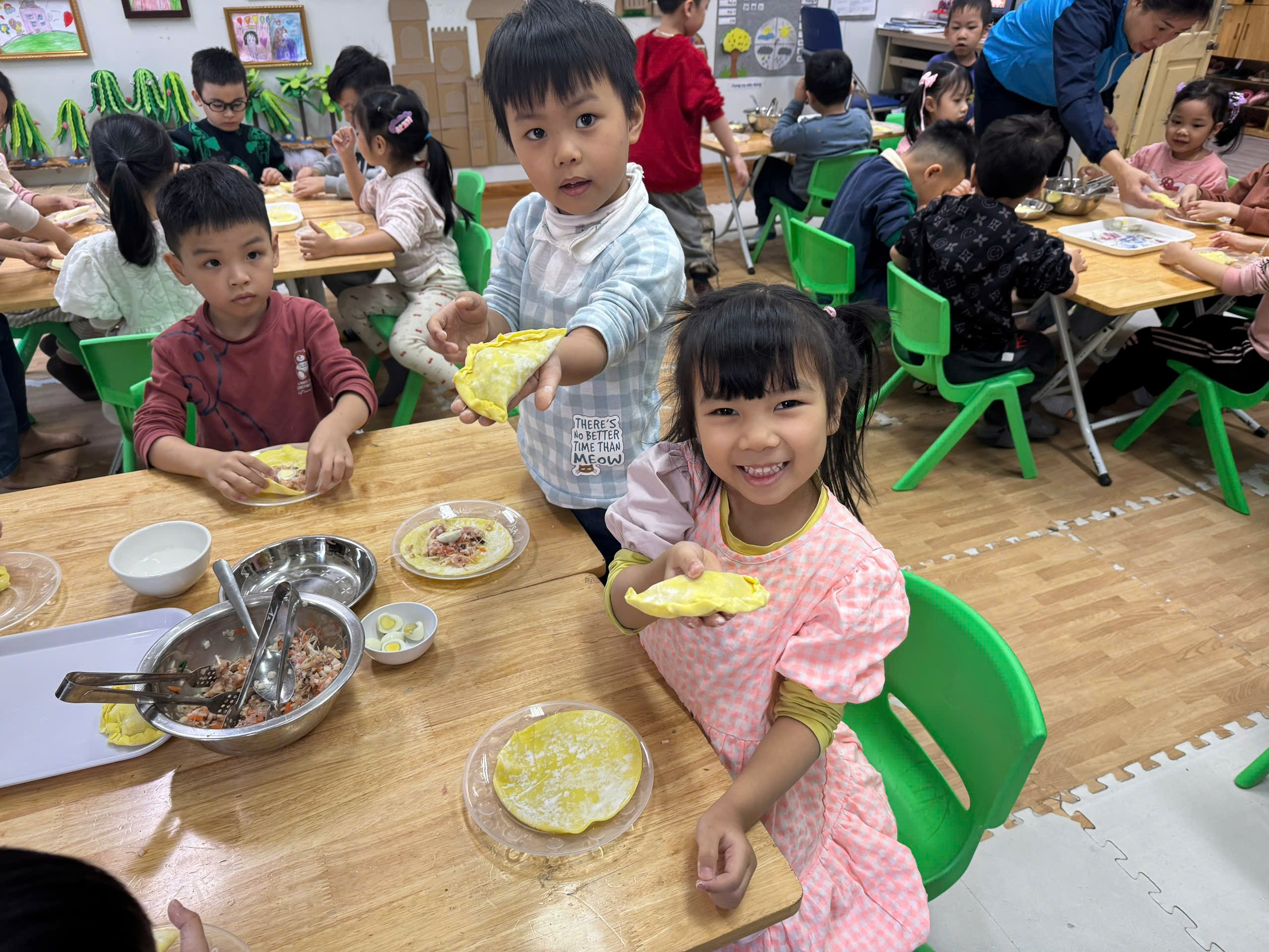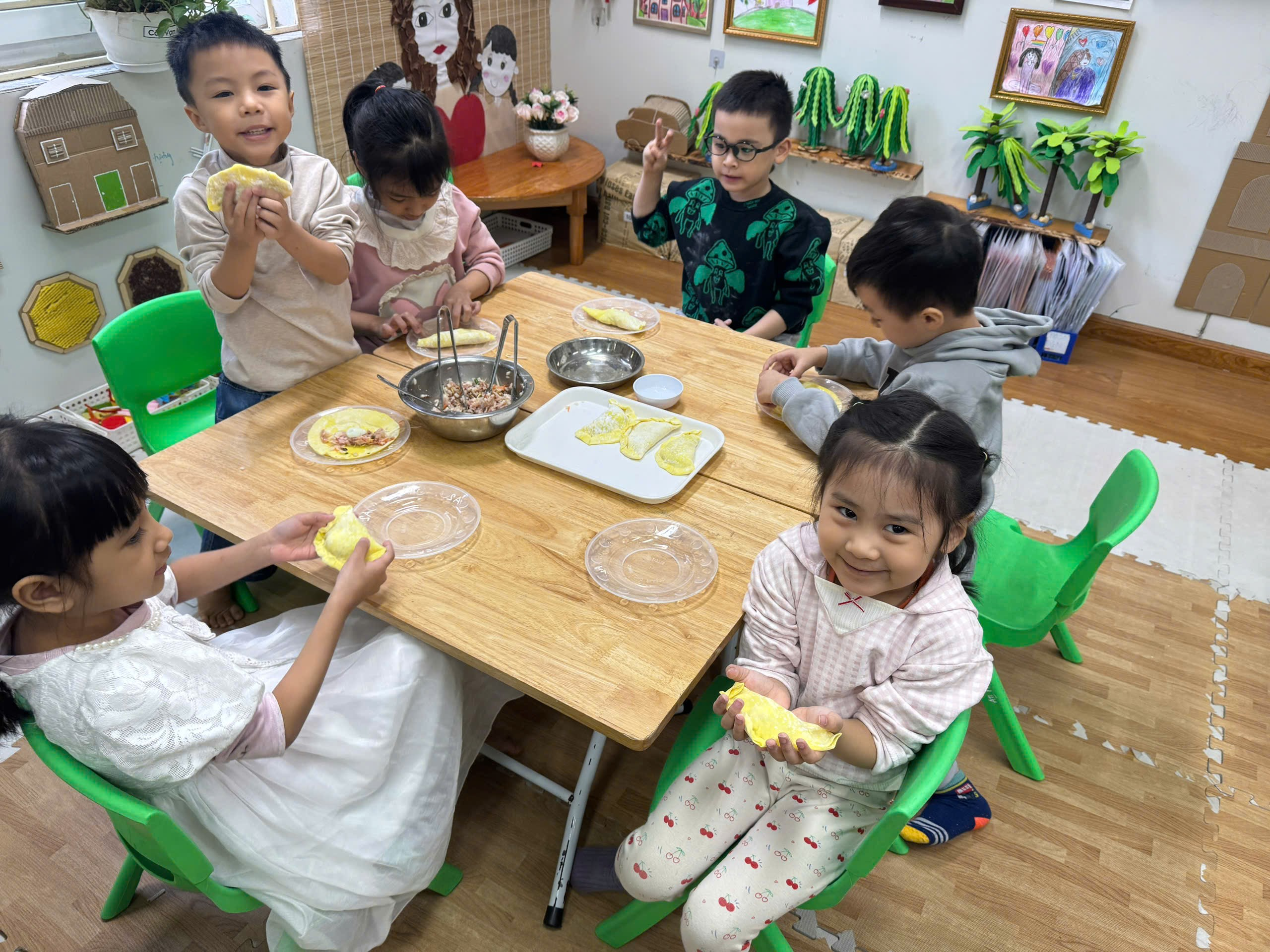 Các cô đã giúp việc rán bánh để có ngay những chiếc bánh gối màu vàng nóng hổi. Và các bé hãy cùng nhau thưởng thức những “chiếc gối” thơm ngon do tự tay mình làm thật là vui.