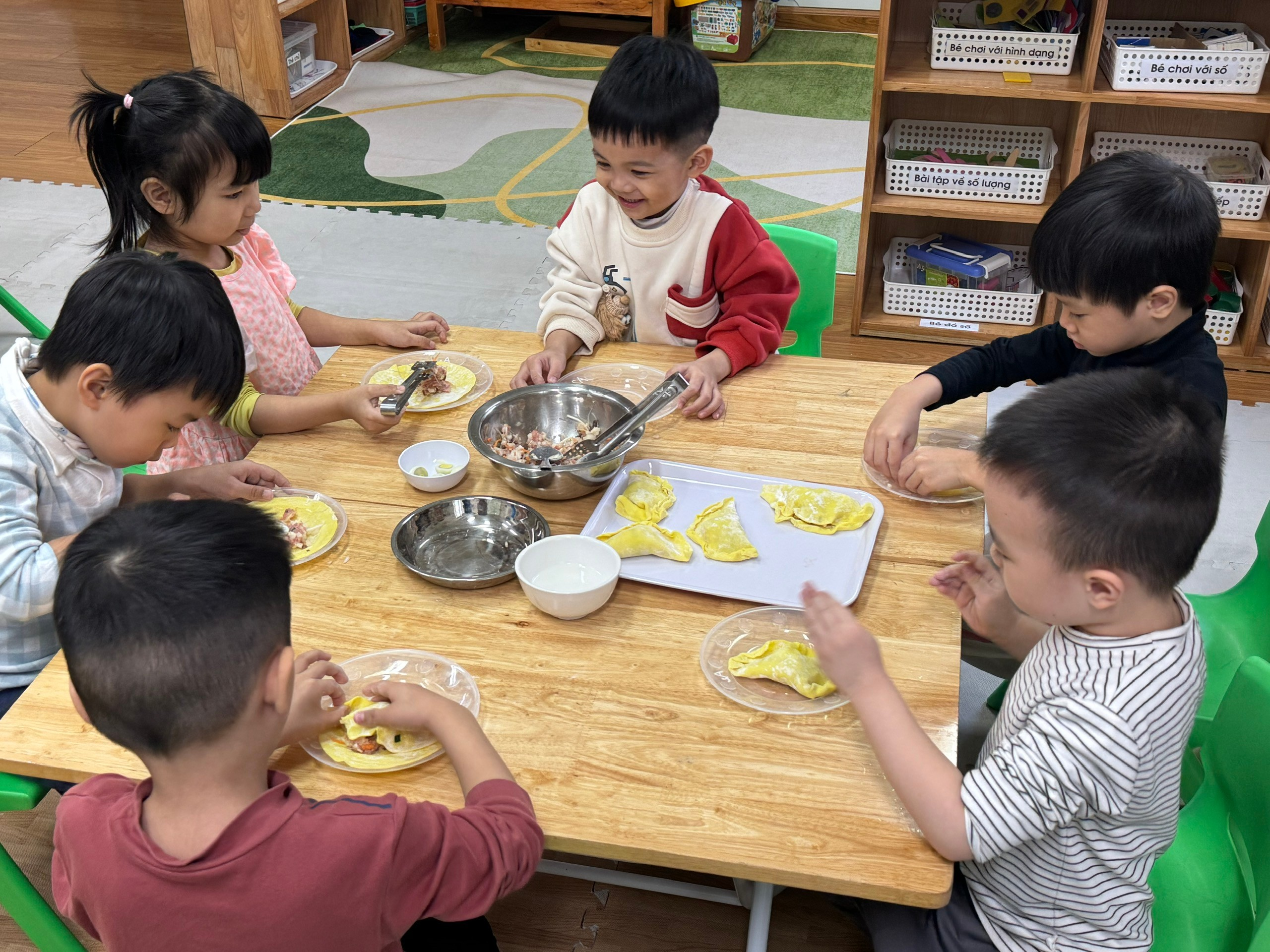 Các cô giáo hướng dẫn các bé gói sao cho thật là thật khéo: đặt vỏ bánh ra, cho nhân vào giữa, gấp chồng 2 mép vỏ bánh và thật khéo để gấp nếp sao cho nhân gọn bên trong, vuốt mép bánh tròn đều như những “chiếc gối” nhé!